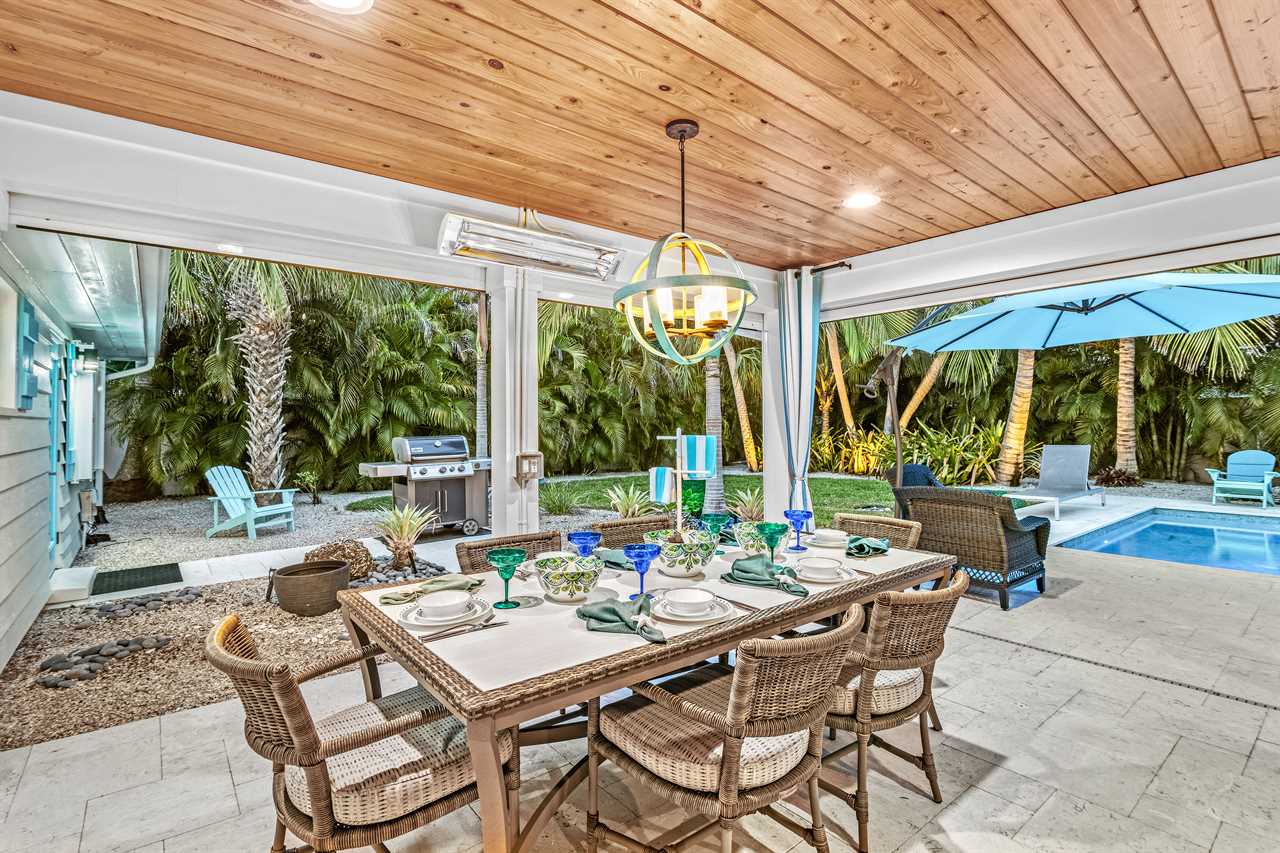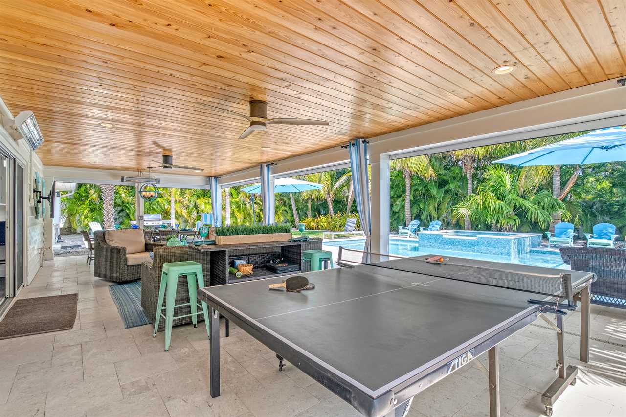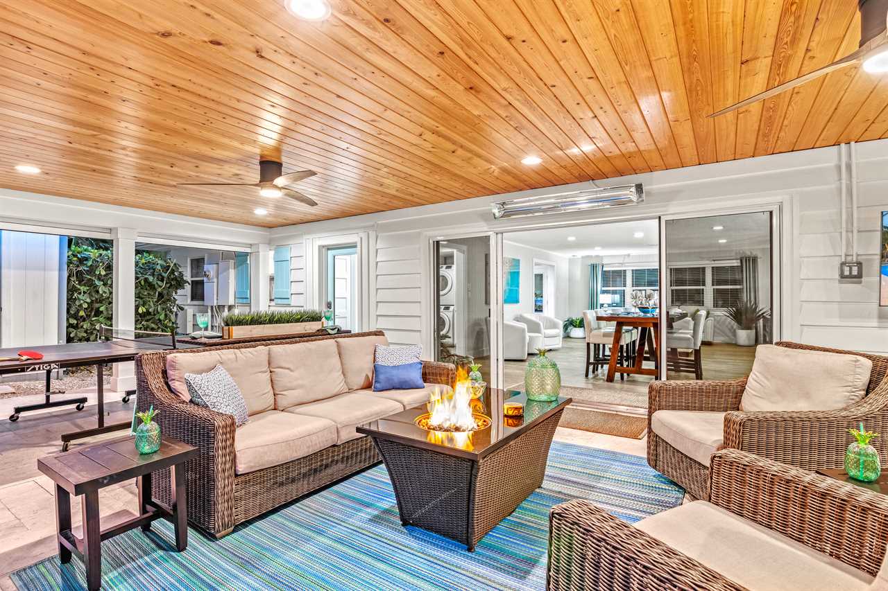 Wake up and step out to your private lanai, where the fire table crackles beside an outdoor lounge with HDTV and heaters. Start your morning with a bike ride or a quick stroll to Lido Beach. Spend afternoons kayaking or playing ping pong in the shaded patio. Grill dinner outdoors, gather under the stars, or unwind in the spa as the day melts away.