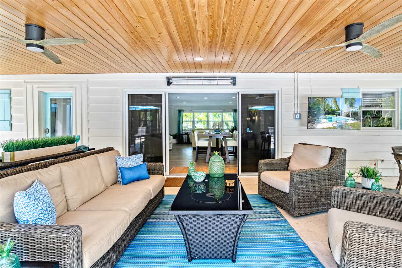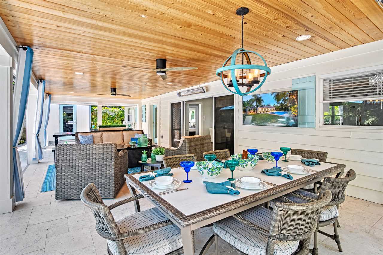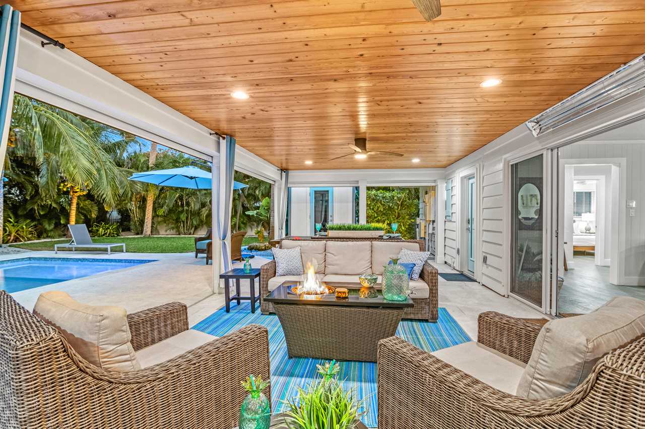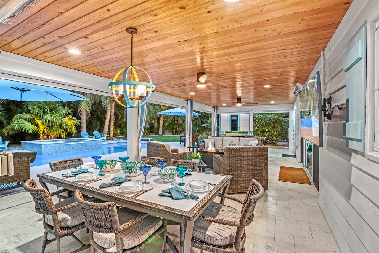 Wake up and step out to your private lanai, where the fire table crackles beside an outdoor lounge with HDTV and heaters. Start your morning with a bike ride or a quick stroll to Lido Beach. Spend afternoons kayaking or playing ping pong in the shaded patio. Grill dinner outdoors, gather under the stars, or unwind in the spa as the day melts away.