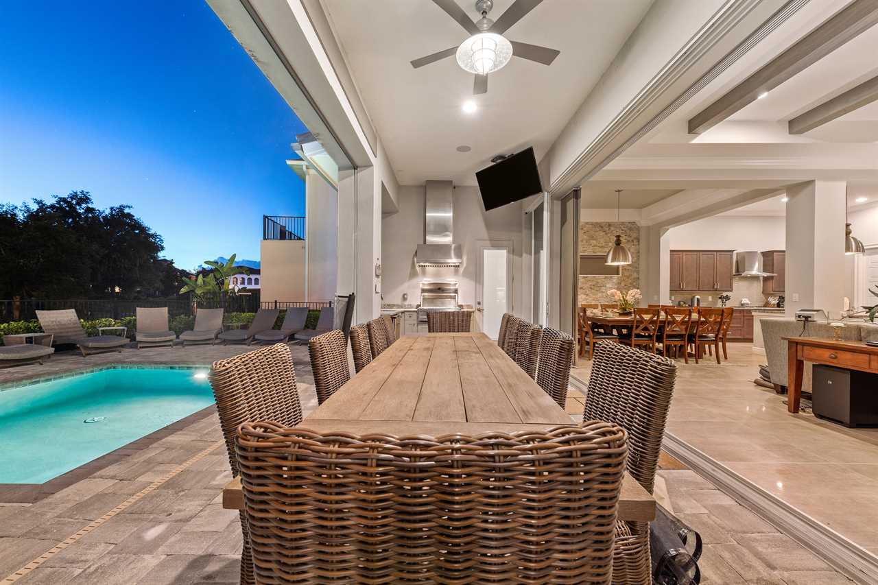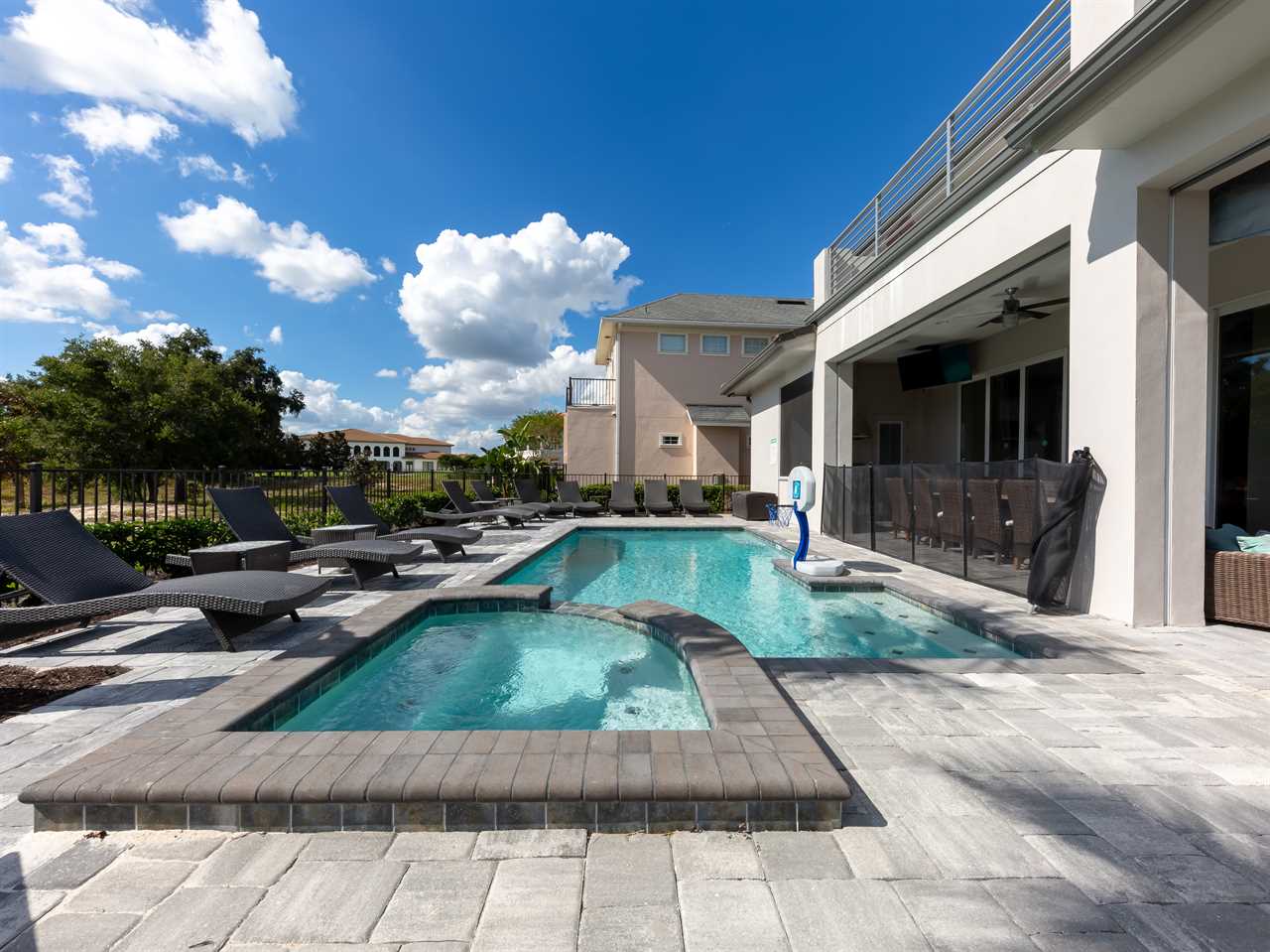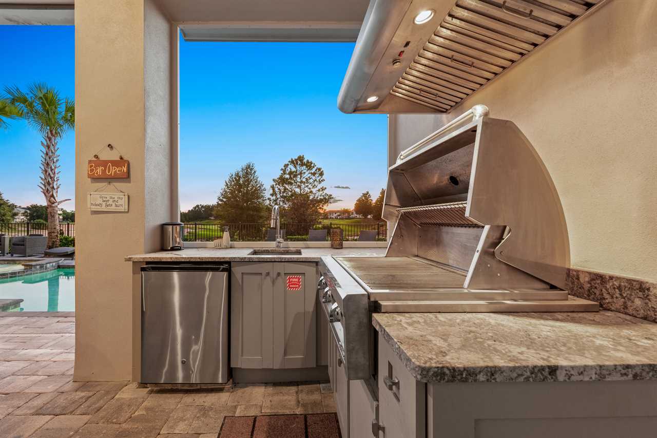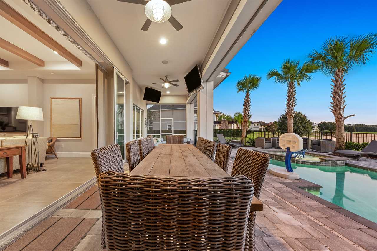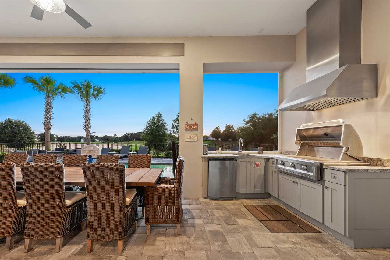 Step out and soak up the warm Florida sun. A large private pool complete with a spillover spa makes this your own private oasis. Luxury patio furniture with ample outside seating in the back making sure there is enough space for everyone. Fire up the gas-fed grill and enjoy dining al fresco under the stars. Play basketball from the pool and enjoy keeping up with your sports games and favorite movies with the 3 4K Roku TVs on the patio.