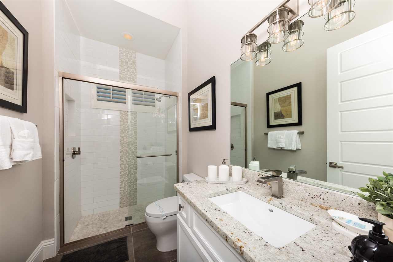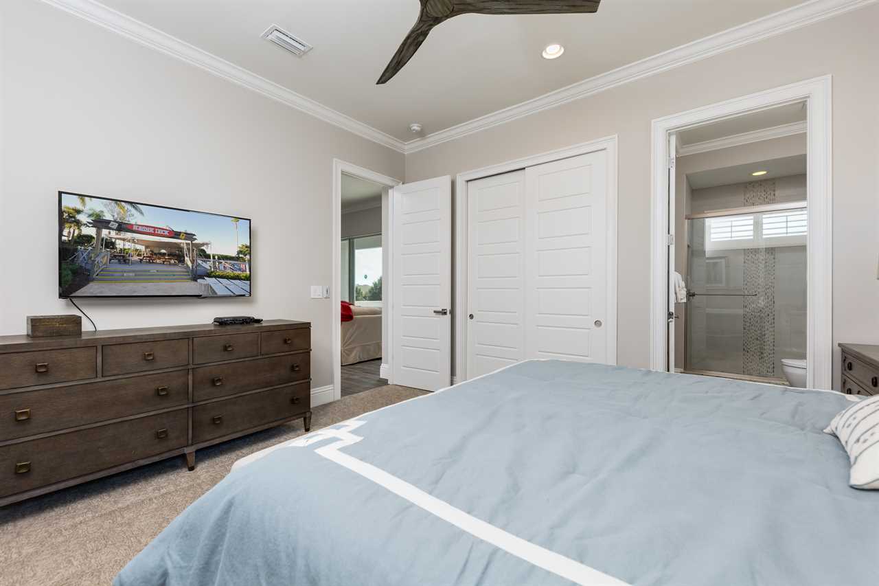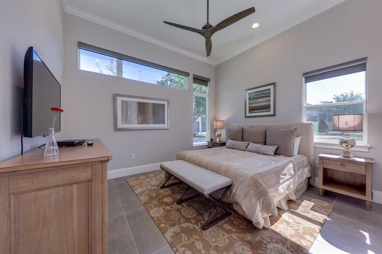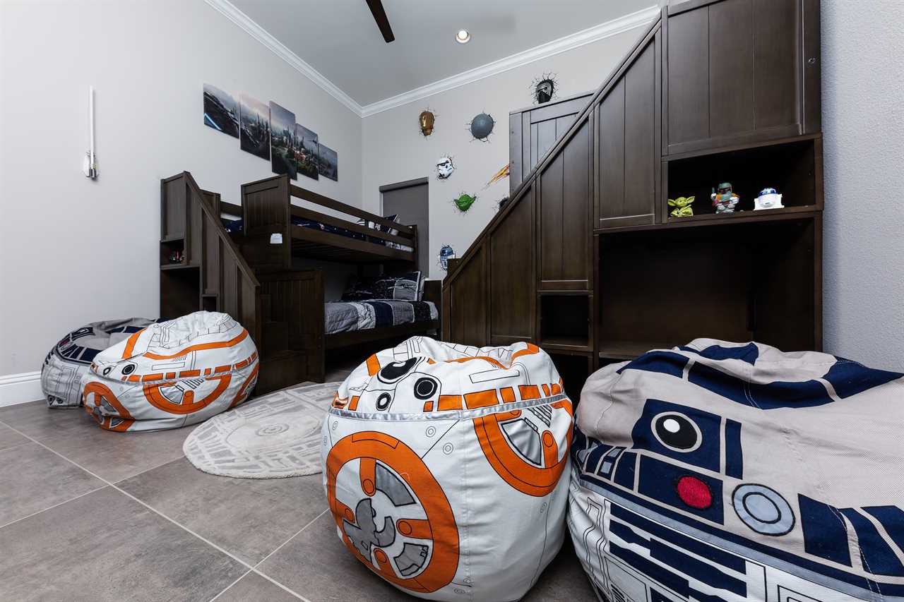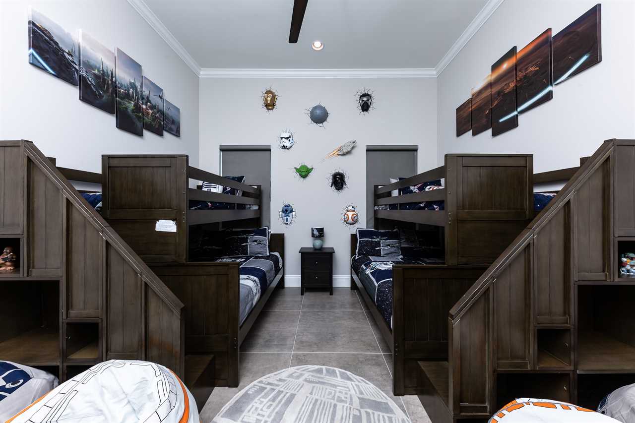 Stepping into the grand entrance of the exquisitely designed home, you will be blown away by the detail that the owner has taken when designing, and furnishing this unique villa. The open floor plan allows for amazing views of the Independence golf course from the front entrance, to the large wall of sliding glass doors that lead you back to the private pool area. The home was furnished with no expense spared. There are large airplane blade ceiling fans on the top and bottom-living areas. Plush sofas offer ample seating that surrounds the large 83-inch 4K Smart TV in the living area equipped with 9.2 surround sound for a home theater feeling. The massive kitchen is a chef's dream with an industrial size fridge, double ovens, double dishwasher, beautiful granite countertops, and state of the art appliances. For guests that need their daily caffeine, there's a Nespresso machine (Breville Model if you would like to bring your own pods) and a regular coffee machine available. The ground floor master suite has exceeded any standard set as it has a large master shower featuring rain shower heads and a large soaking tub. Two other master suites are located on the ground floor both with en suite bathrooms. The kids will love the familiar space theme in one of the downstairs suites.
