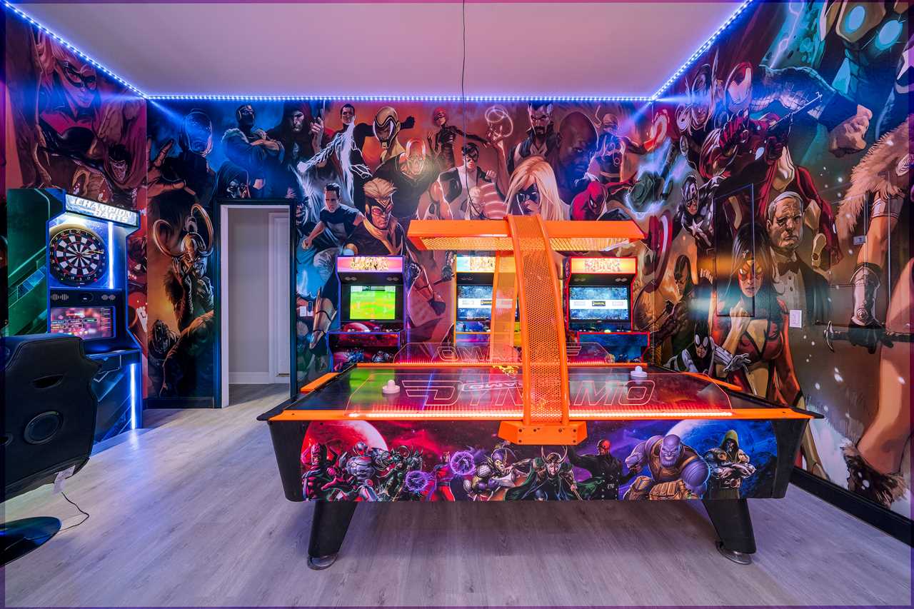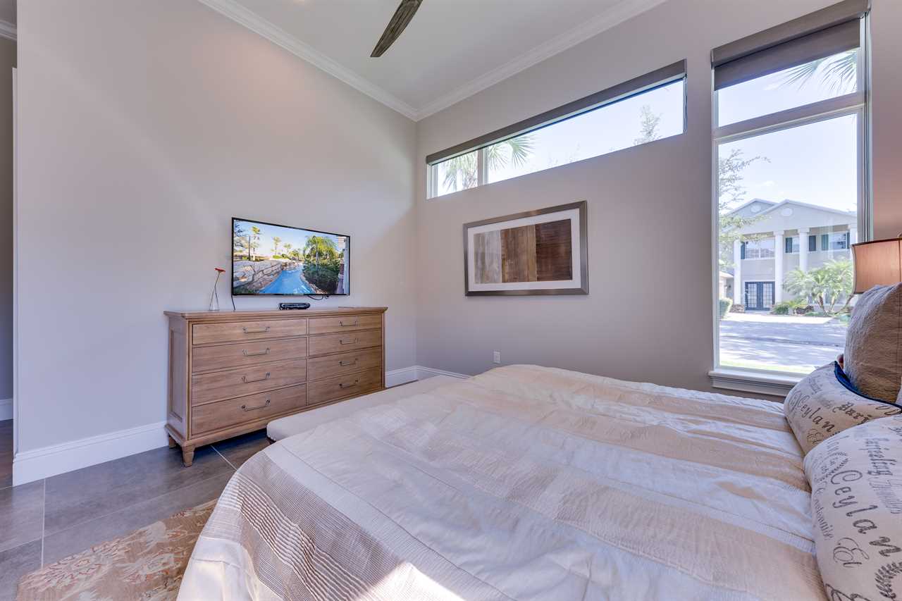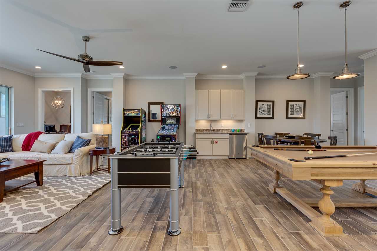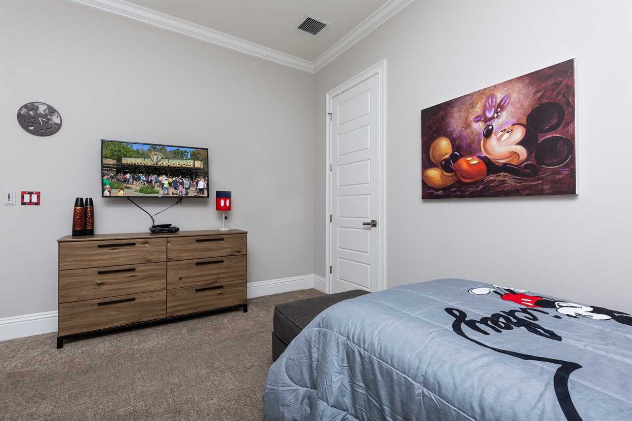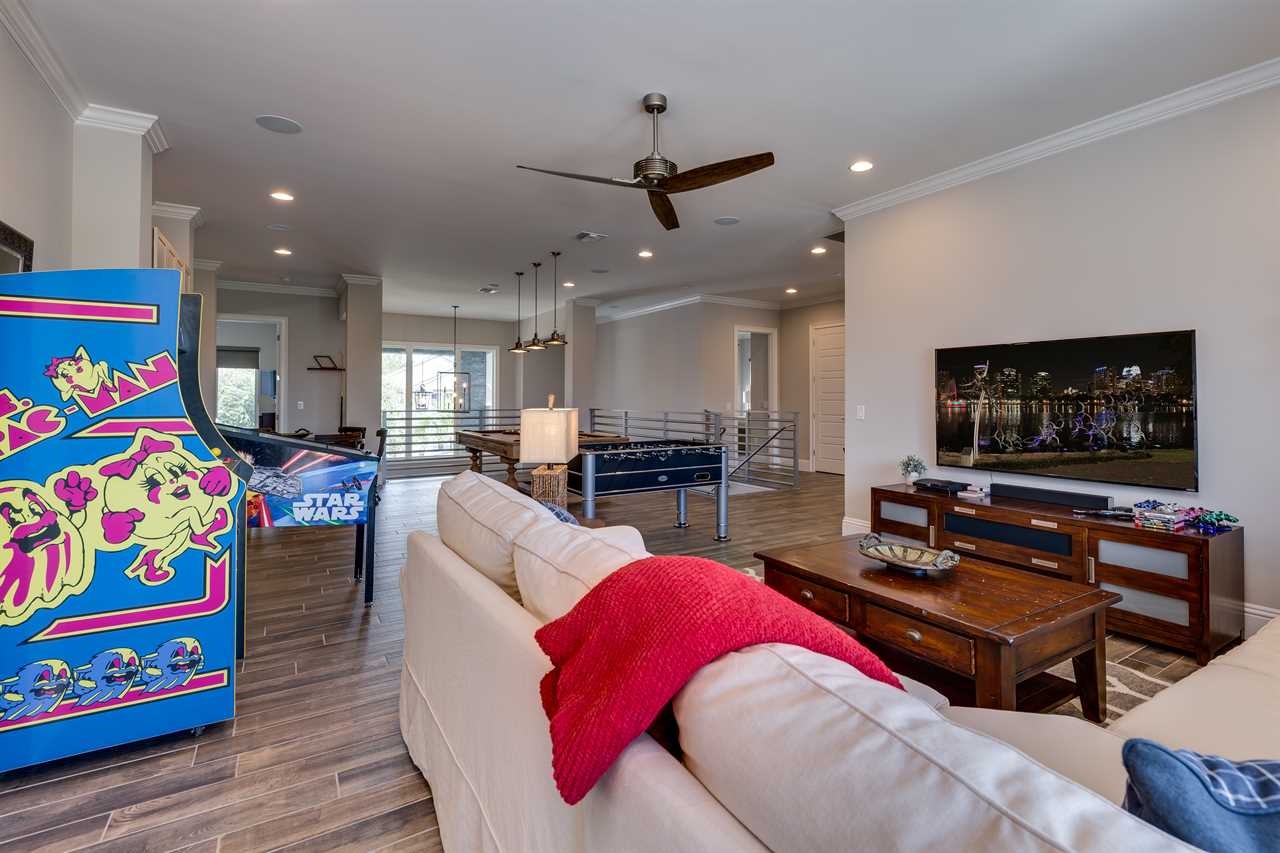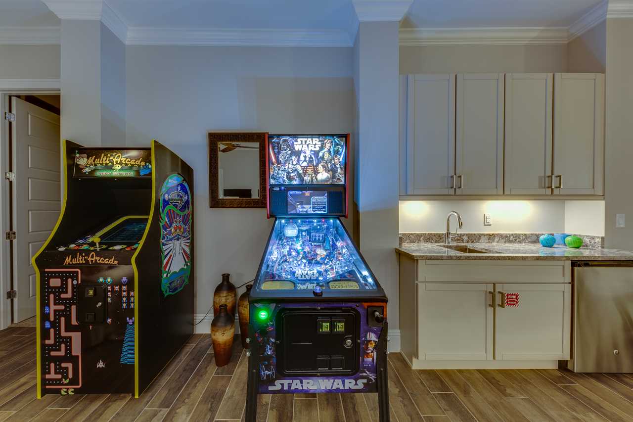 The second floor is perfect for entertaining with a large poker table, custom-designed slate pool table, wet bar with beverage cooler, and large sectional sofa with a large 70-inch 4K Smart TV. For gaming options, the loft also has a Star Wars pinball machine, 60 game multi-arcade, PS3 with 4 controllers (the following games are available to play: Raymond Legends, DuckTales, SEGA Mega Drive: Ultimate Collections), NES Classic, and foosball. A large patio with a table and outside seating gives a great view of the pristine course behind the home. Two other king master suites with en suite bath, one queen room, a room with two twin beds features everyone's favorite mouse, and a room with a full-size bed. All of the bedrooms have Smart TVs, en suite bathrooms, and come complete with blackout roller shades perfect for the bright Florida sun.