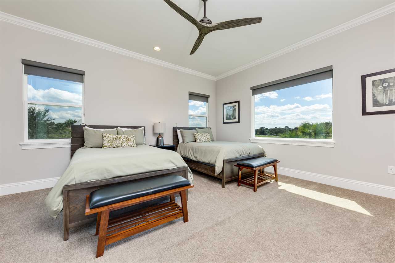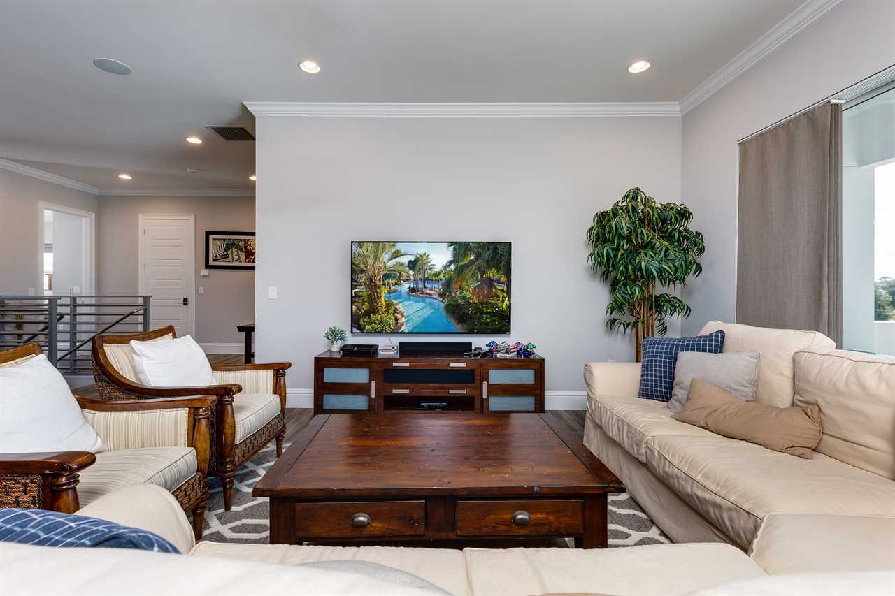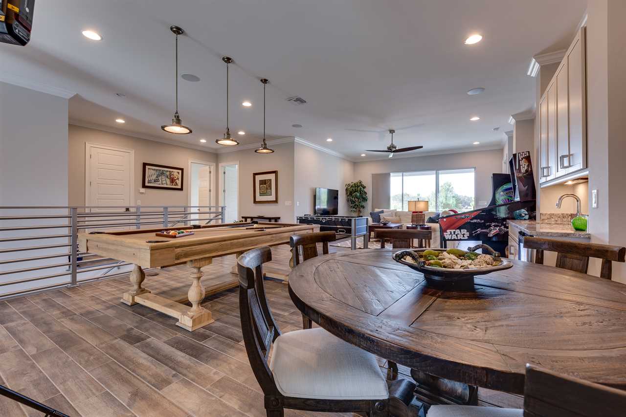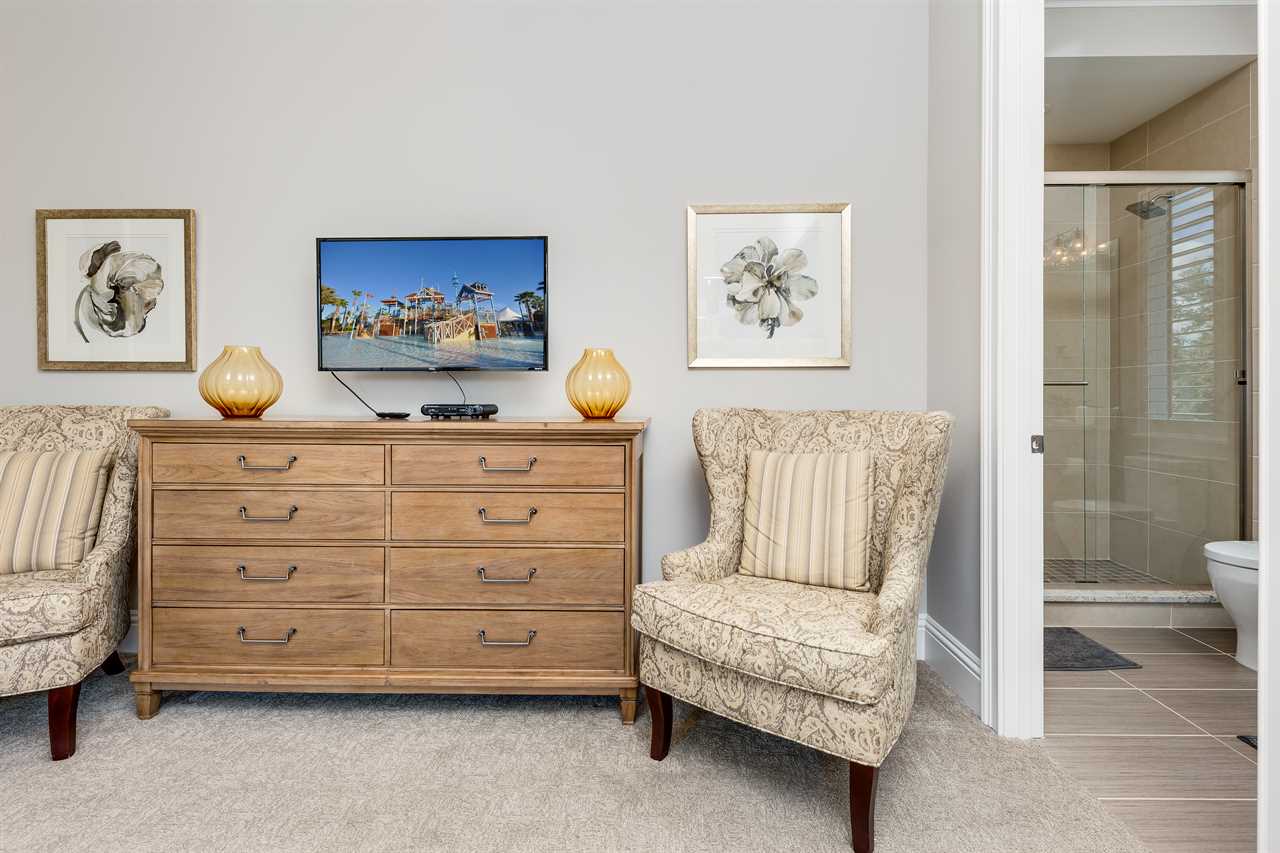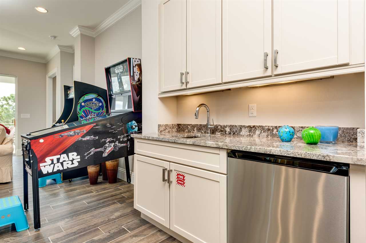 The second floor is perfect for entertaining with a large poker table, custom-designed slate pool table, wet bar with beverage cooler, and large sectional sofa with a large 70-inch 4K Smart TV. For gaming options, the loft also has a Star Wars pinball machine, 60 game multi-arcade, PS3 with 4 controllers (the following games are available to play: Raymond Legends, DuckTales, SEGA Mega Drive: Ultimate Collections), NES Classic, and foosball. A large patio with a table and outside seating gives a great view of the pristine course behind the home. Two other king master suites with en suite bath, one queen room, a room with two twin beds features everyone's favorite mouse, and a room with a full-size bed. All of the bedrooms have Smart TVs, en suite bathrooms, and come complete with blackout roller shades perfect for the bright Florida sun.