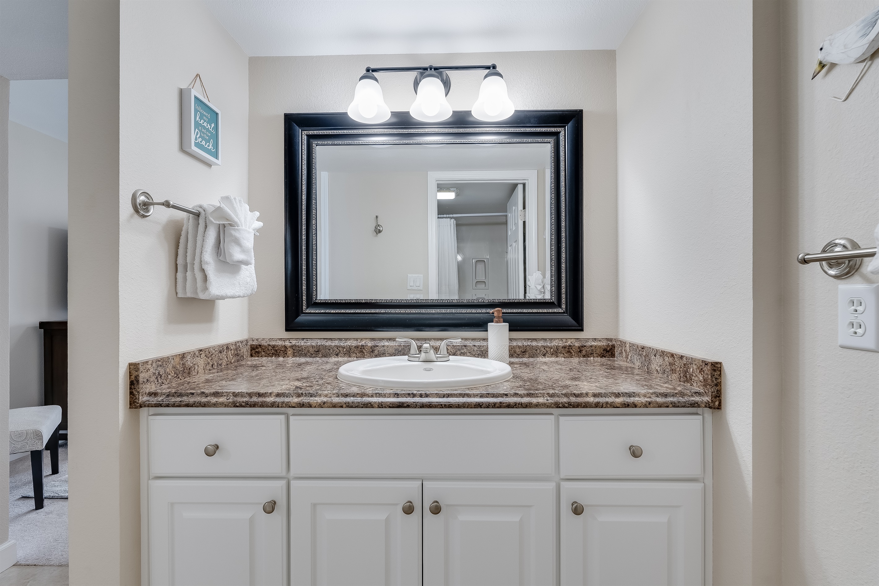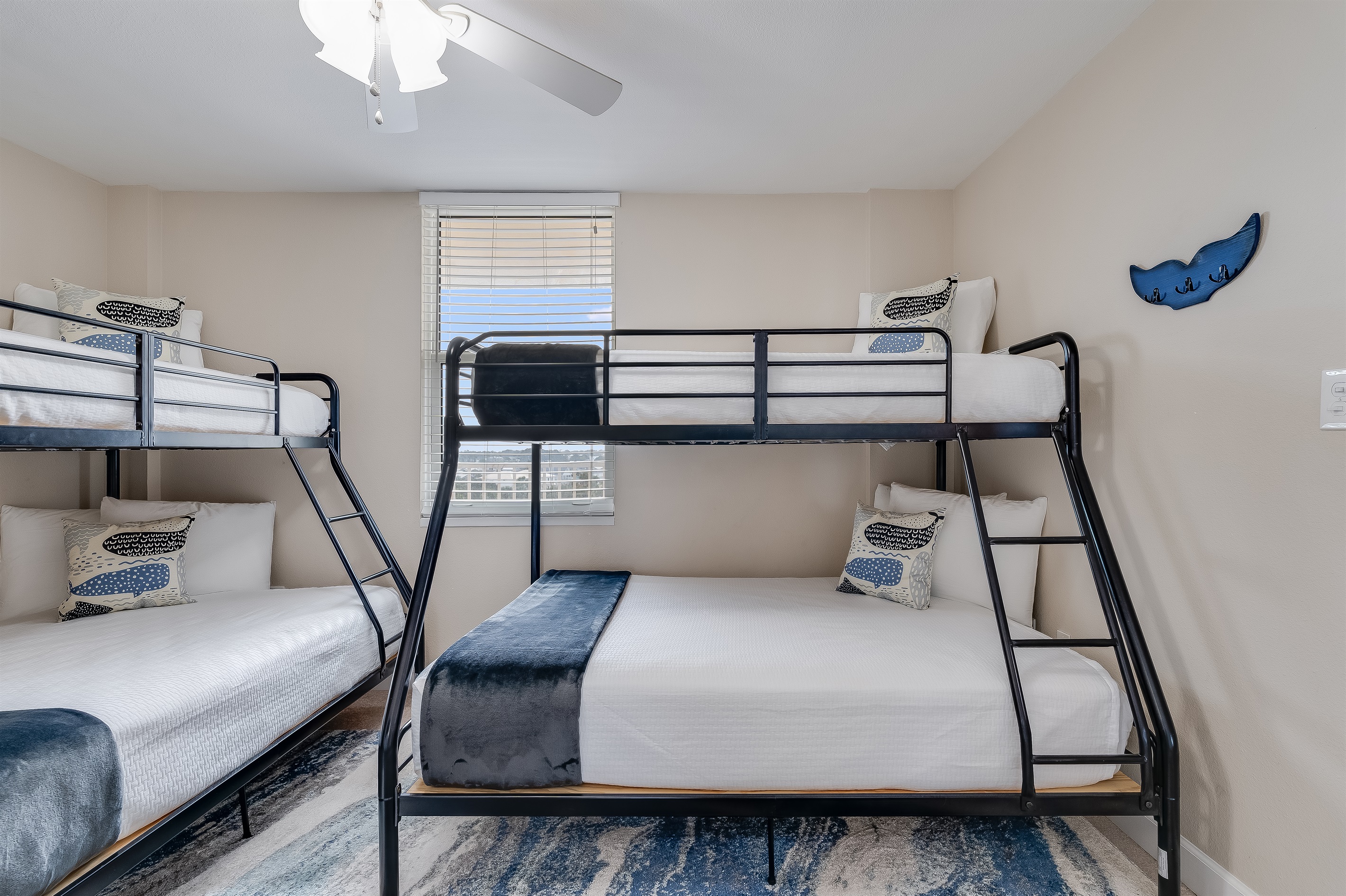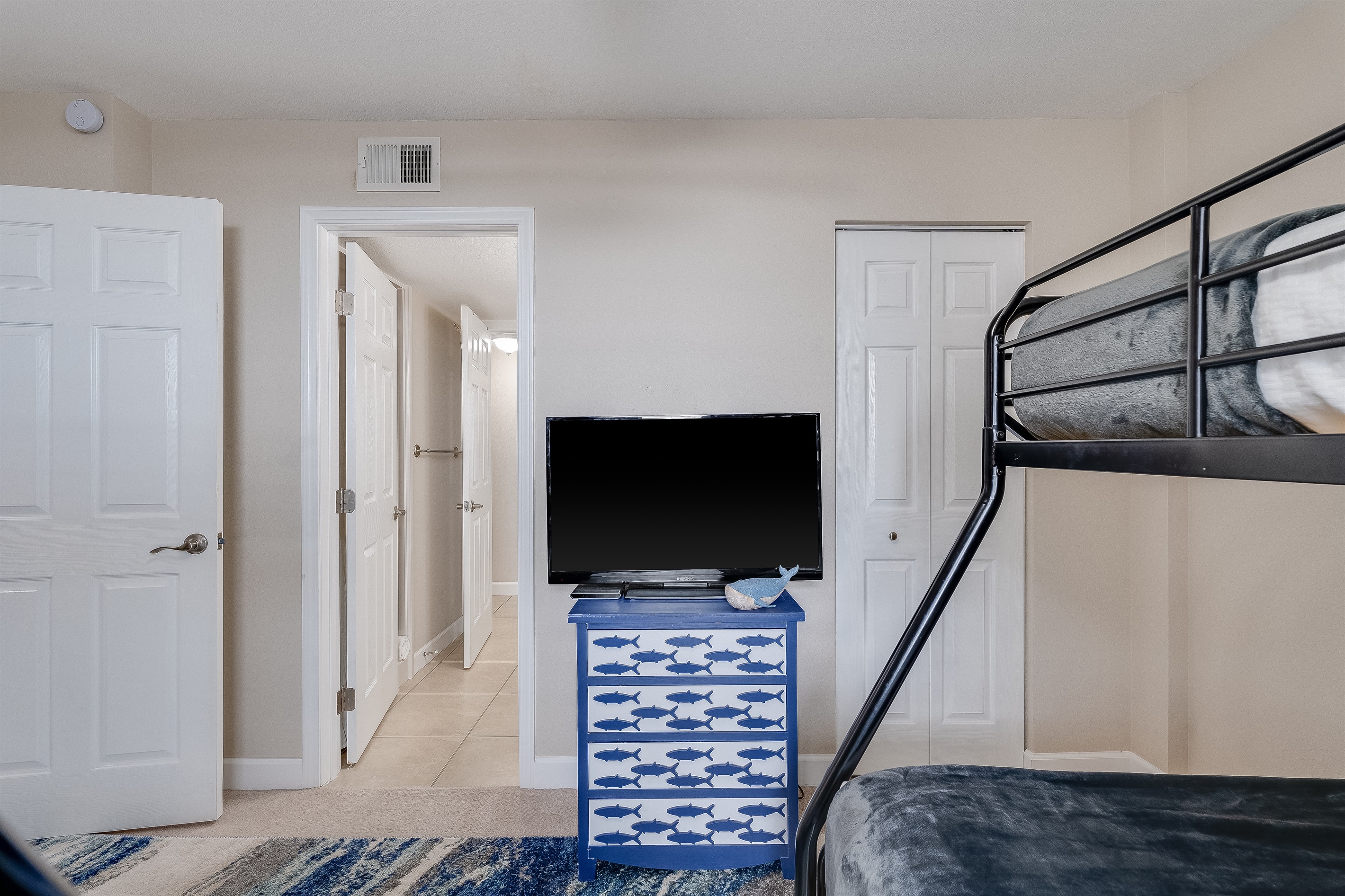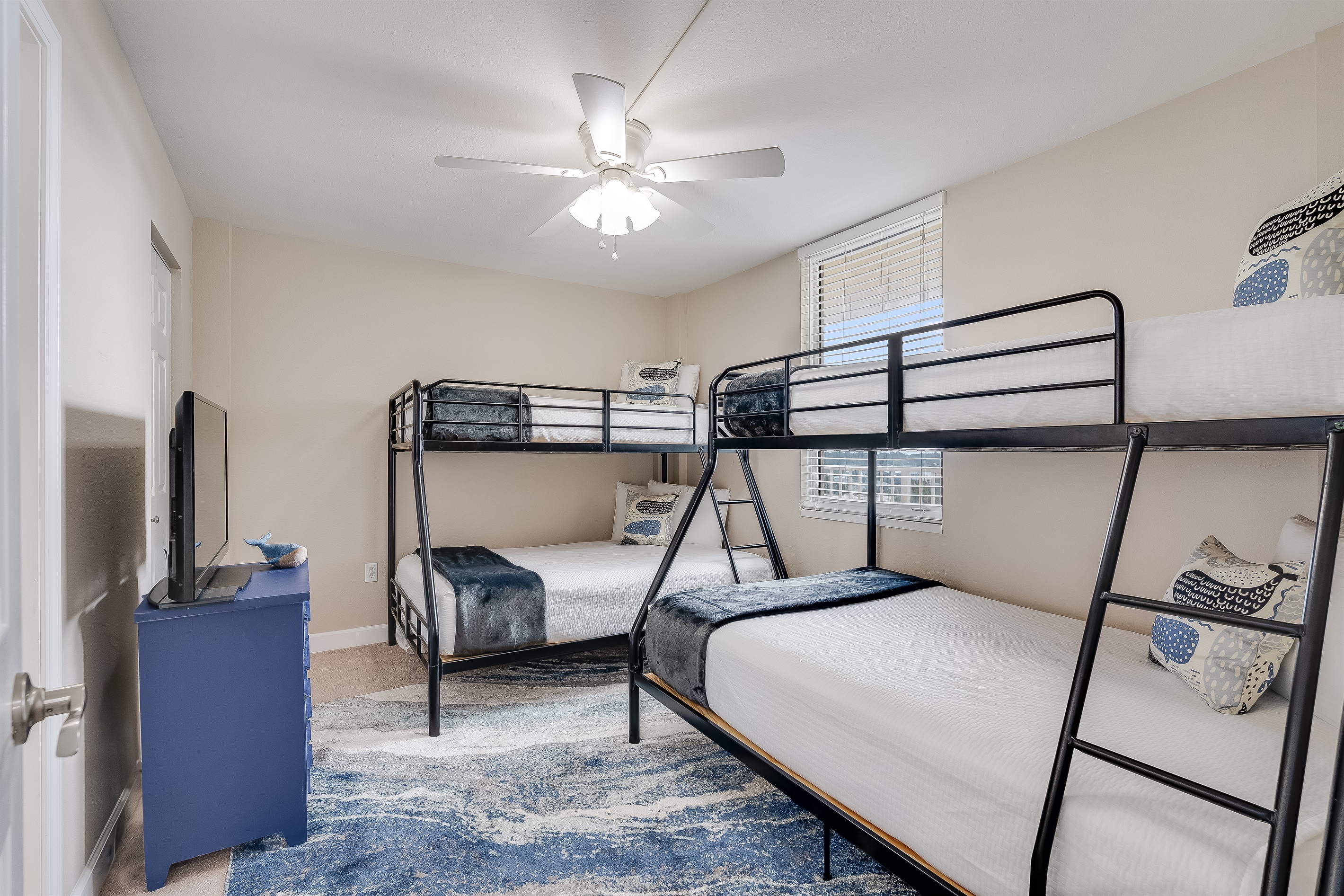 The master bedroom has a king sized bed, nightstands, full dresser and television. Full bathroom offers separate vanity. The large guest bedroom has two sets of twin over full bunk beds, dresser, and smart tv. Adjoining bathroom also opens into hallway for easy access. Owners provide beach chairs and umbrella.