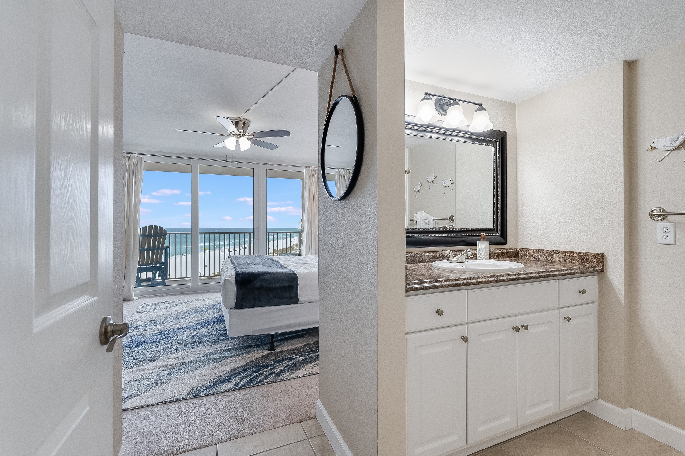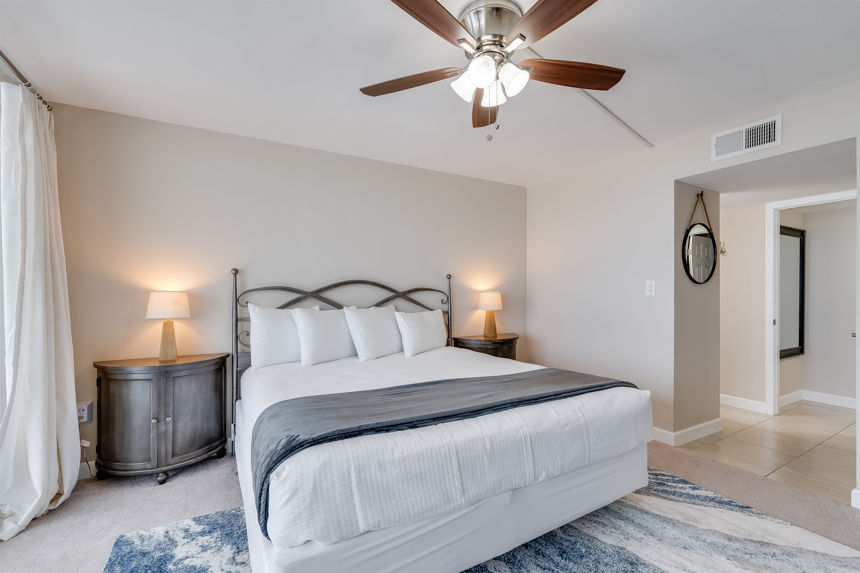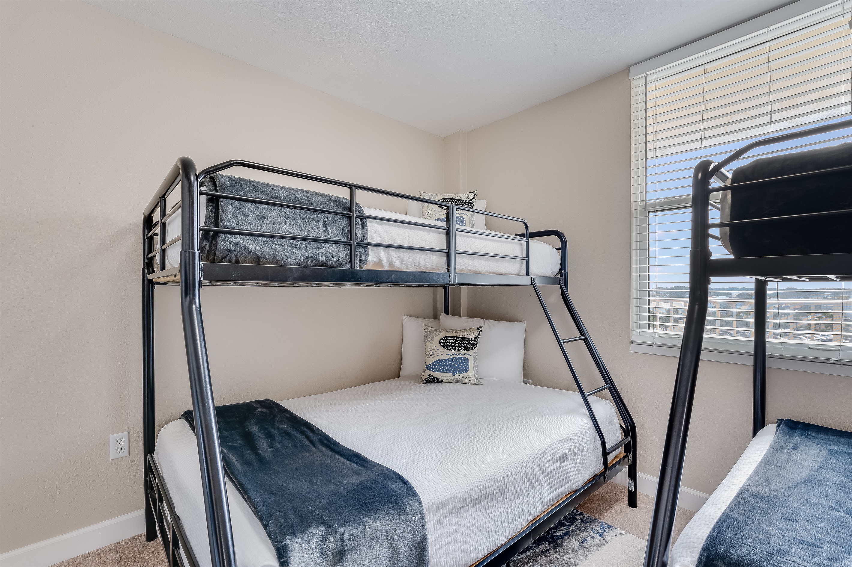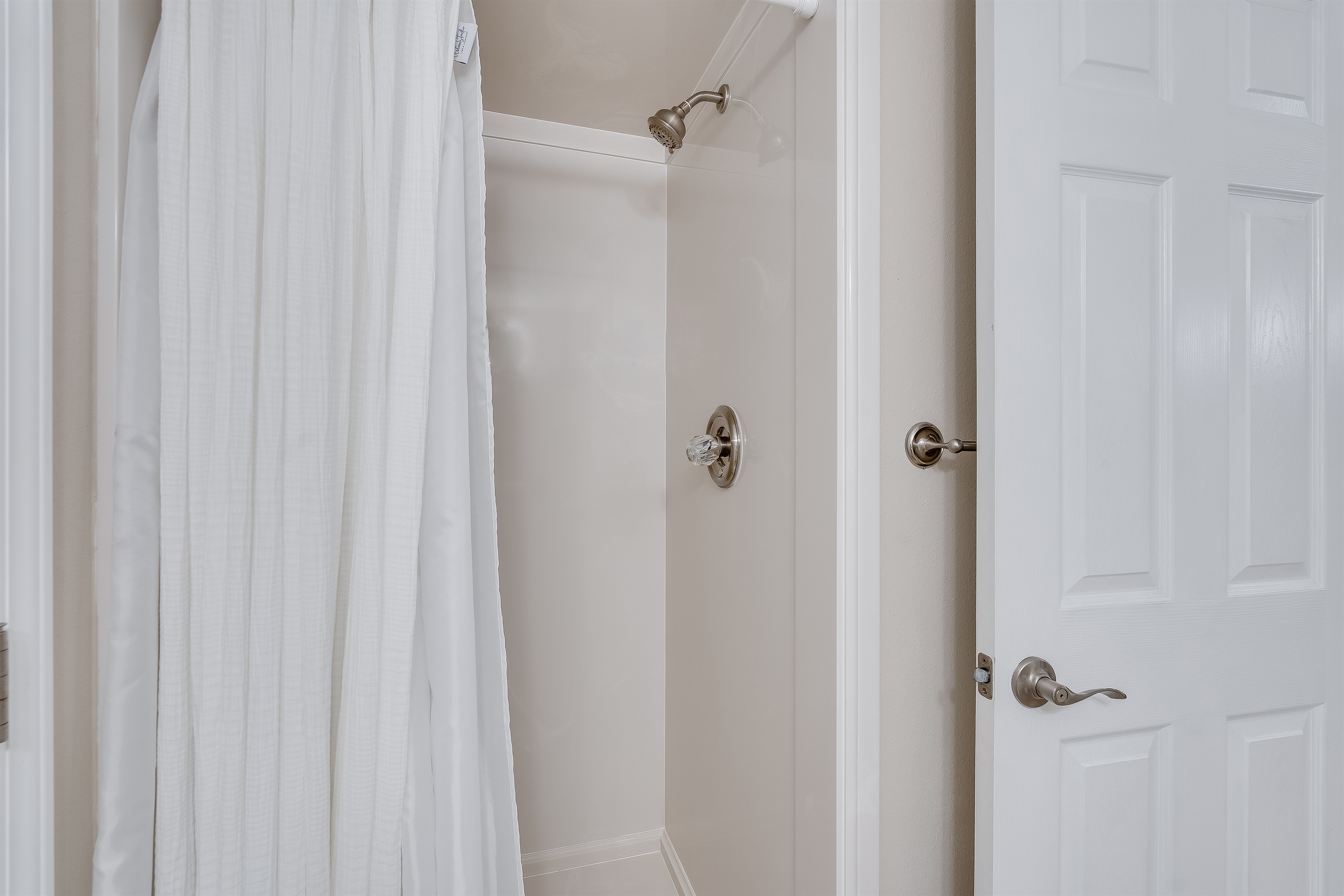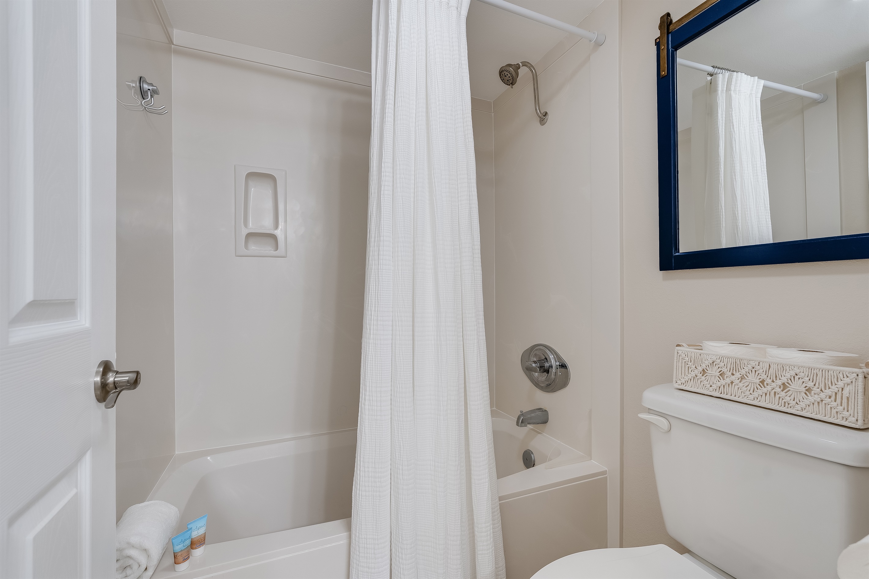 The master bedroom has a king sized bed, nightstands, full dresser and television. Full bathroom offers separate vanity. The large guest bedroom has two sets of twin over full bunk beds, dresser, and smart tv. Adjoining bathroom also opens into hallway for easy access. Owners provide beach chairs and umbrella.