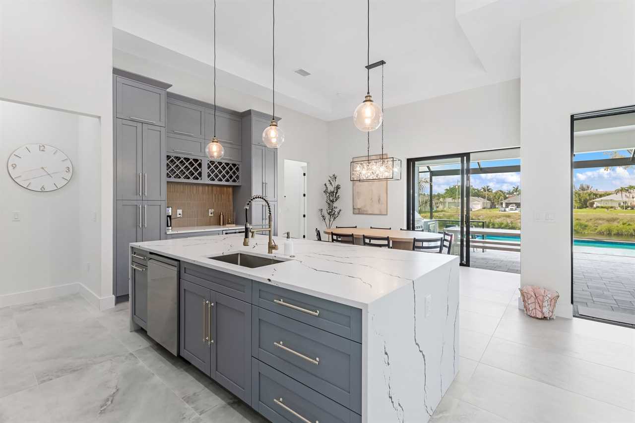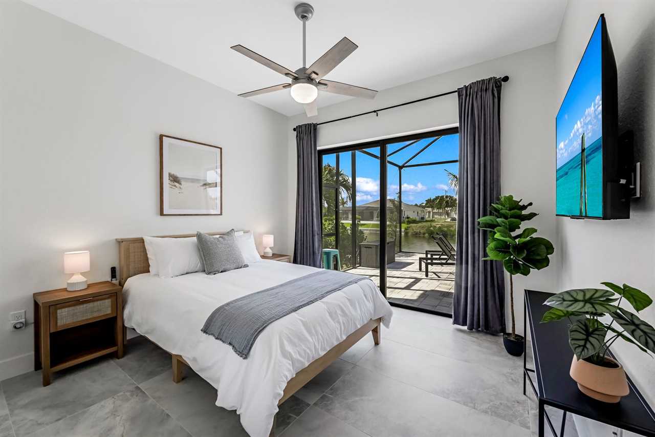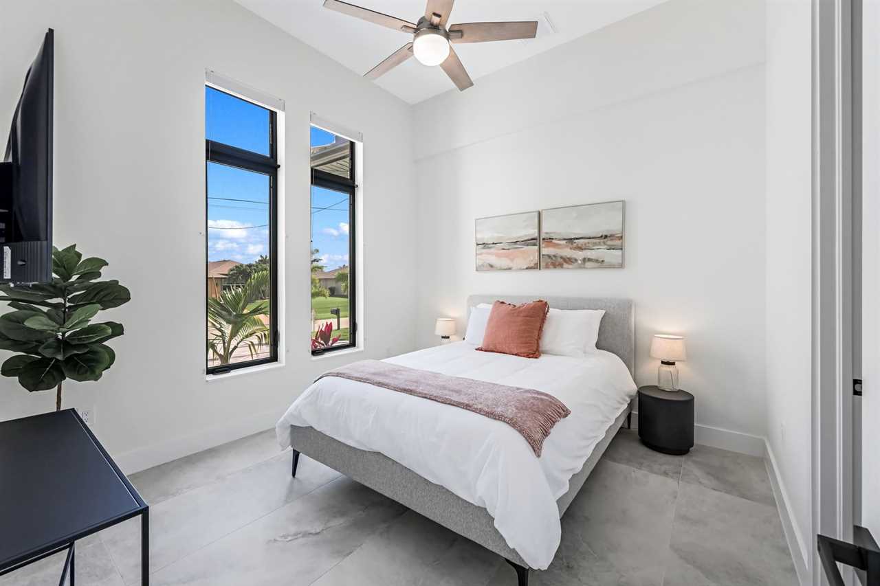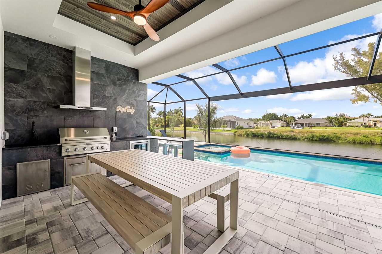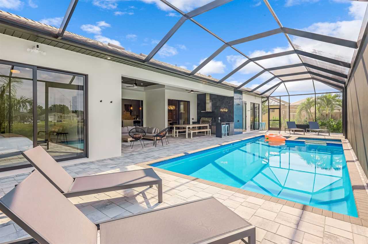 Welcome to your dream vacation at this luxurious waterfront villa in Southwest Cape Coral. Perfectly positioned on a saltwater canal and just a five-minute drive from vibrant Cape Harbour, with upscale dining and shopping, this high-end family-friendly villa offers everything you need for an unforgettable stay in a convenient location. This vacation home offers spacious and luxurious accommodations. Spread out with 5 elegantly appointed bedrooms and 4 modern bathrooms, including three private suites, this property ensures comfort and privacy for all guests. Dive into luxury in the electric heated saltwater pool or unwind in the spa. Both offer a perfect escape under the Florida sun, with stunning views over the canal. Experience the best of indoor and outdoor living with a fully equipped outdoor kitchen, perfect for entertaining, watching the streaming outdoor Smart TV or having a family BBQ. Enjoy the canal views from the newly built dock, great for guests wanting to dock their own boat or rent one locally. (please note the boat lift is unavailable). Inside, the villa boasts a stylish, fully equipped gourmet kitchen with state-of-the-art appliances and elegantly furnished décor with a mid-century modern Scandinavian vibe. There is entertainment for everyone. Engage in endless fun in the garage converted game room equipped with a foosball table, Pac-Man arcade games, a pinball machine, and a football toss game. Outdoor activities are also covered with four bikes and a variety of pool floats available for guest use. Catering to families, this villa is equipped with everything a family may need. Included is a children's pack and play, highchair, and a selection of toys and books. The older children will find endless enjoyment in the garage converted game room. This home has all the amenities, making it easy for everyone, from toddlers to teens, to feel at home. Need to stay connected? The home includes a dedicated office space, with high-speed internet and WIFI, allowing you to work remotely in a quiet and comfortable setting. Peach Paradise promises a luxurious escape with all the comforts of a high-end resort combined with the privacy and convenience of your own home. Whether you're looking to relax poolside, unwind in the spa, or simply enjoy quality time with family, this Cape Coral gem has it all. Sleeping Arrangements: 1st Master Bedroom - King Suite 2nd Master Bedroom - King Suite 3rd Bedroom - Queen Suite 4th Bedroom - Queen 5th Bedroom - 2 sets of Twin Bunks 1st King Master Bath: Dual Vanities Walk in Shower 2nd King Master Bath: Tub/shower Combo Single Vanity Queen Suite Bath: Walk in Shower Single Vanity Guest Bath: Walk in Shower Single Vanity Access to Pool Deck ​​​​​​​ Outdoor Amenities: Electric Heated Saltwater Pool and Spa 4 Adult Bicycles 2 Children Helmets 1 Schwinn Bike Trailer 2 Small Child Size Helmets 1 Adult Helmet Northern Exposure Gulf Access Saltwater Canal Over-sized Pool deck Outdoor Kitchen with BBQ Grill Outdoor Refrigerator and Sink Pool Alarms on Slider doors Inflatables for Pool Outdoor Ceiling Fan Ample Outdoor Seating/Loungers Huge Outdoor Smart TV Dock with Tiki Hut (boat lift not available) Converted Garage to Game Room: Foosball Table Pac Man Arcade Game Legends Pinball Game Football Toss Game Portable Fan General Amenities: Extra Linens and Towels Provided Washer and Dryer Fully Equipped Kitchen Hair Dryer Iron and Ironing Board Ceiling fans Chair in Study Fully Reclines Shampoo, Conditioner and Body Wash in Each Shower Amenities for Young Children: 2 Pack-N-Plays Highchair Booster Seat Children dinnerware and utensils Bibs Children Toys Children Books White Noise Sound Machine Electronics: Huge Flat Screen Smart TV in Living Room Smart TVs in all bedrooms (except in bunk bedroom) Smart TV on Lanai Wireless High-Speed Internet and WIFI * This property has exterior cameras - 2 cameras on pool deck and 2 cameras in front driveway * Garage not available for parking due to game room, but please feel free to use the ample driveway space for your vehicle. * ABSOLUTELY NO PARTIES and all guests and visitors, not in the booking, must be approved by property manager. The property rates include up to 6 guests. Each additional guest will incur a small fee. Please make sure to enter an accurate guest count at time of booking for accurate reservation cost. Electric charge/damage insurance: A prepaid electric charge and damage insurance is included in your reservation. Trash pickup is early Tuesday morning; garbage cans must be taken down to end of driveway on Monday night. There is a $50 fine if garbage cans are not taken down on garbage day
