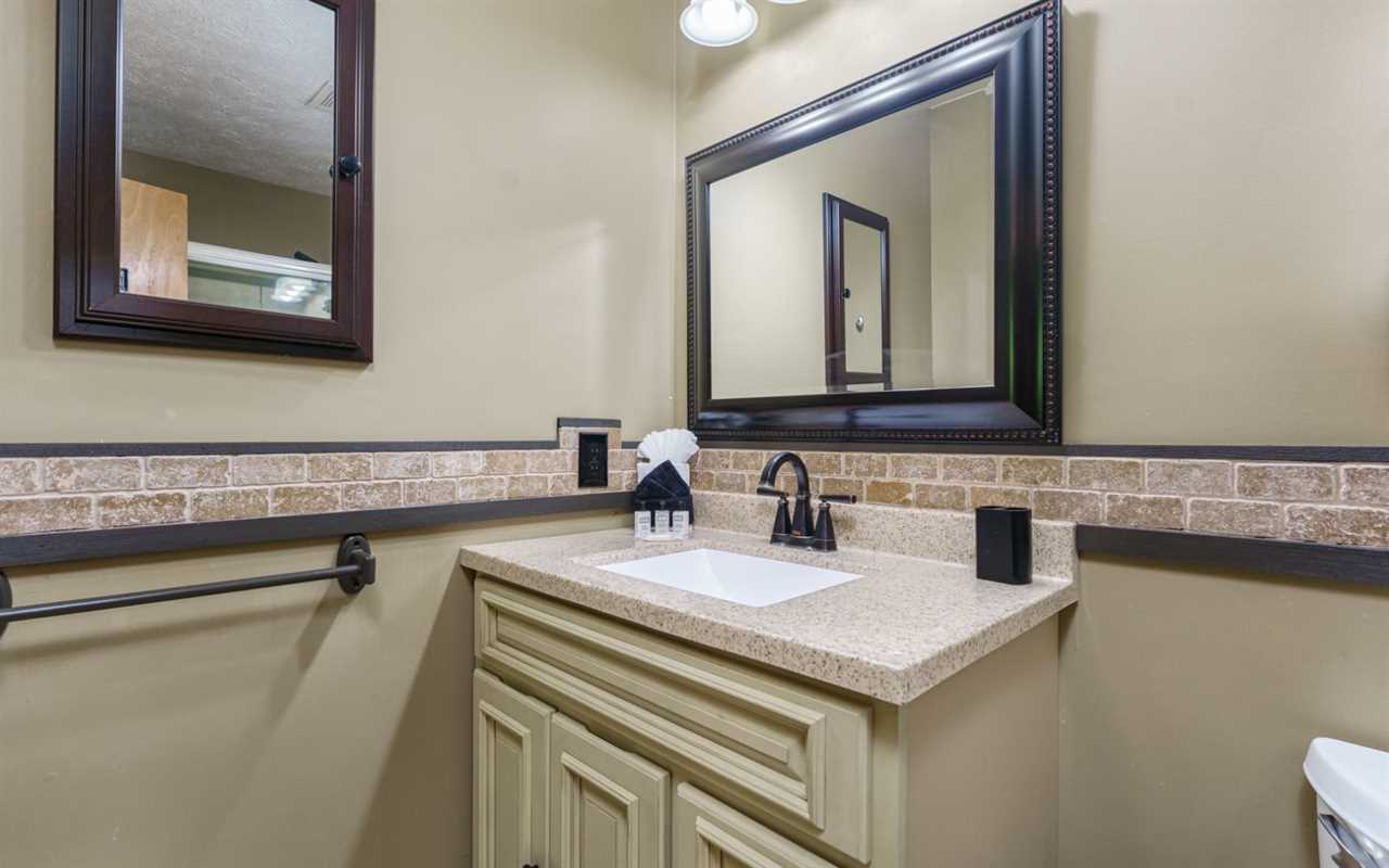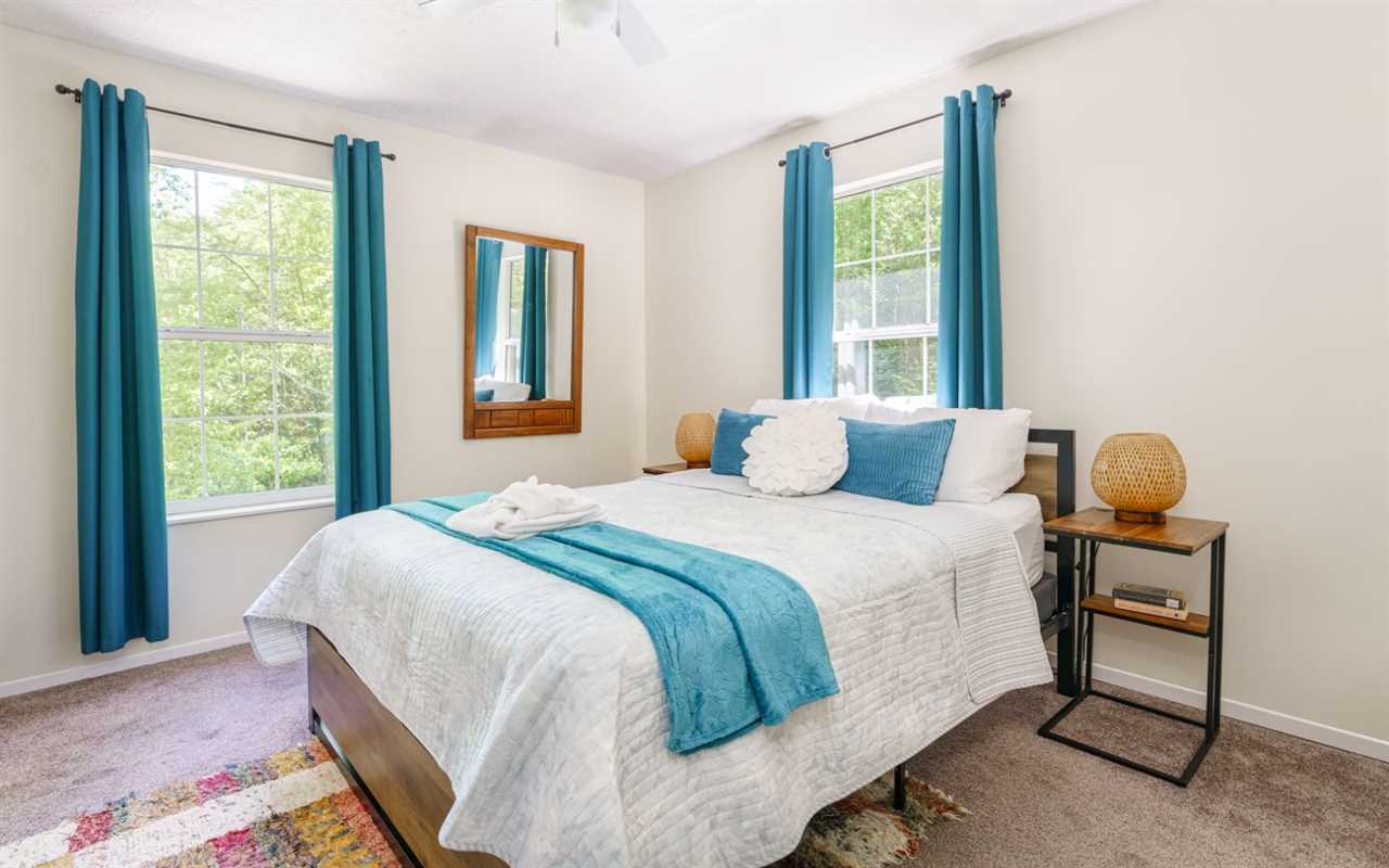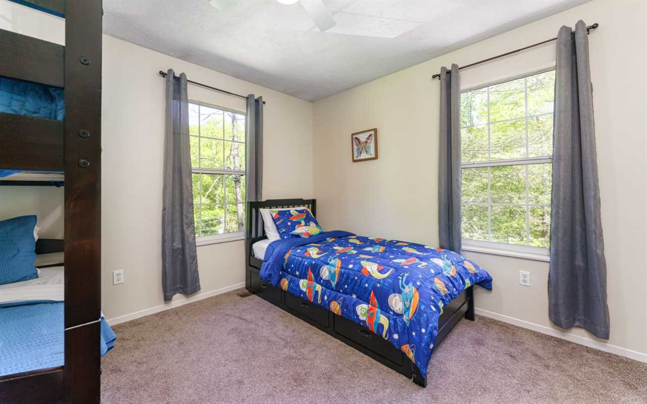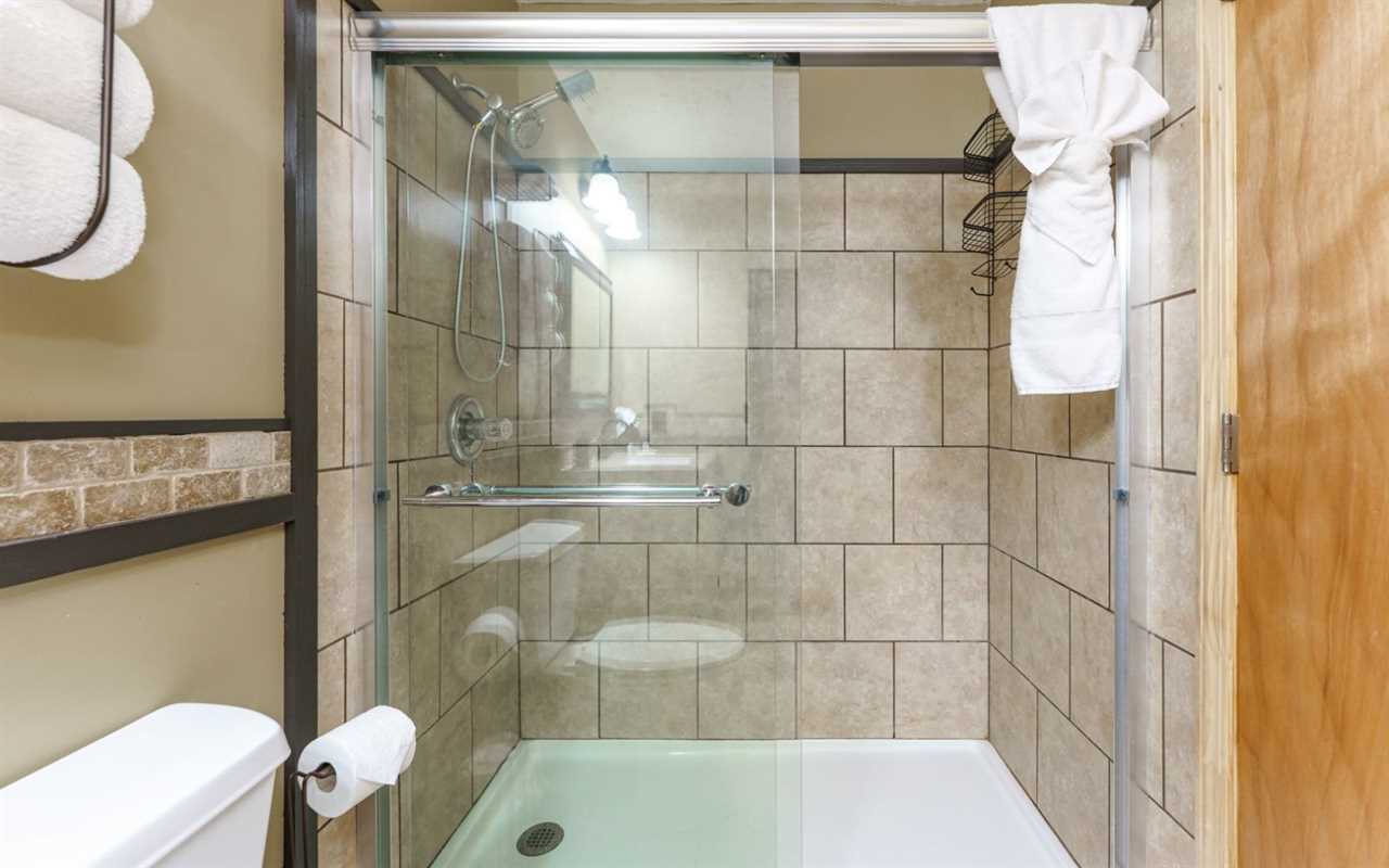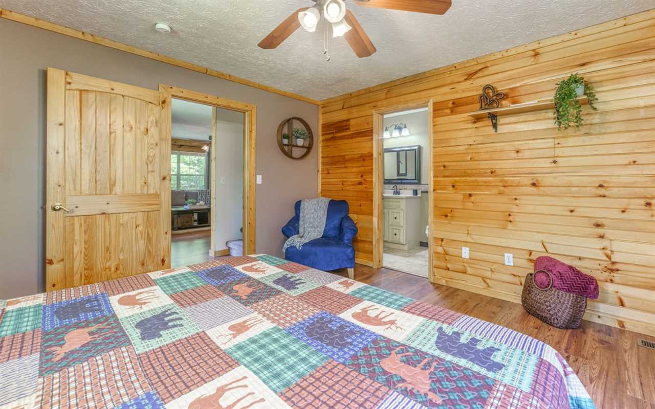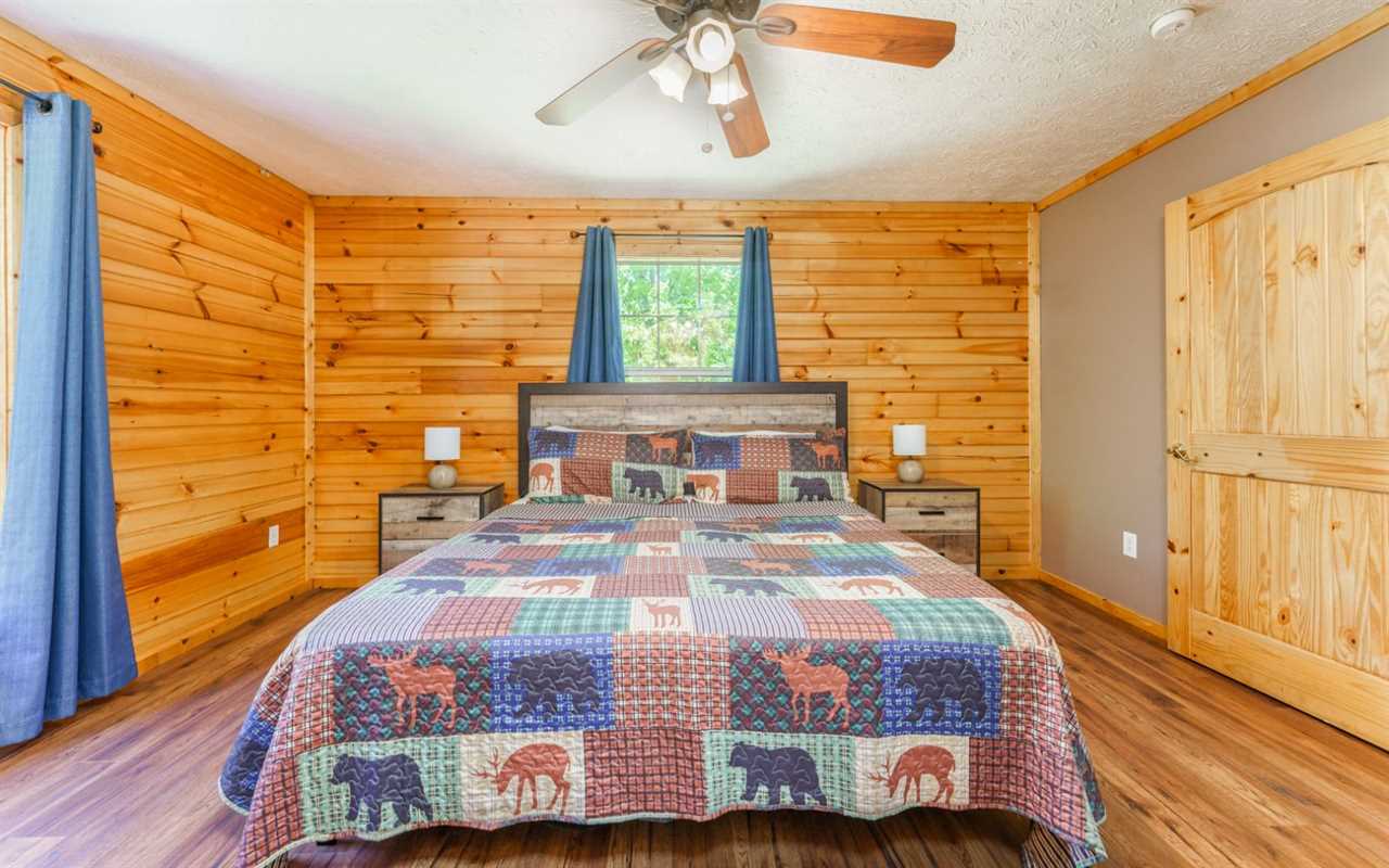 The cabin comfortably sleeps 8 guests with 3 bedrooms and 2.5 bathrooms. The master bedroom, located on the main level, features a luxurious king bed and an ensuite bathroom for added privacy. The second bedroom, located on the upper level, offers a plush queen bed for a restful night's sleep. The third bedroom, also located on the upper level, features a twins and a trundle bed, making it the perfect space for kids or a group of friends.