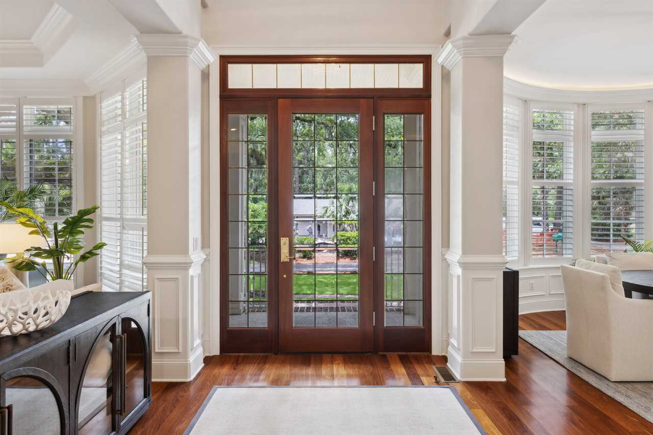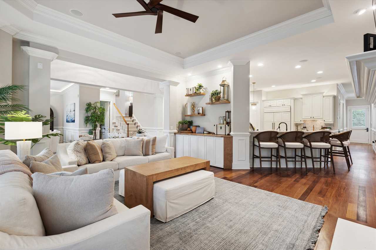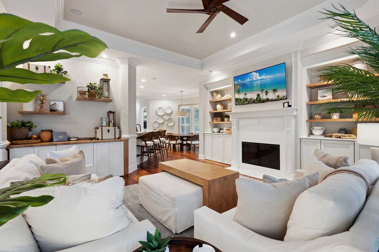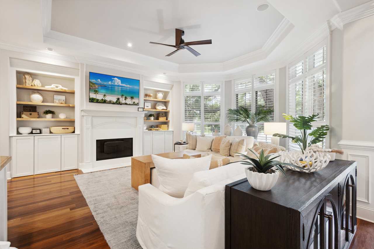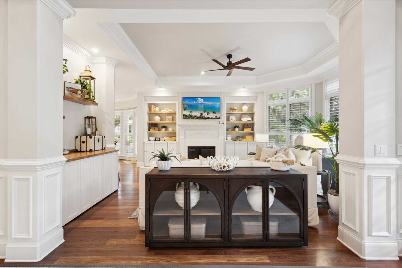 Upon entering this upscale property, you ll find the magnificent great room. Here, sunlight dances through the expansive windows, casting a warm glow on the inviting interiors. Paired with coffered ceilings it creates the perfect atmosphere of Lowcountry charm, blending relaxed indoor-outdoor living seamlessly.