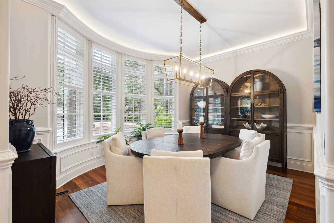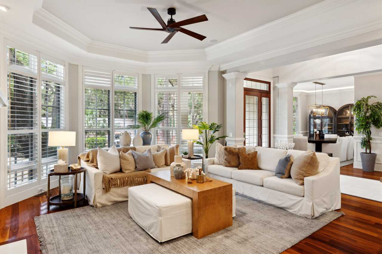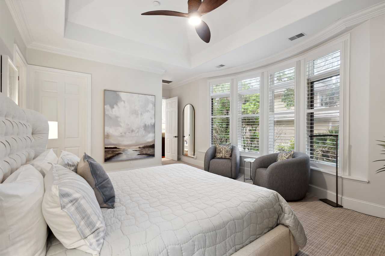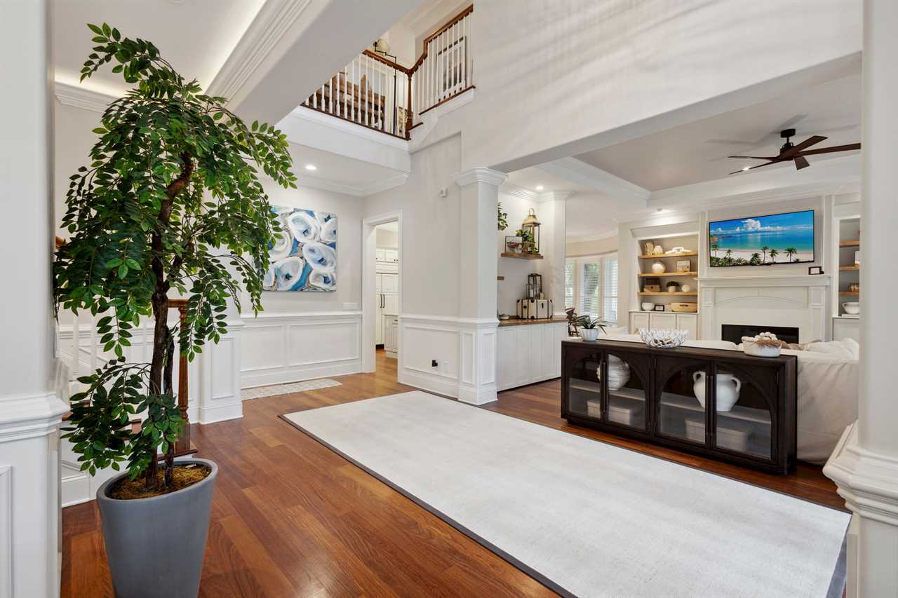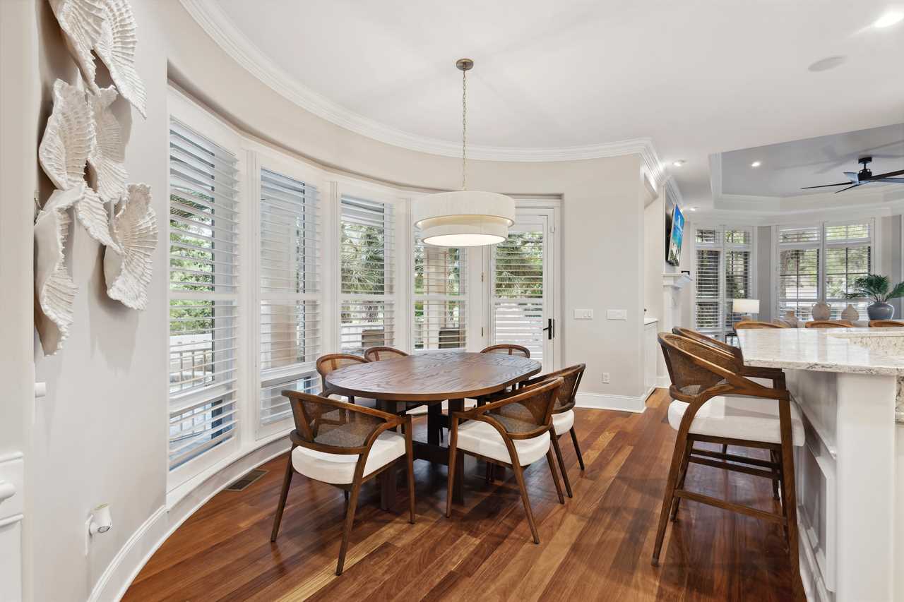 Upon entering this upscale property, you ll find the magnificent great room. Here, sunlight dances through the expansive windows, casting a warm glow on the inviting interiors. Paired with coffered ceilings it creates the perfect atmosphere of Lowcountry charm, blending relaxed indoor-outdoor living seamlessly.