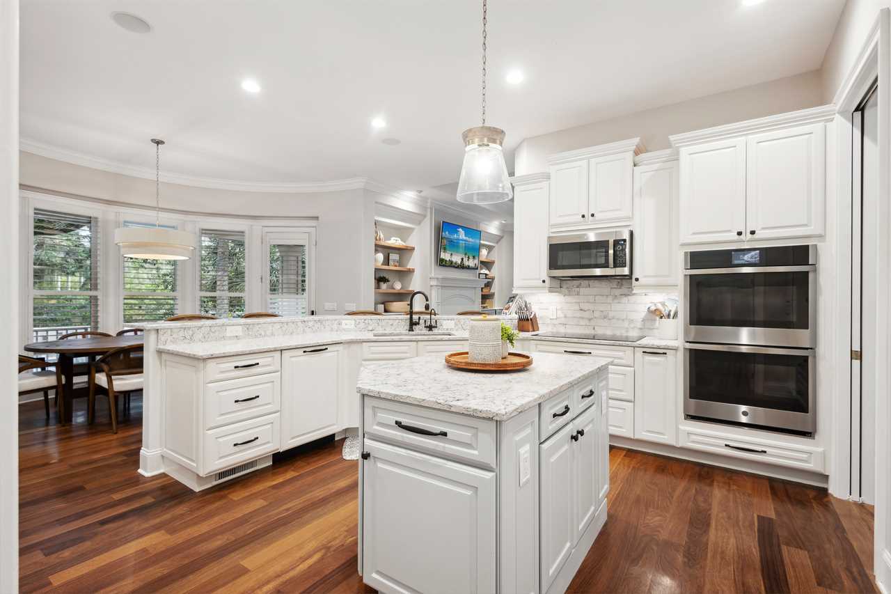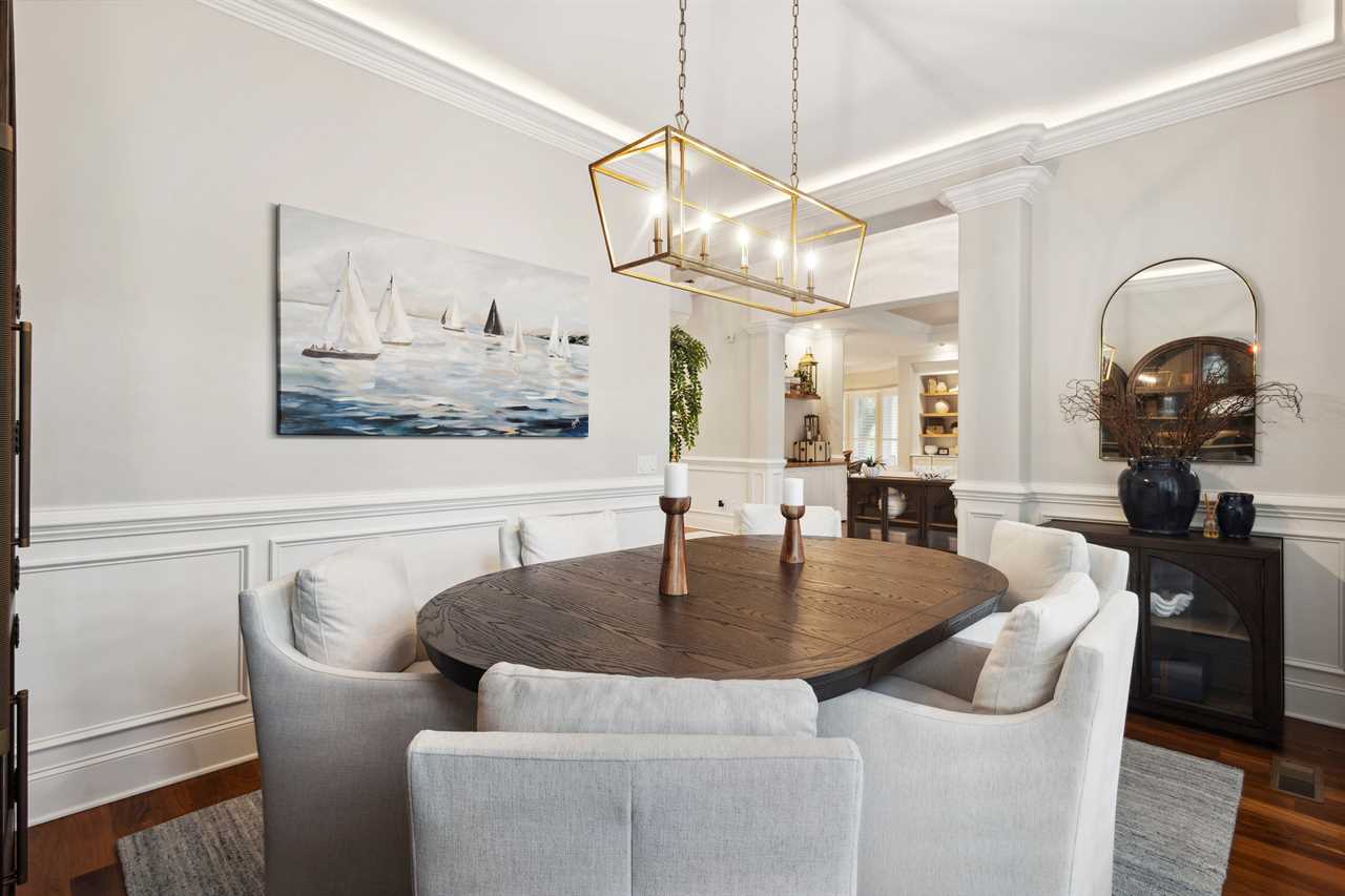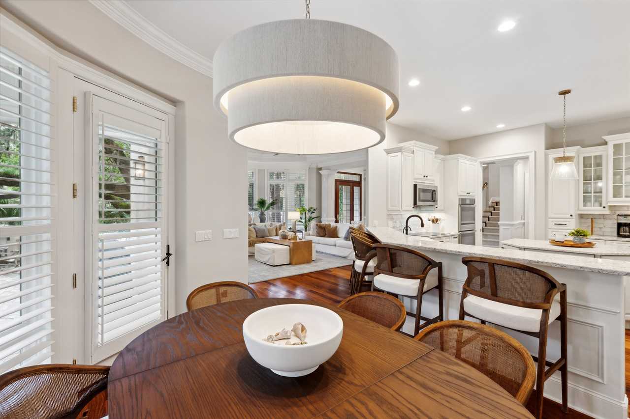 At the heart of the home lies a chef's kitchen, featuring top-of-the-line gourmet appliances and modern upgrades. Its open-plan layout transforms mealtime into a joyous occasion, offering ample seating at the island and adjacent dining tables. Perfect for shared moments and lively conversations, it creates an inviting atmosphere for gatherings and dining experiences.
