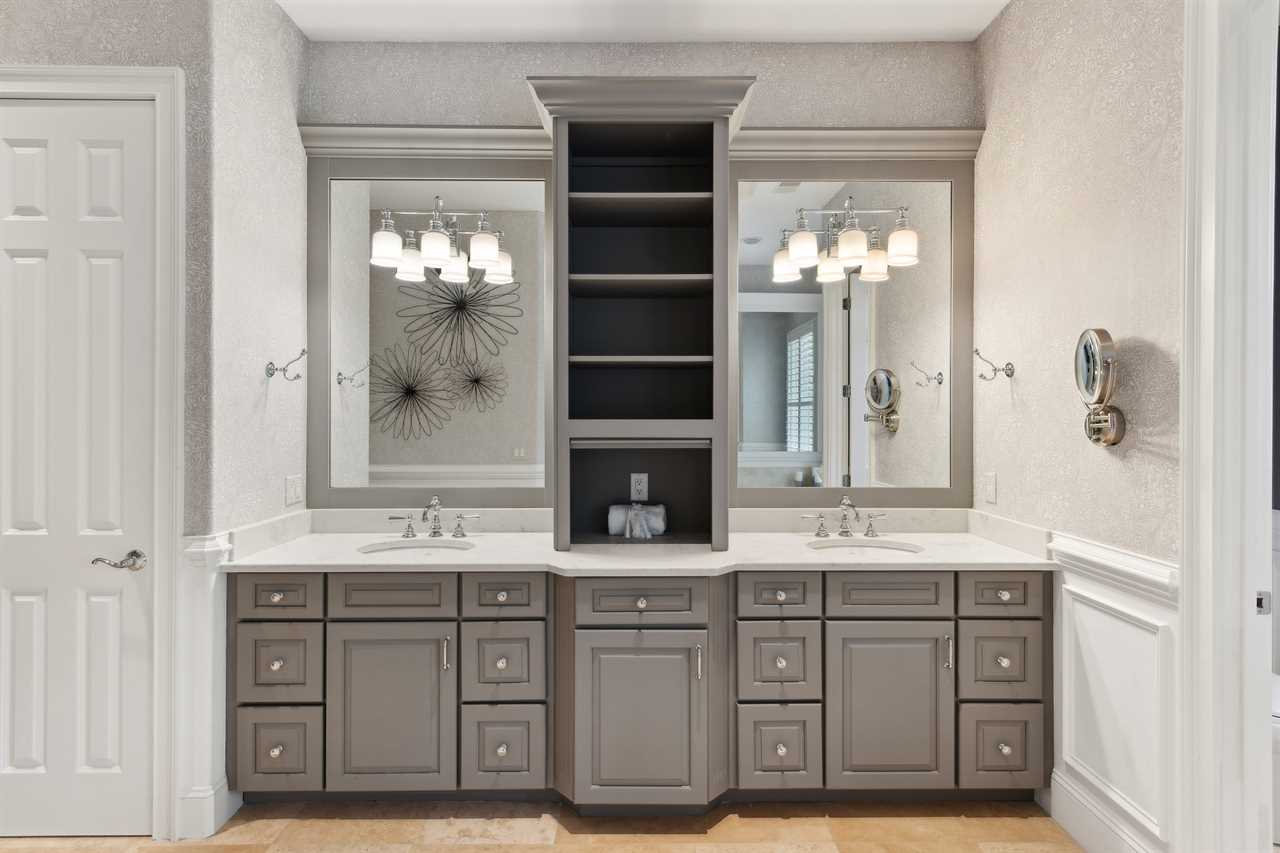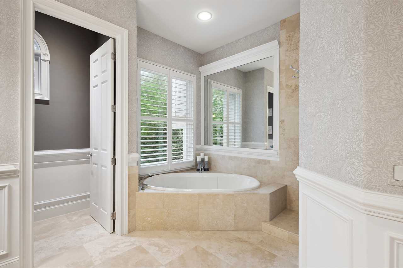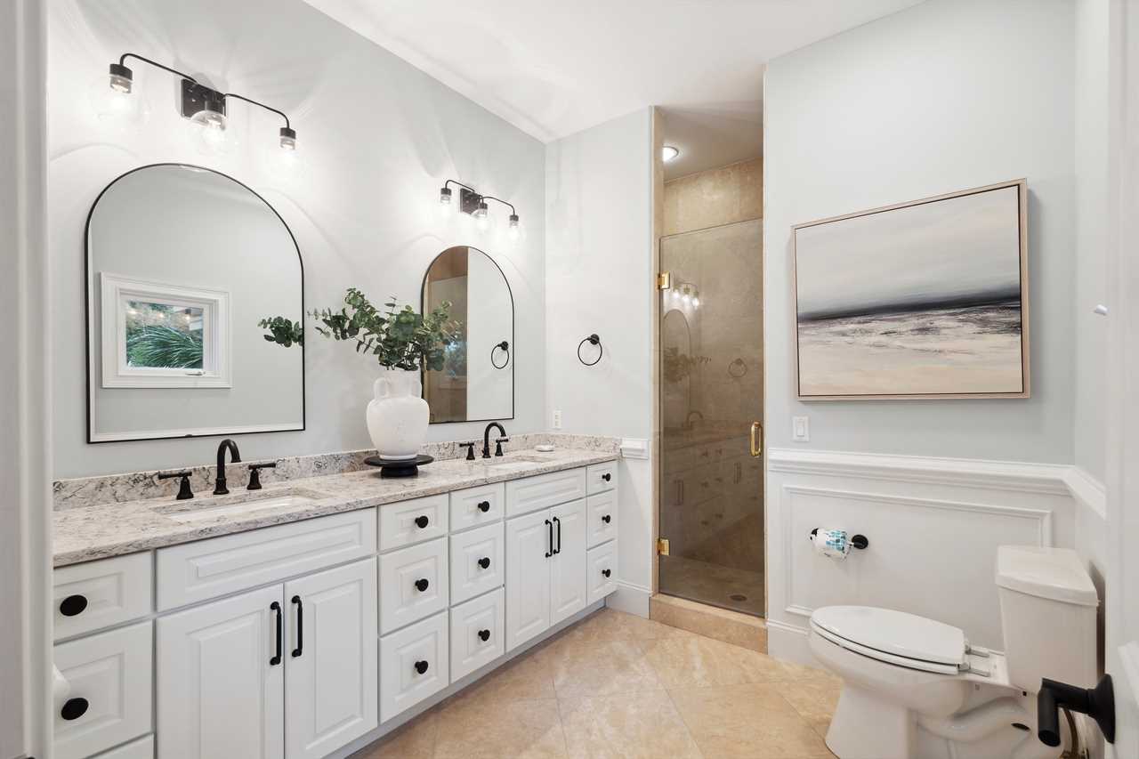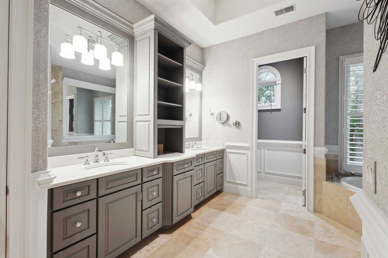 ✓ En-suite bathroom with walk-in shower, soaking tub and double vanity with custom cabinets