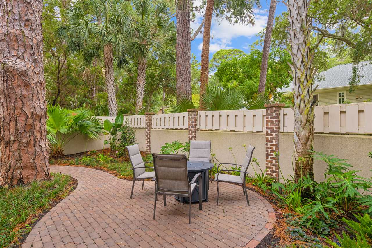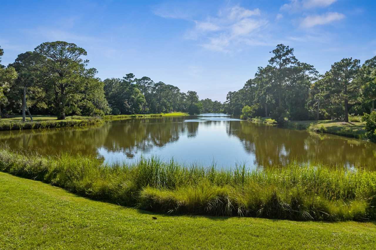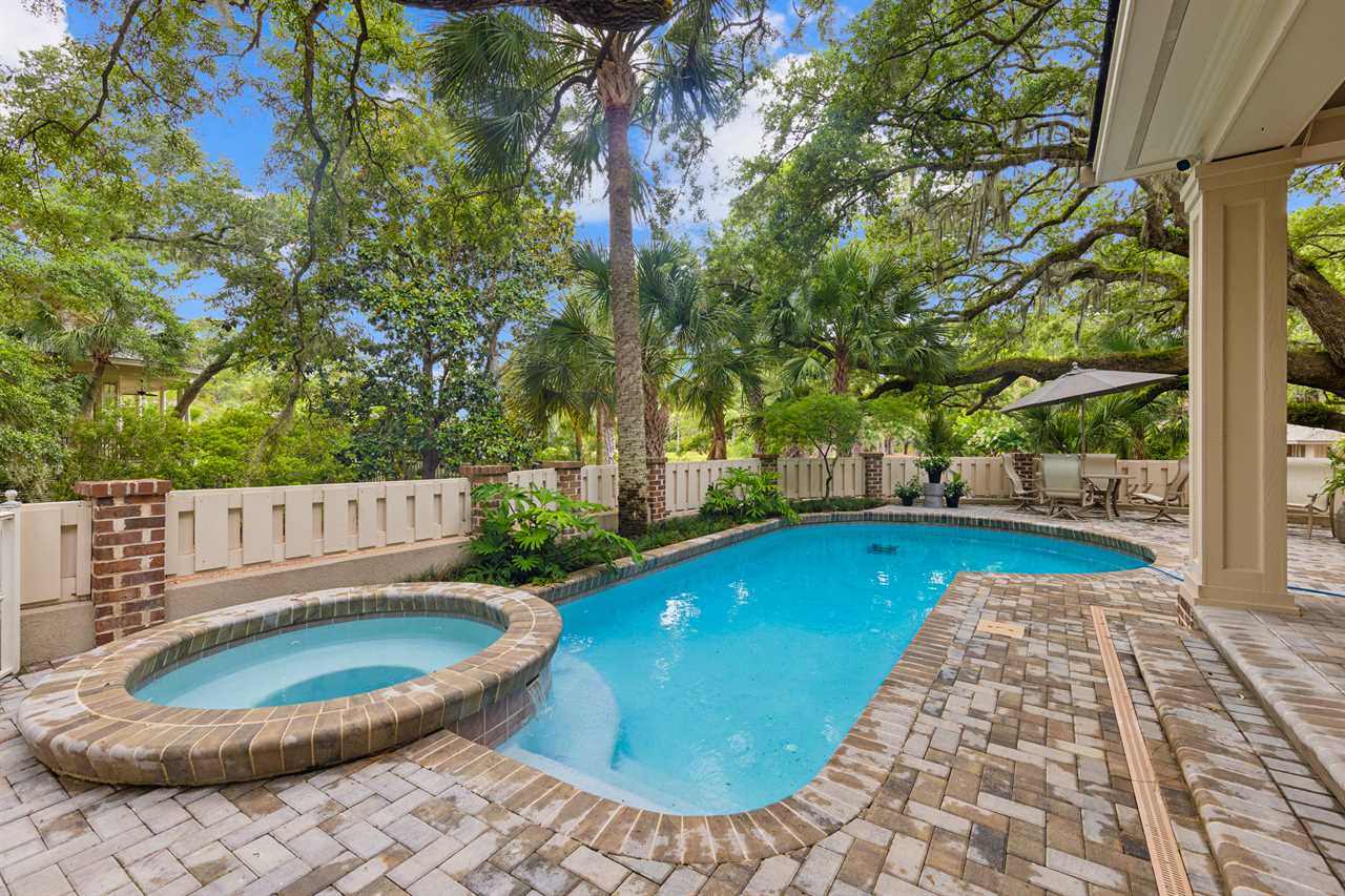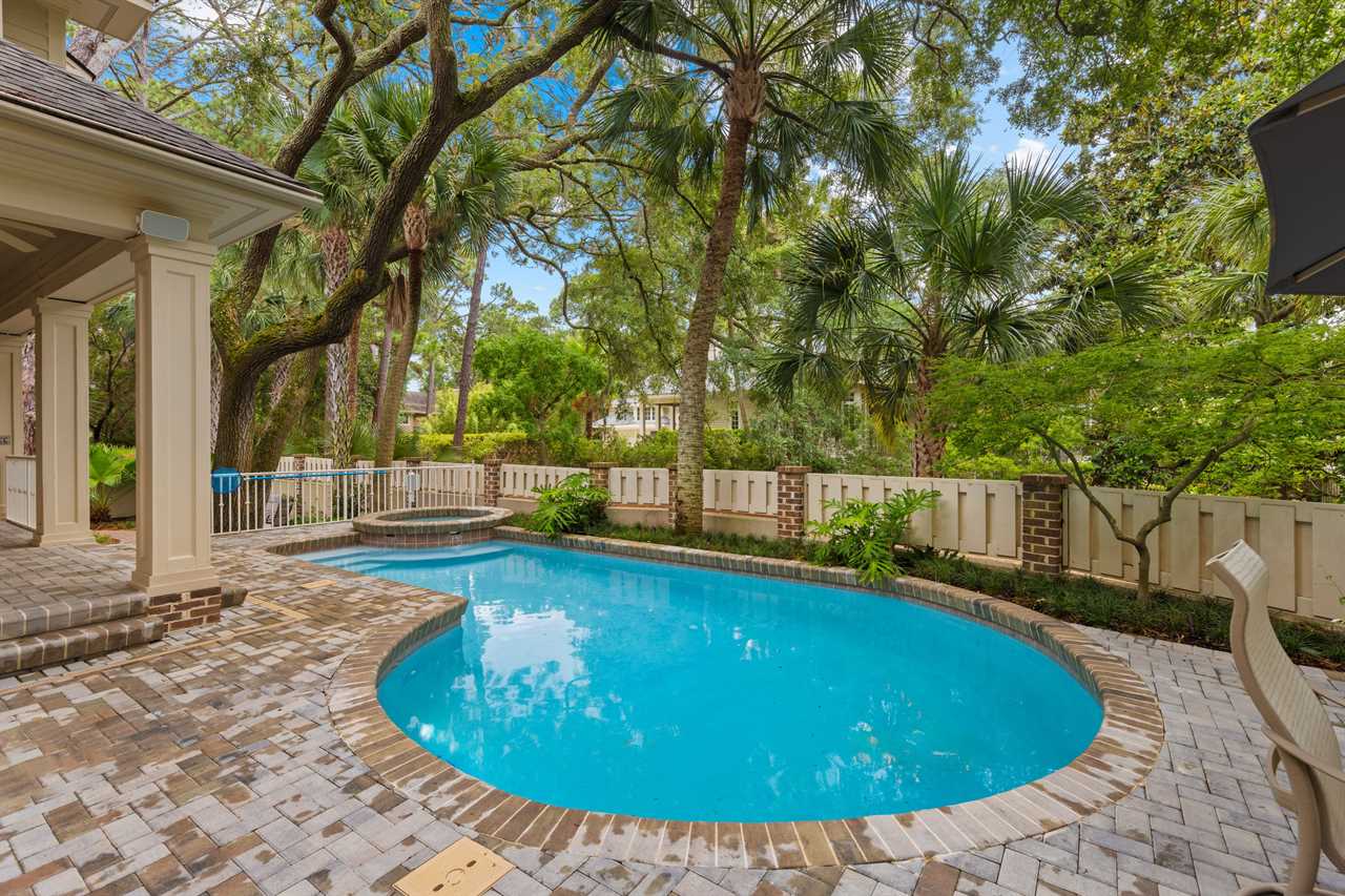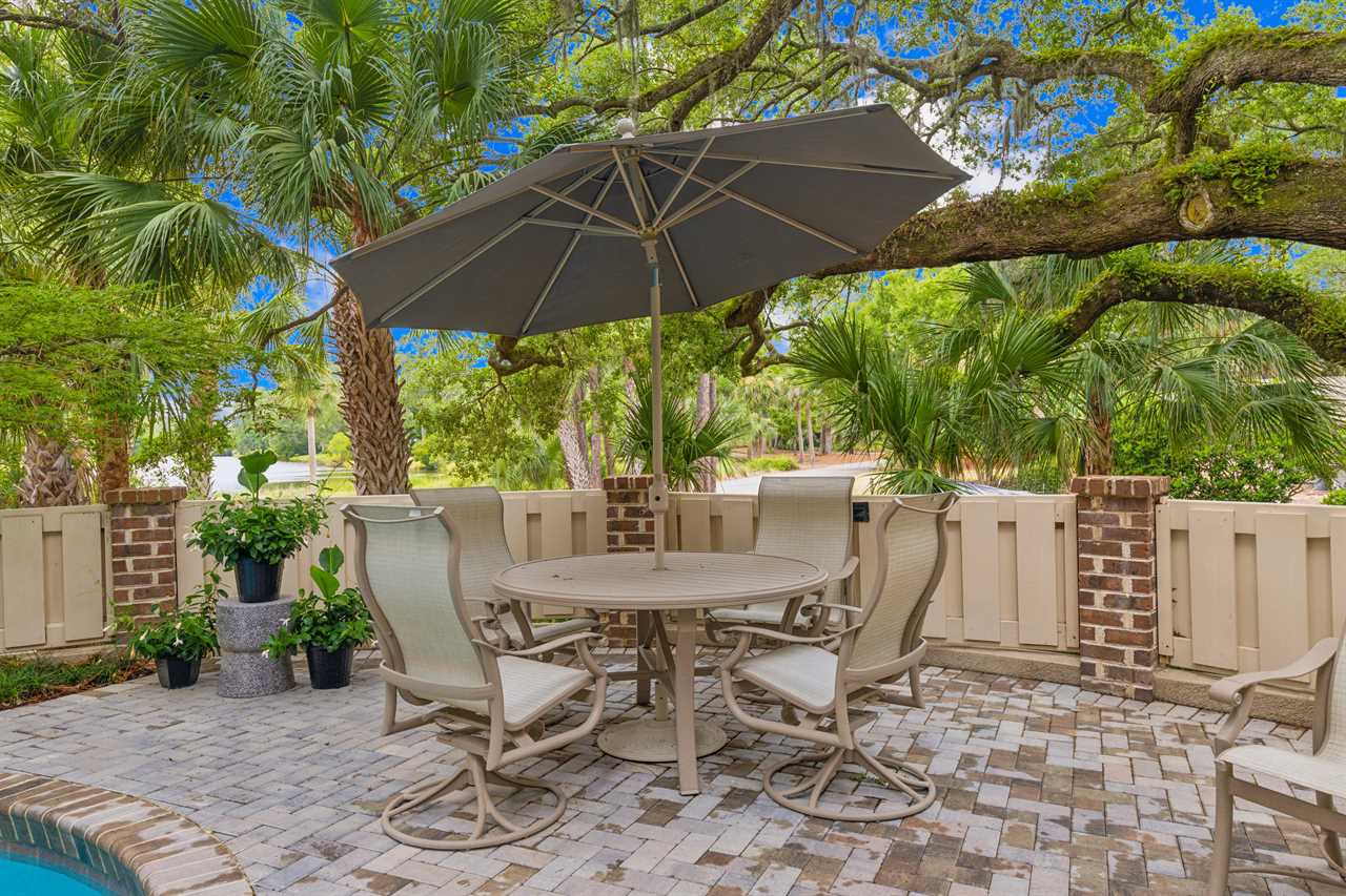 From the Family Room, step outside onto the sprawling wrap-around patio and discover your own private oasis overlooking the shimmering pool and spa with peaceful views of Sprunt Pond. Furnished with comfortable seating and an outdoor dining area, it's the ideal spot for alfresco meals and leisurely lounging in the gentle breeze.