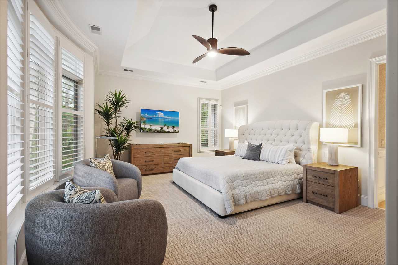 Relax and unwind after a day of adventures in the luxurious second-floor bedrooms. The first primary suite beckons with a plush king-sized bed and a spa-like ensuite featuring a double vanity and a soaking tub.