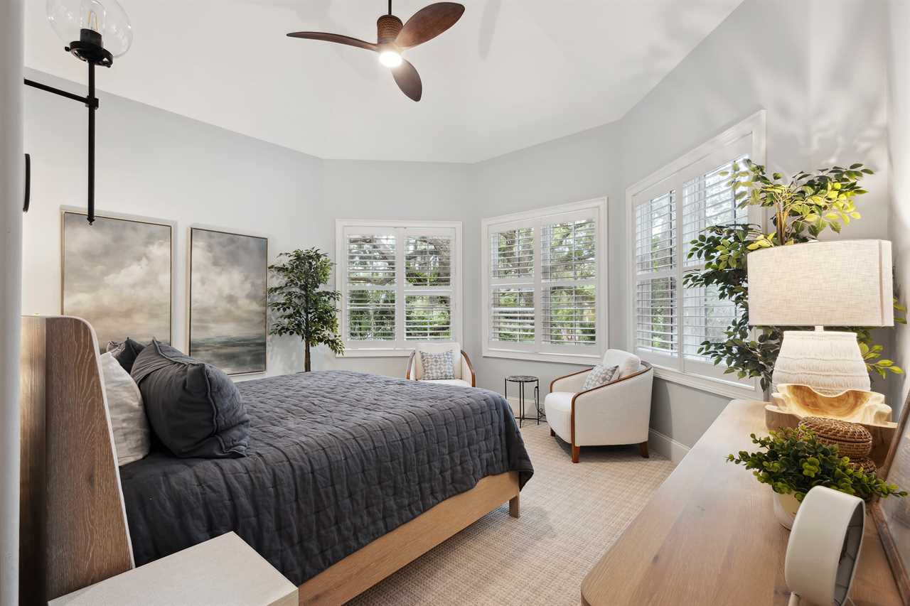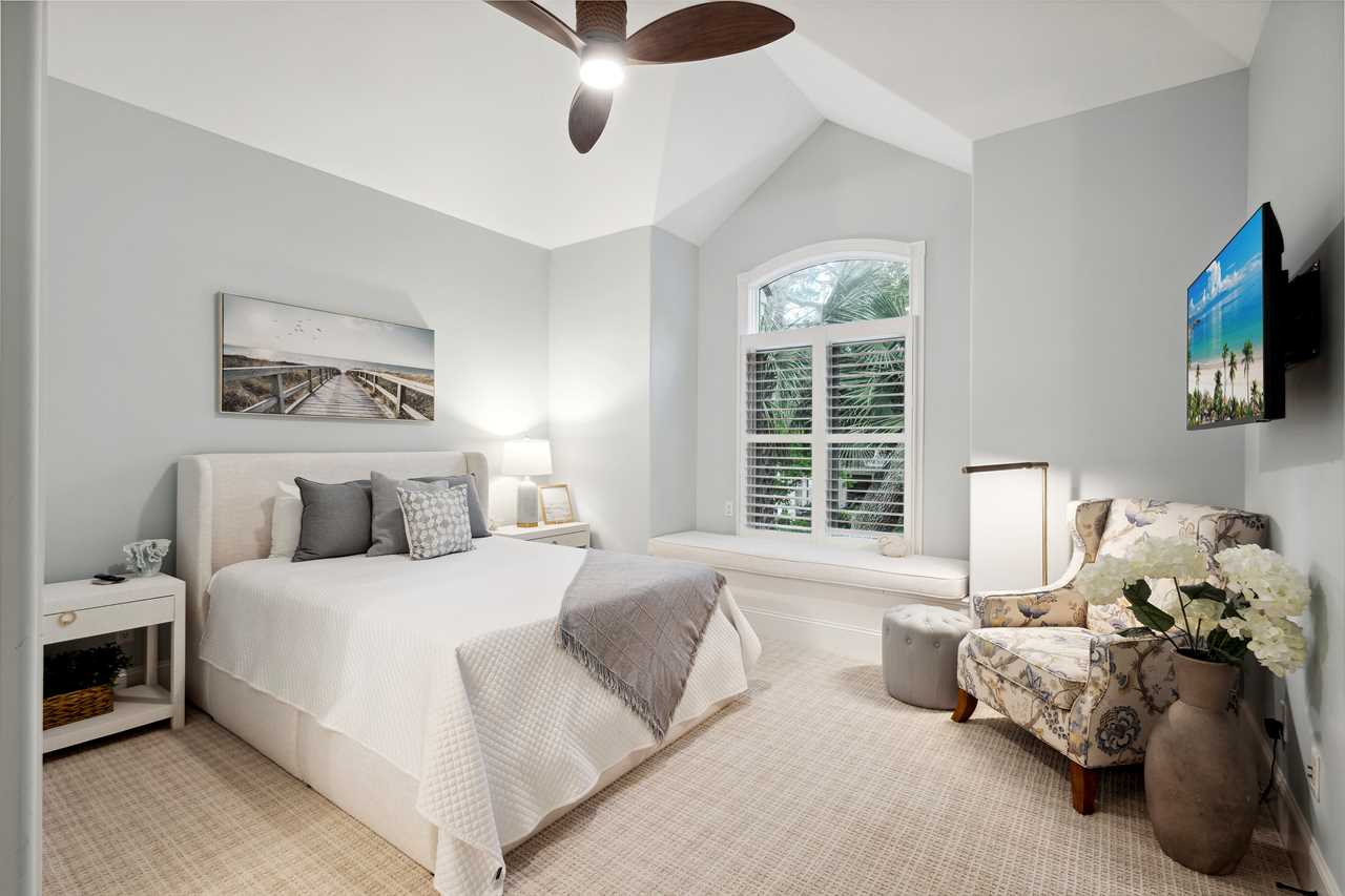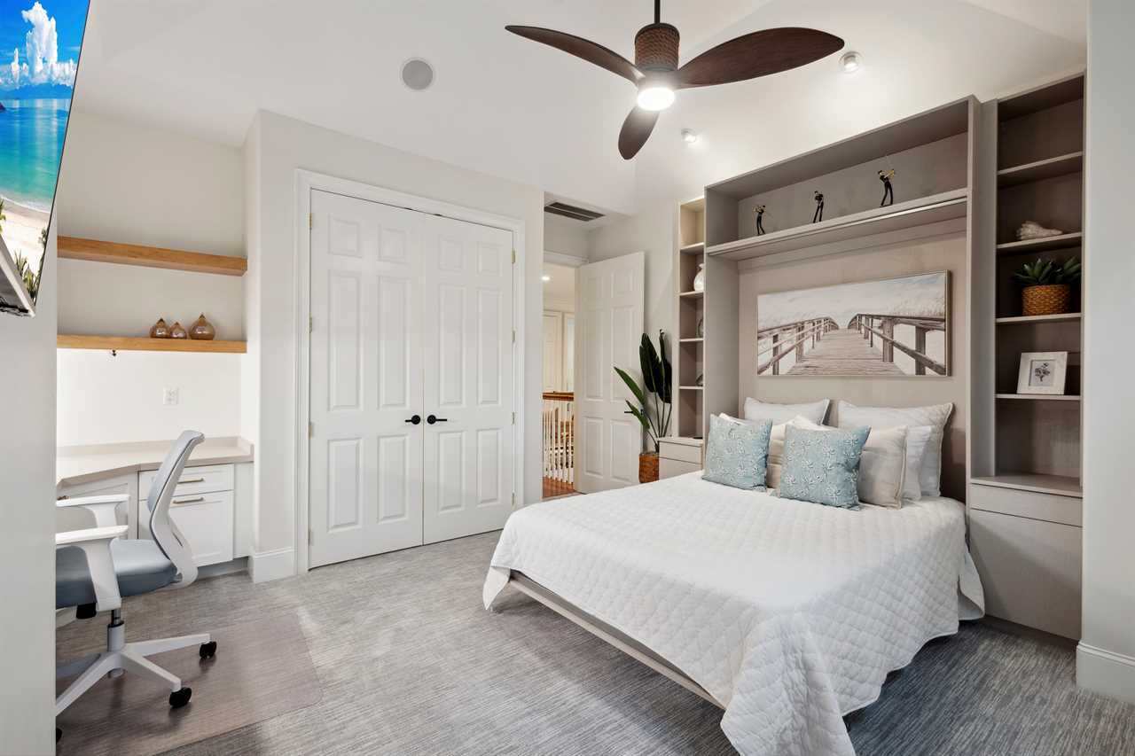 Bedroom 2 offers a murphy-style queen bed and a perfect office space for those blending leisure and business. Nearby, Bedroom 3 has a king bed and panoramic windows, sharing a hallway bathroom with Bedroom 2. Bedrooms 4 and 5 feature en-suites for added privacy and cozy touches like lagoon views and window seat reading nook.