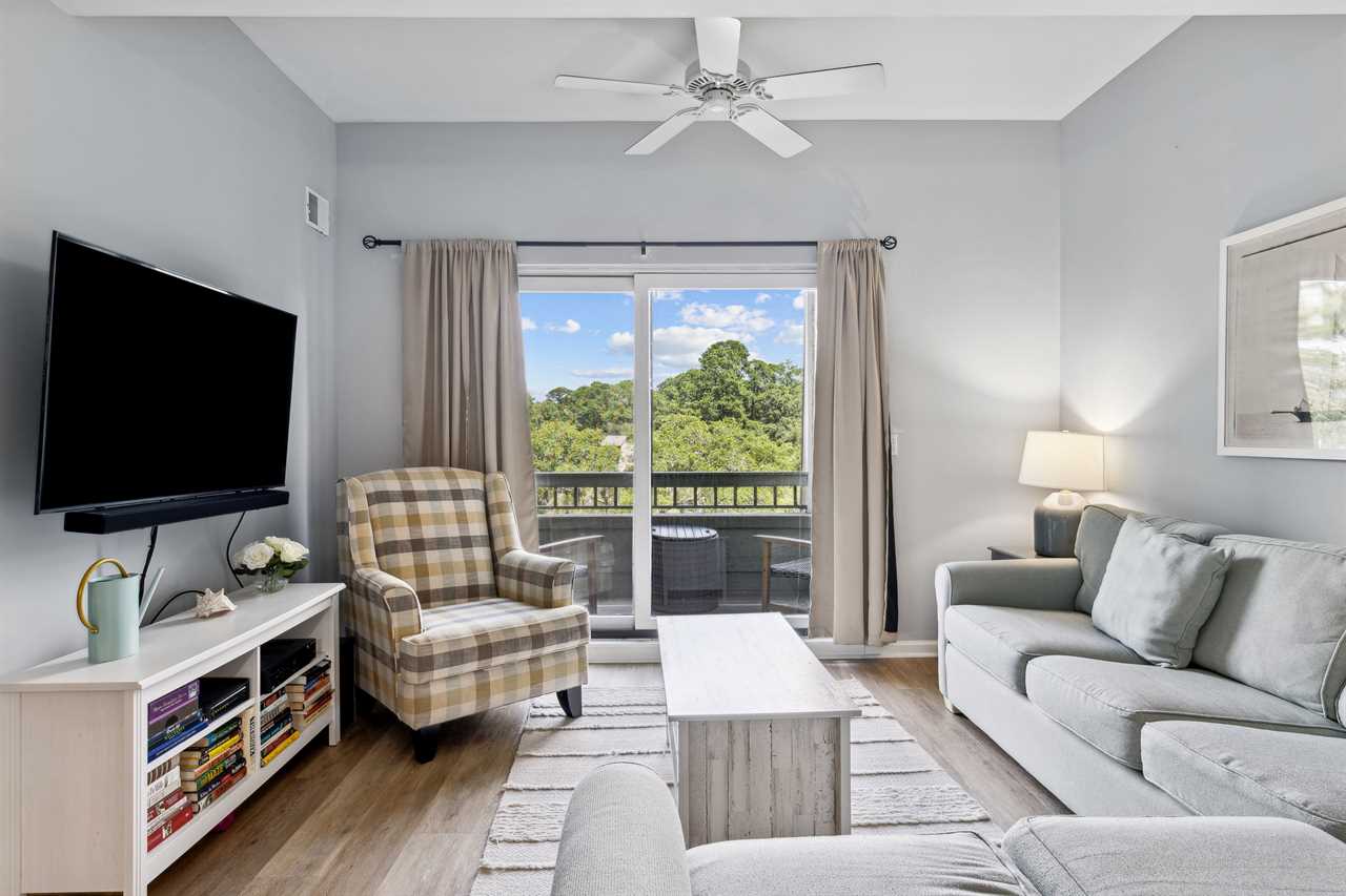 ✓ Cozy balcony with outdoor seating and Harbour Town views