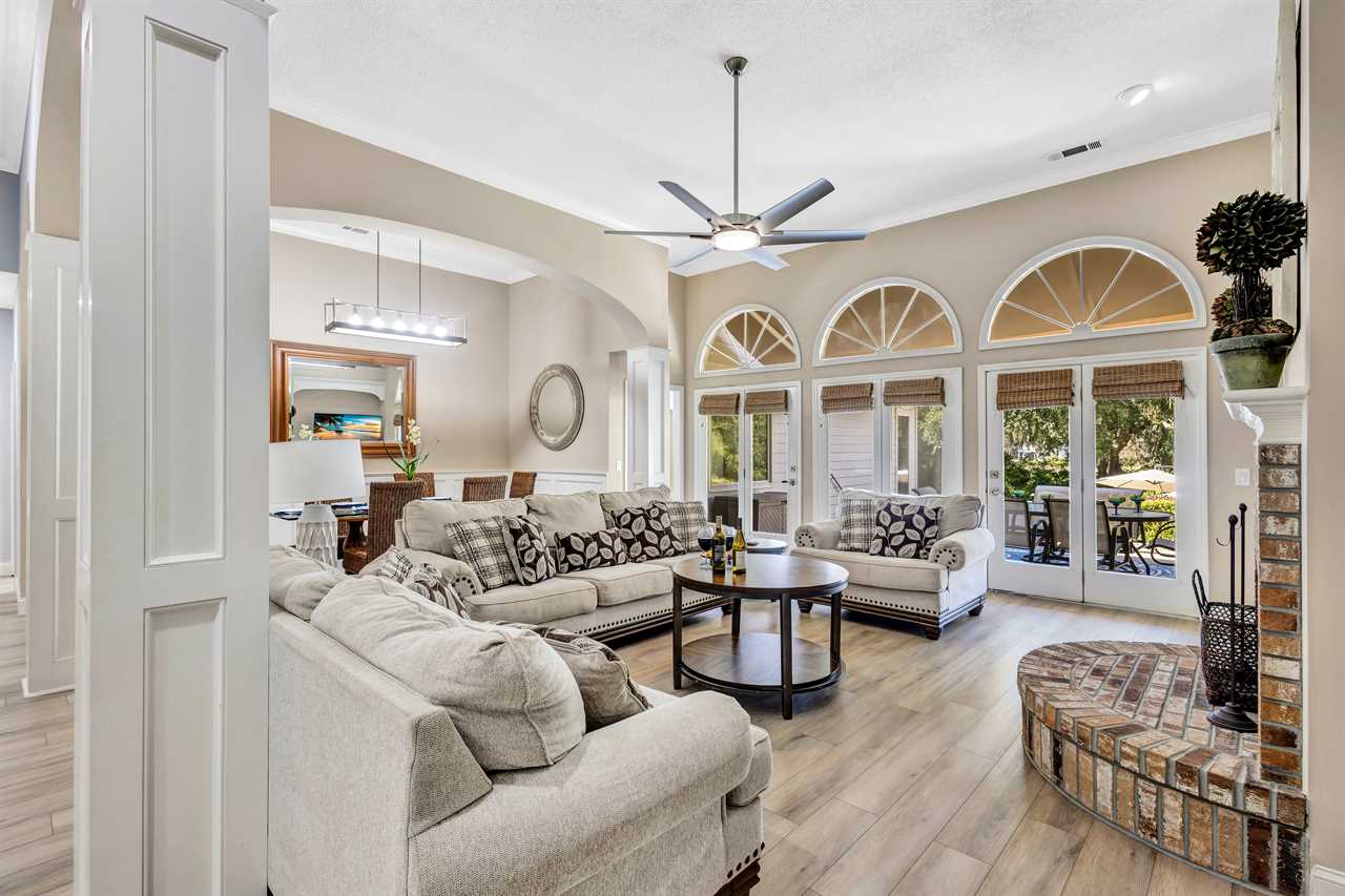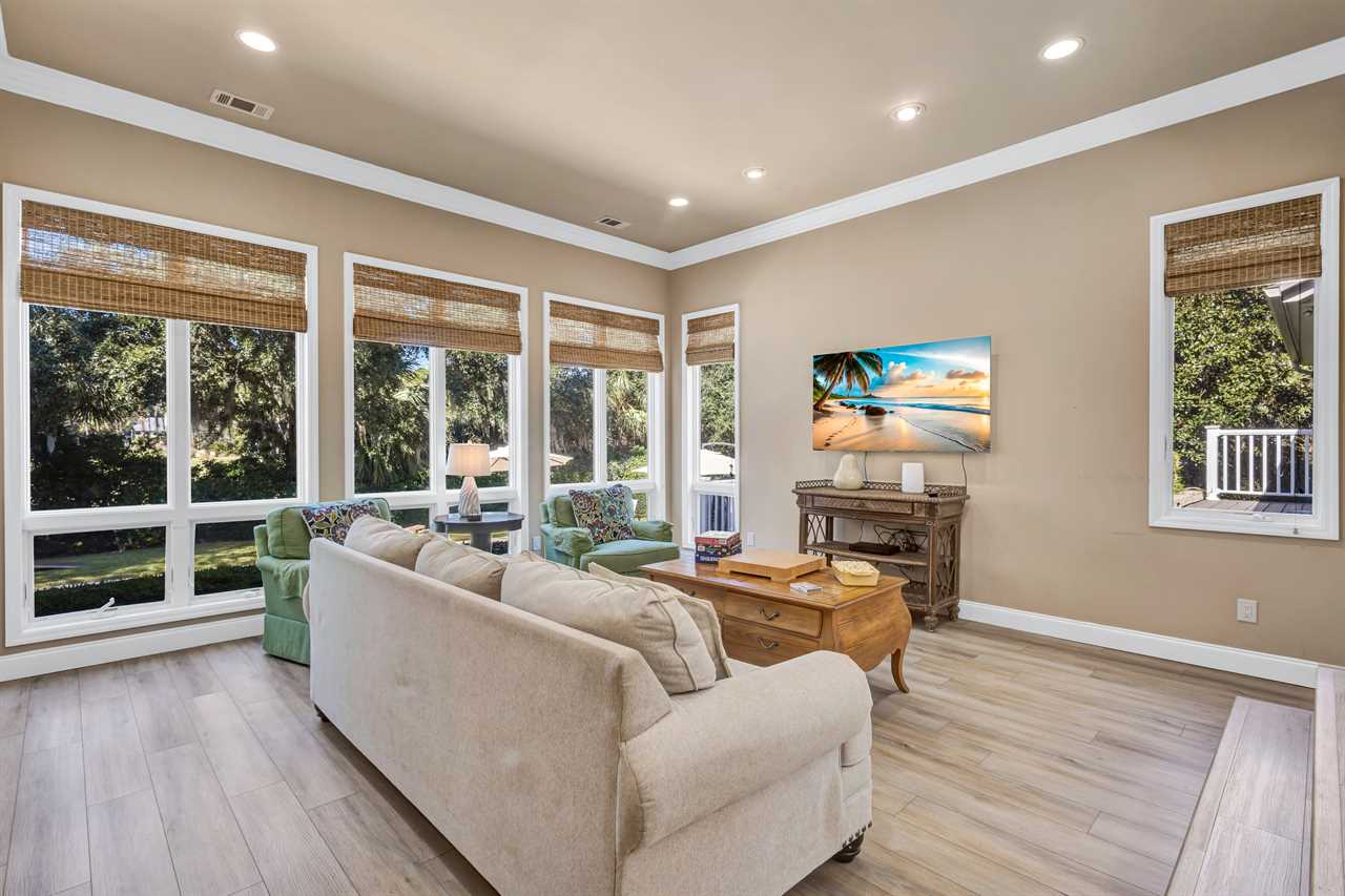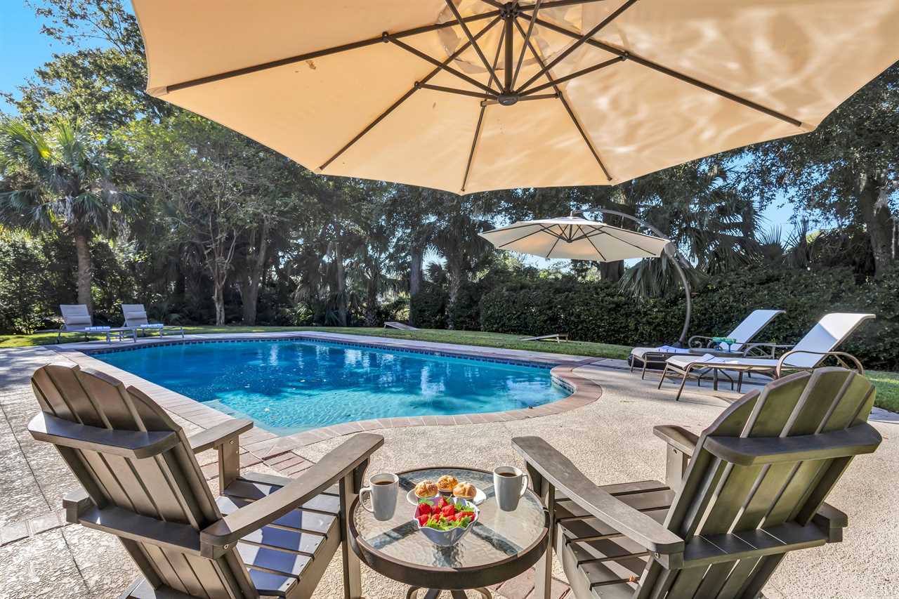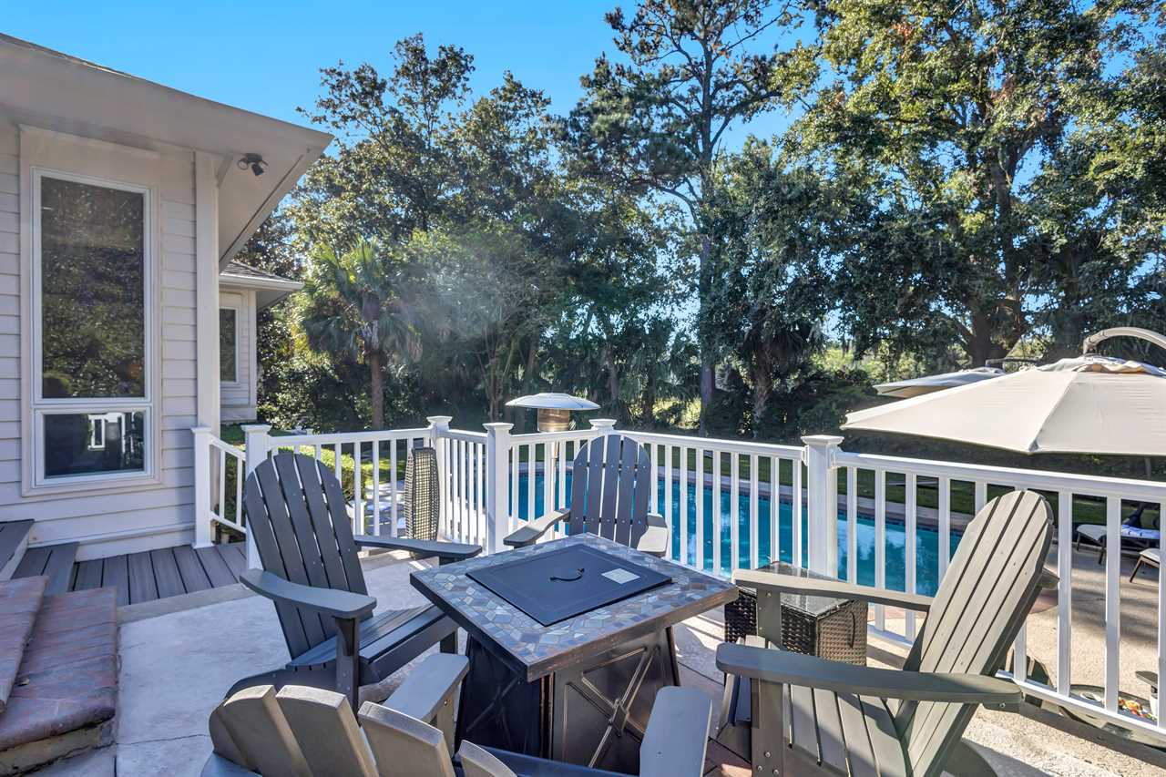 Step into a blend of comfort and style with this sophisticated Lowcountry gem. This elegant 7-bedroom home offers spacious accommodations for a big group without compromising personal space. Unwind in the inviting indoor-outdoor living space, complete with brand-new modern furnishings, and FOUR living areas to spread out! The expansive deck overlooks a private heated pool and offers serene wooded views of the world renown Robert Trent Jones Golf Course. Located just a short walking distance from the ocean with its endless sandy beaches.