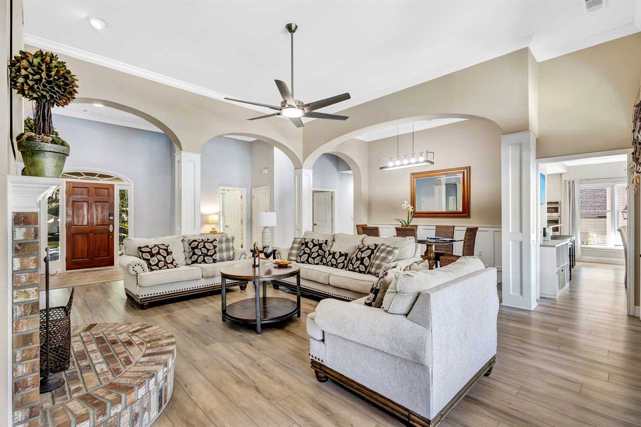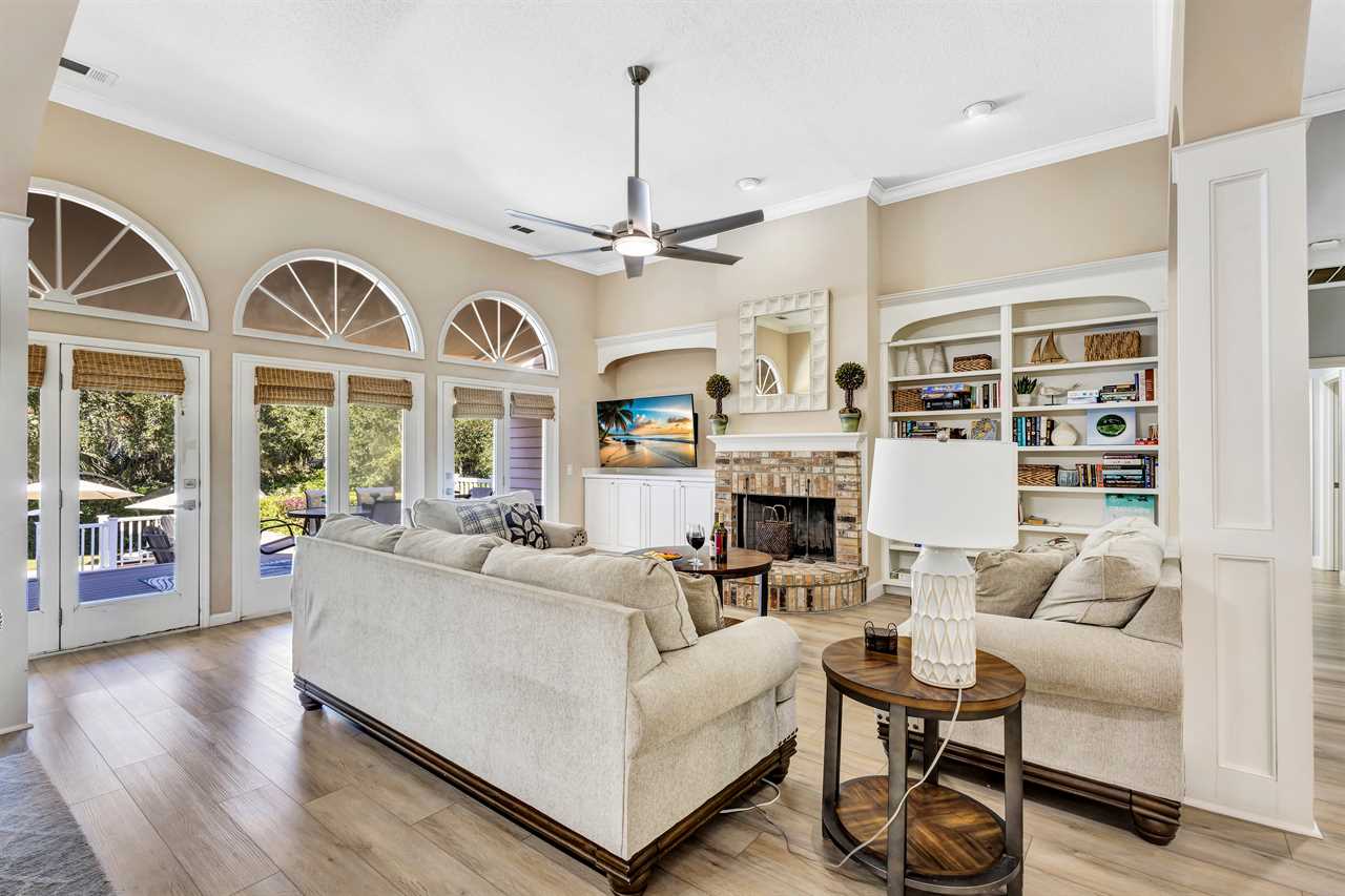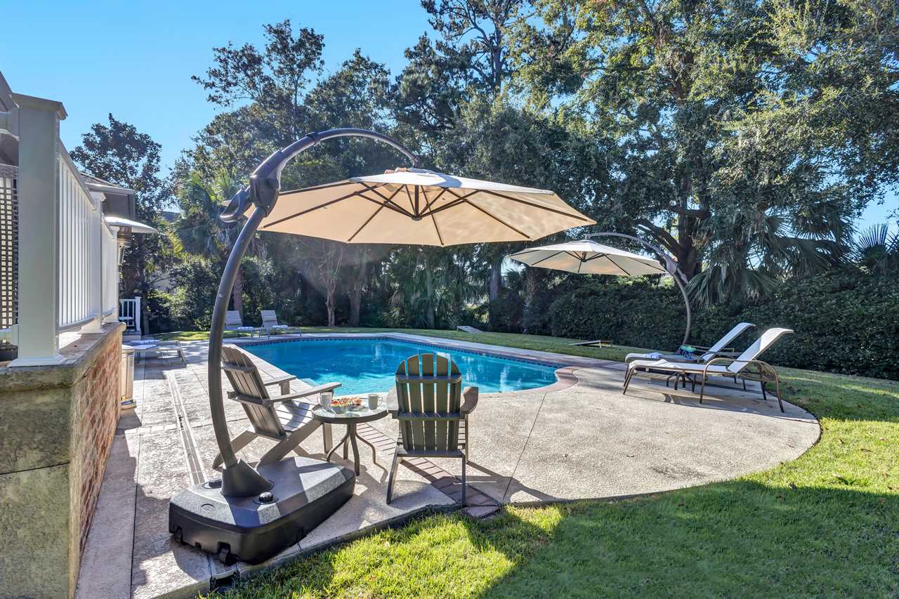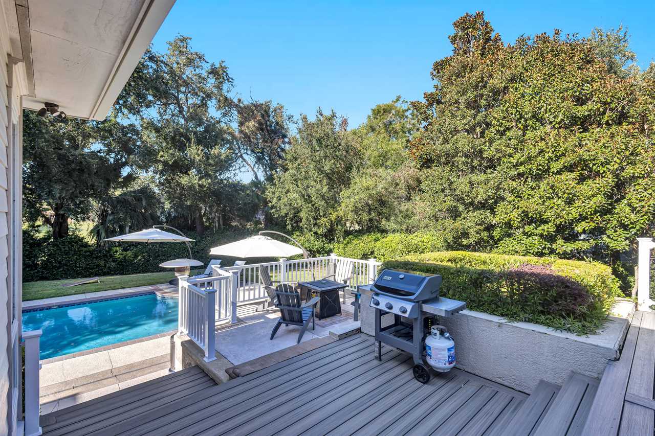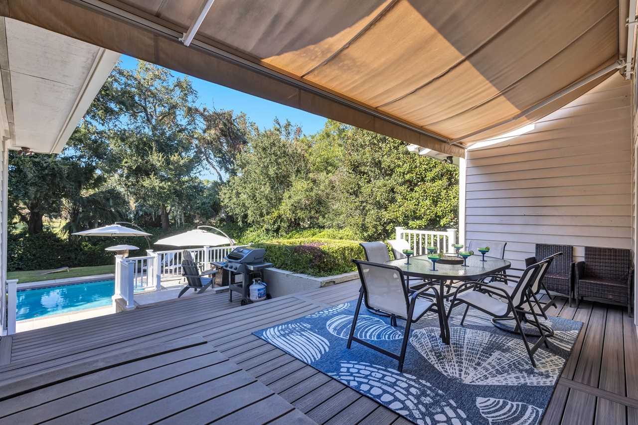 Step into a blend of comfort and style with this sophisticated Lowcountry gem. This elegant 7-bedroom home offers spacious accommodations for a big group without compromising personal space. Unwind in the inviting indoor-outdoor living space, complete with brand-new modern furnishings, and FOUR living areas to spread out! The expansive deck overlooks a private heated pool and offers serene wooded views of the world renown Robert Trent Jones Golf Course. Located just a short walking distance from the ocean with its endless sandy beaches.