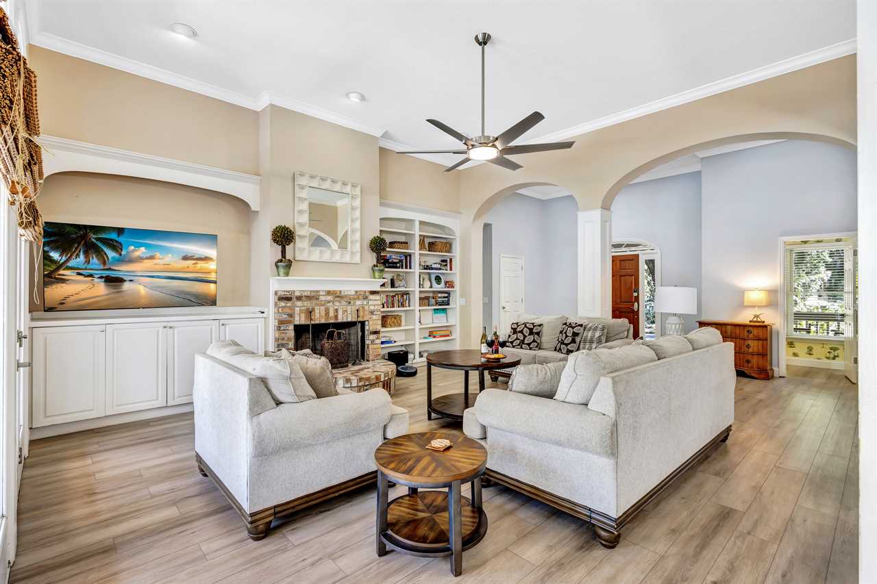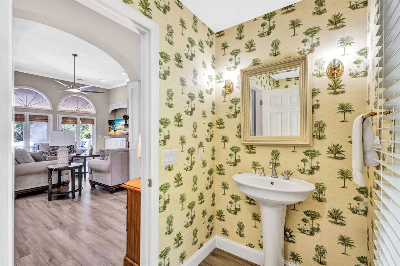 The expansive deck is an entertainer's dream, featuring ample seating and a fully equipped grill station, with a seamless transition into the backyard where a heated pool awaits. This inviting space is perfect for sun-soaked days or relaxing evenings under the stars. Challenge friends or family to a game of cornhole, or let the kids enjoy the open space. After a day of island adventures, gather around the gas firepit with views of the serene golf course—an ideal spot to share stories and plan the next day's fun.