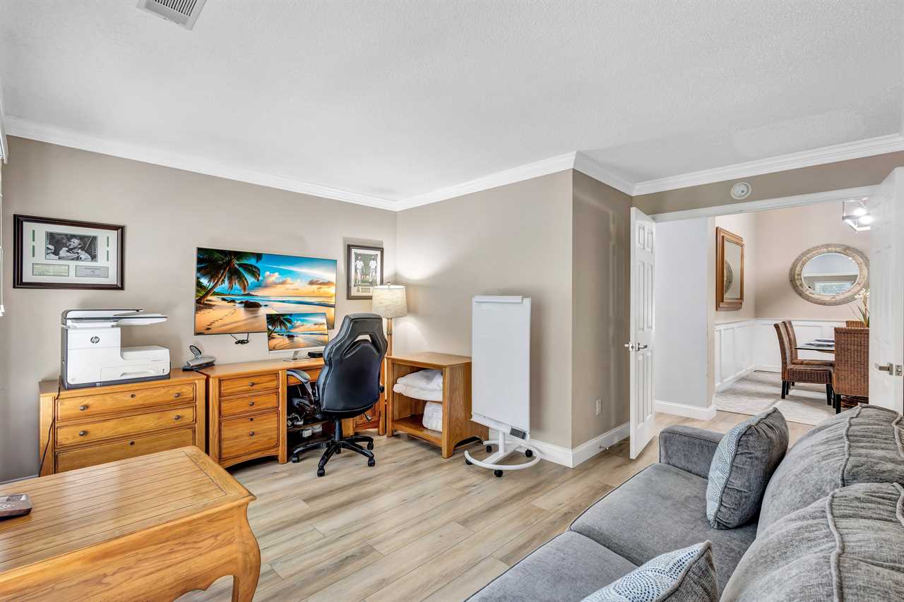 To the right of the main entrance, a dedicated office space provides both privacy and functionality. Equipped with a full desk setup, monitor, printer, and a sleeper sofa, it's ideal for remote work or accommodating extra guests, seamlessly balancing convenience and comfort.