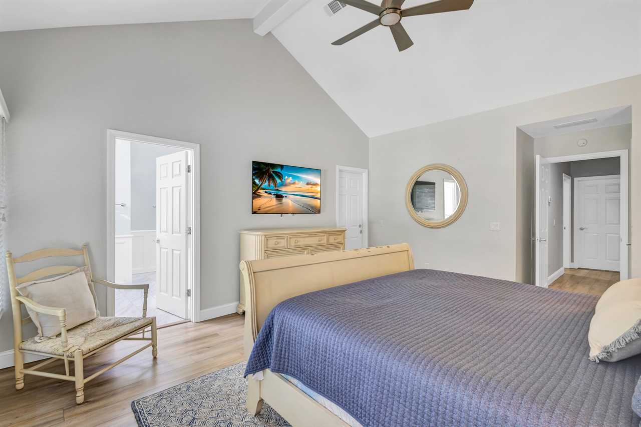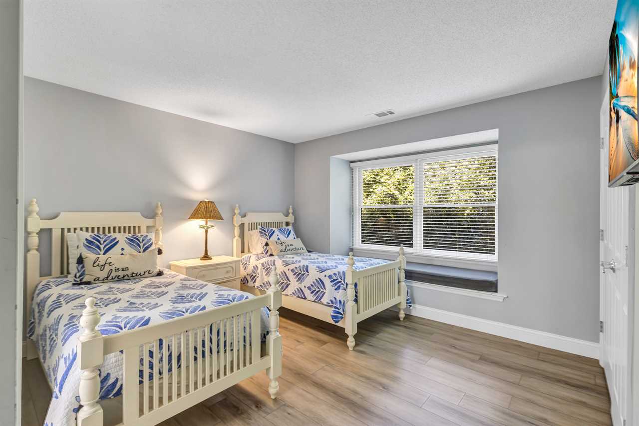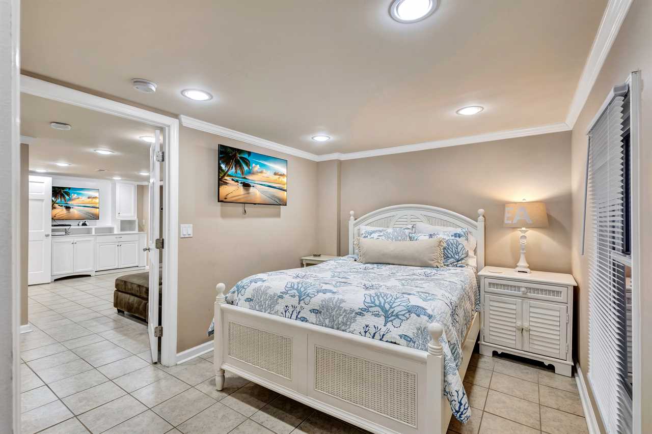 This home's thoughtfully arranged sleeping quarters ensure comfort and privacy for everyone. The first floor's layout features 2 luxurious primary suites with a king bed, TV, and en-suite bathrooms. Nearby, two additional bedrooms offer versatile sleeping options—one with a cozy queen bed and another with two twin beds, each with its own TV. The hall bathroom with a walk-in shower and double vanity is conveniently located for easy access.