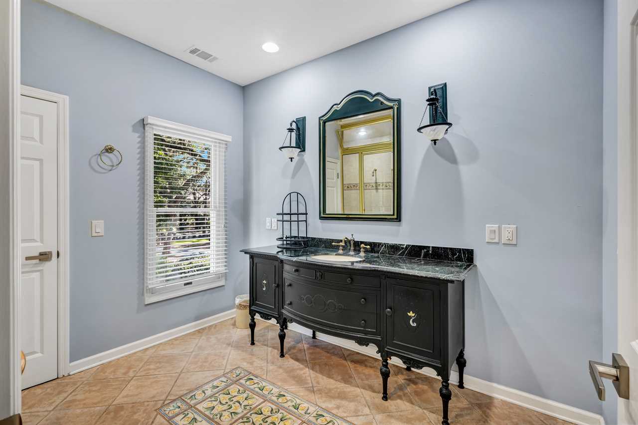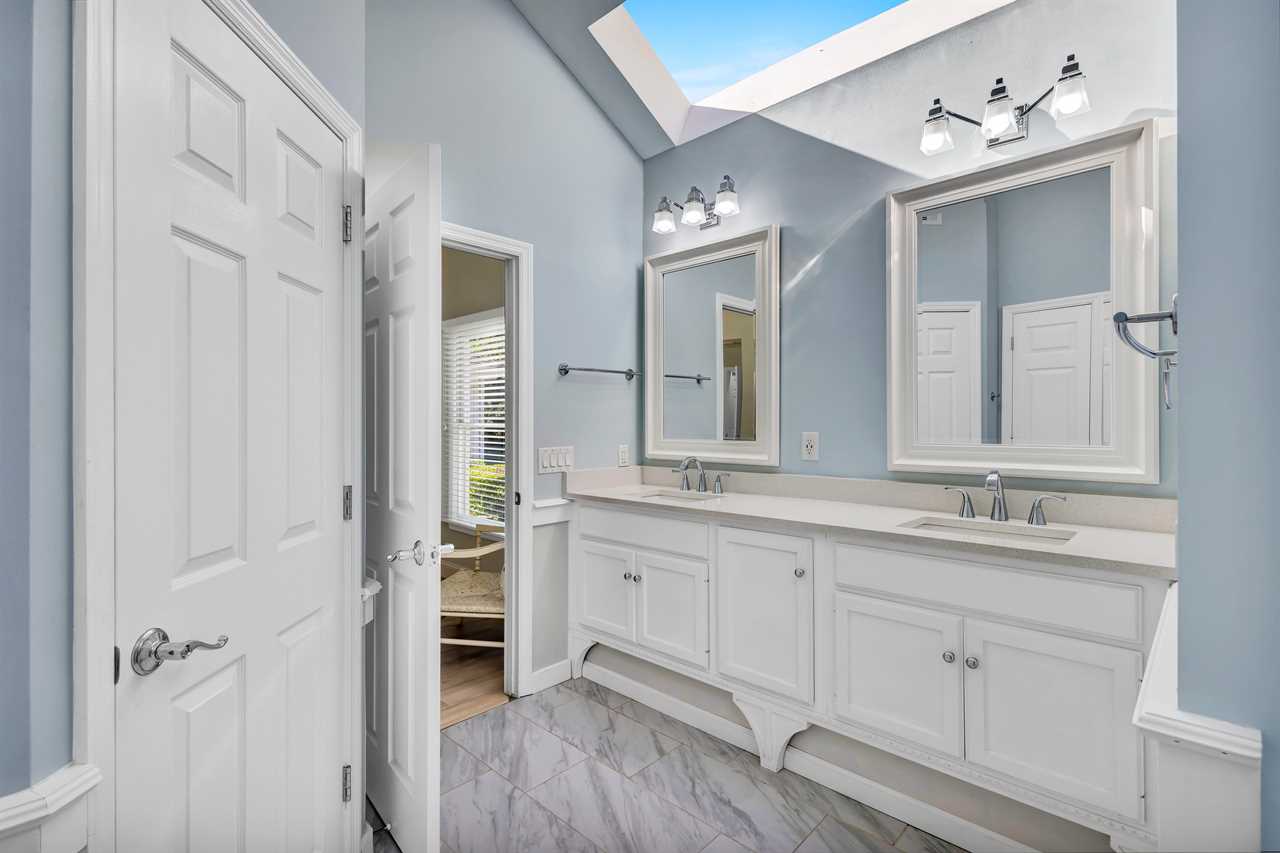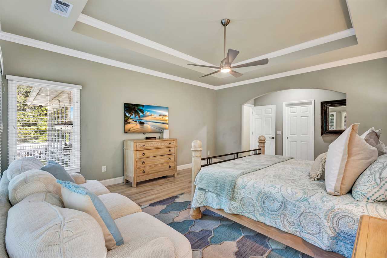 This home's thoughtfully arranged sleeping quarters ensure comfort and privacy for everyone. The first floor's layout features 2 luxurious primary suites with a king bed, TV, and en-suite bathrooms. Nearby, two additional bedrooms offer versatile sleeping options—one with a cozy queen bed and another with two twin beds, each with its own TV. The hall bathroom with a walk-in shower and double vanity is conveniently located for easy access.