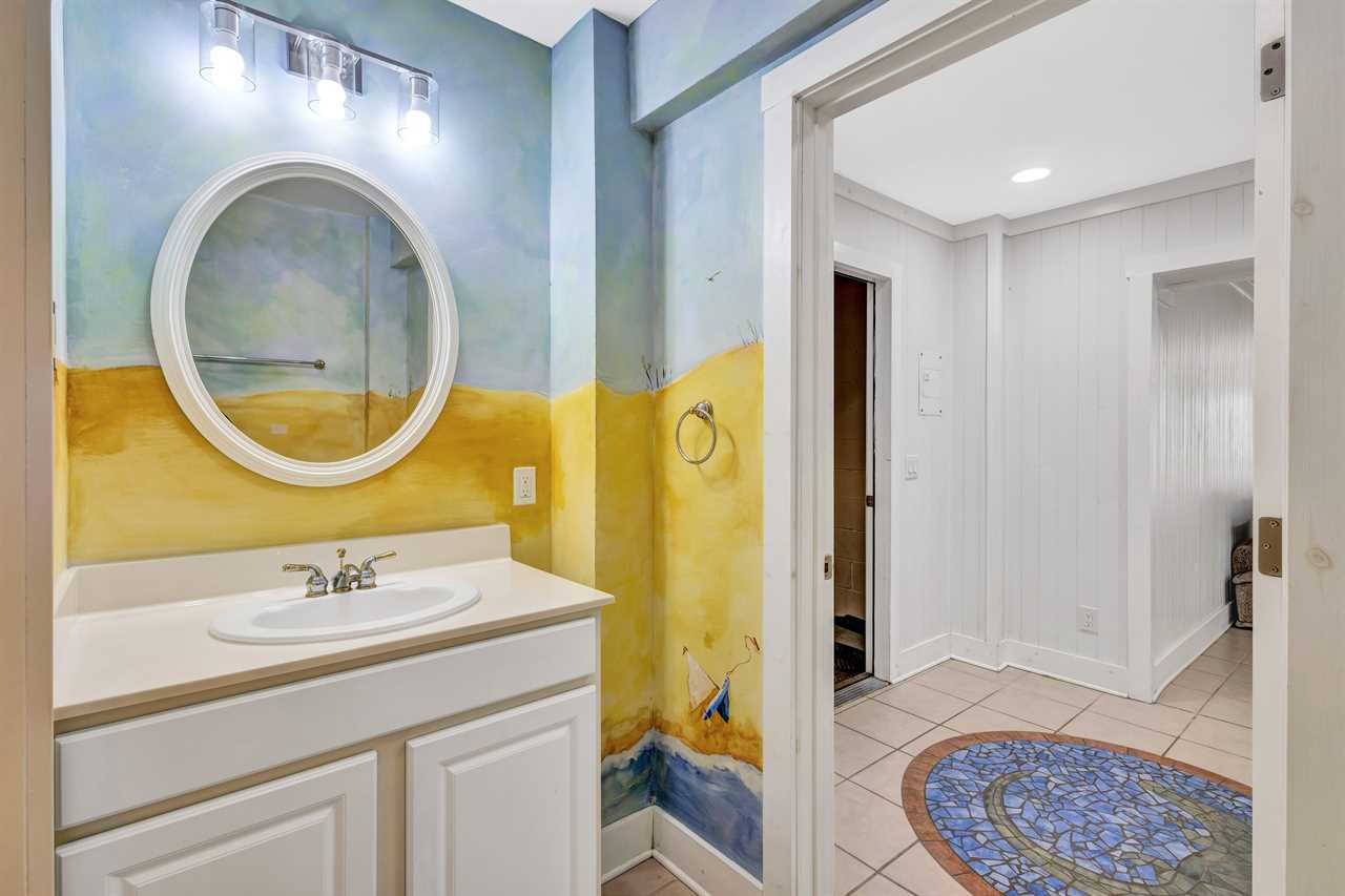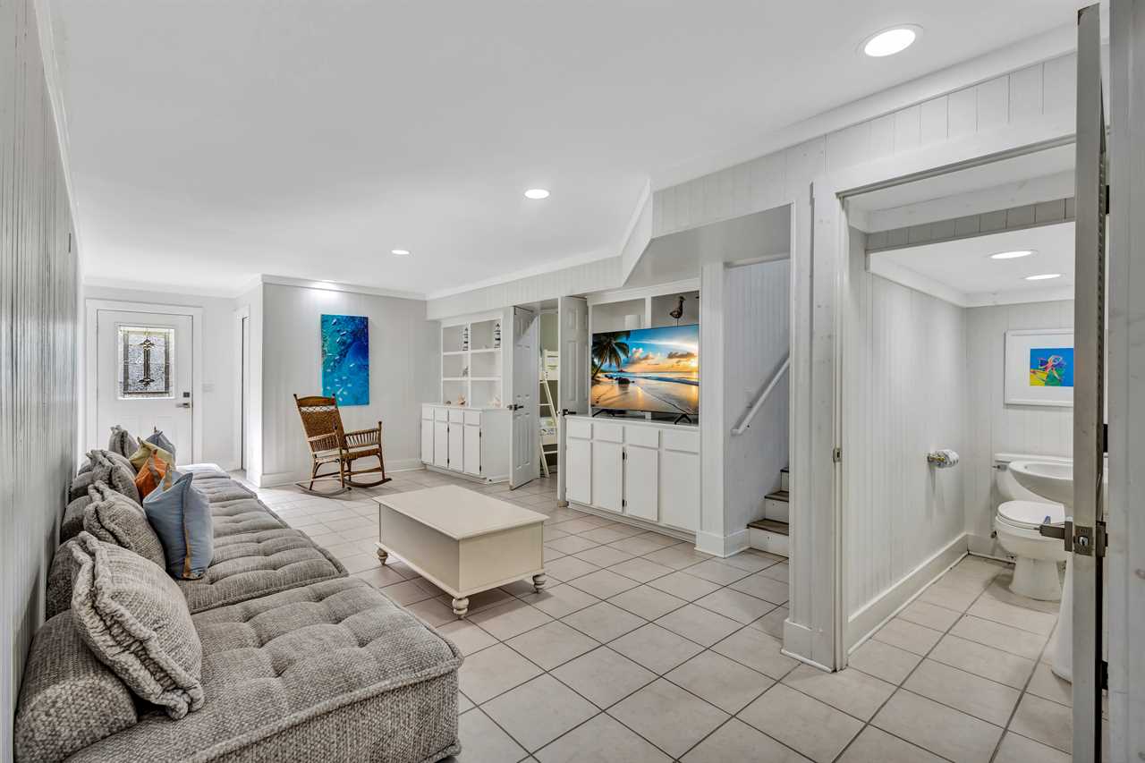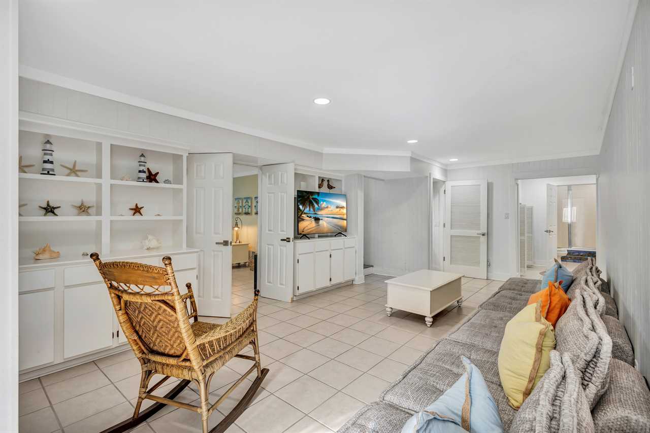 On the ground floor, two distinct wings provide ideal spaces for larger groups or families with children. The left side includes a queen bedroom with a TV, as well as a fun bunk room with four twin beds, perfect for kids or teens. Both are close to the hall bathroom, featuring a walk-in shower. Across on the right side, another bunk room awaits with four twin beds and a TV, along with a nearby hall bathroom and a half bath for added convenience.