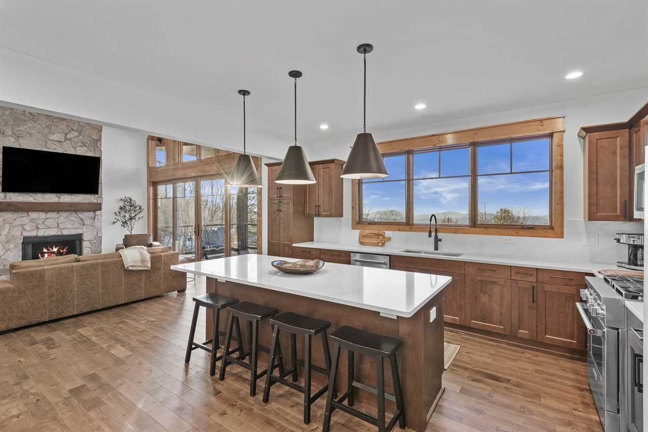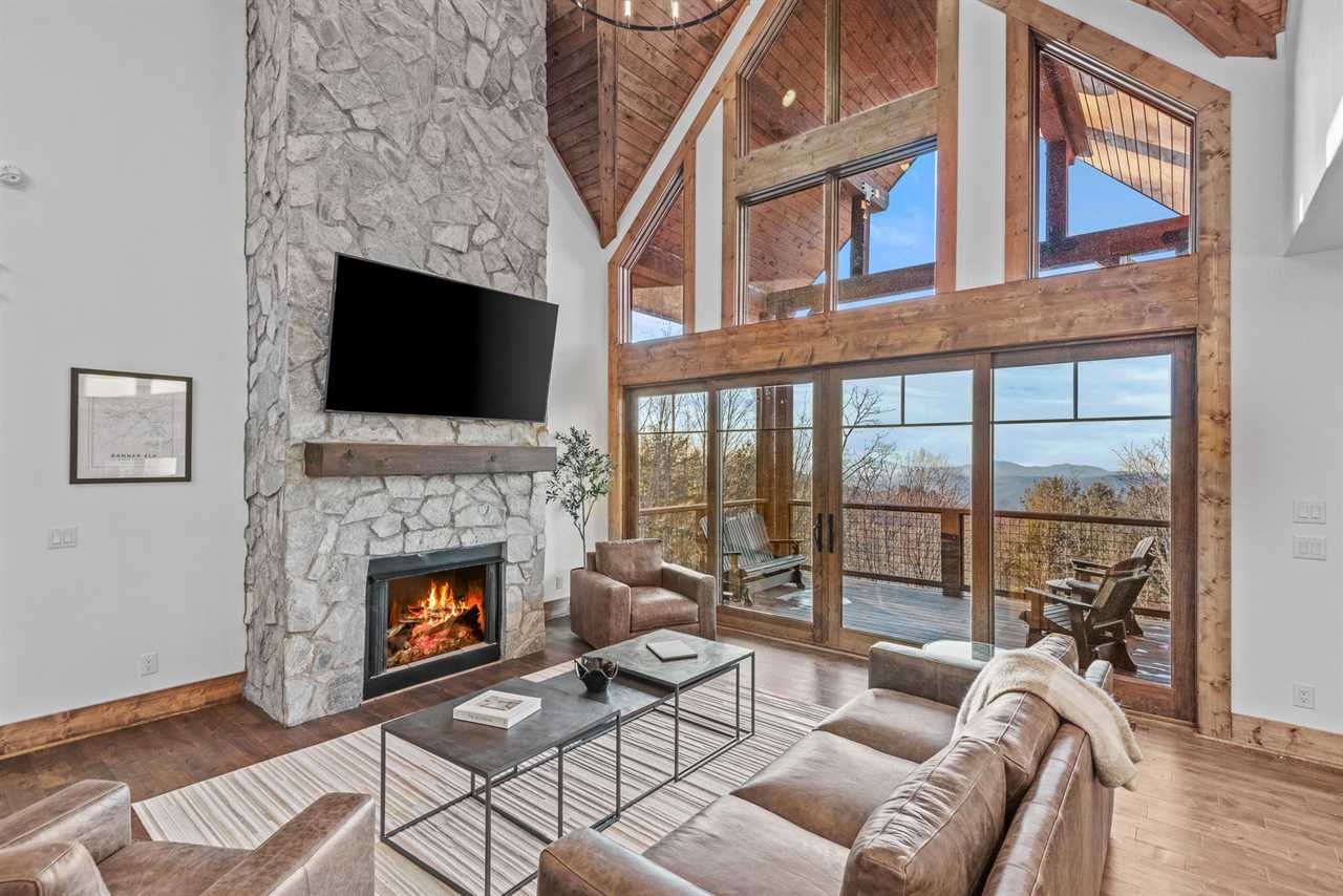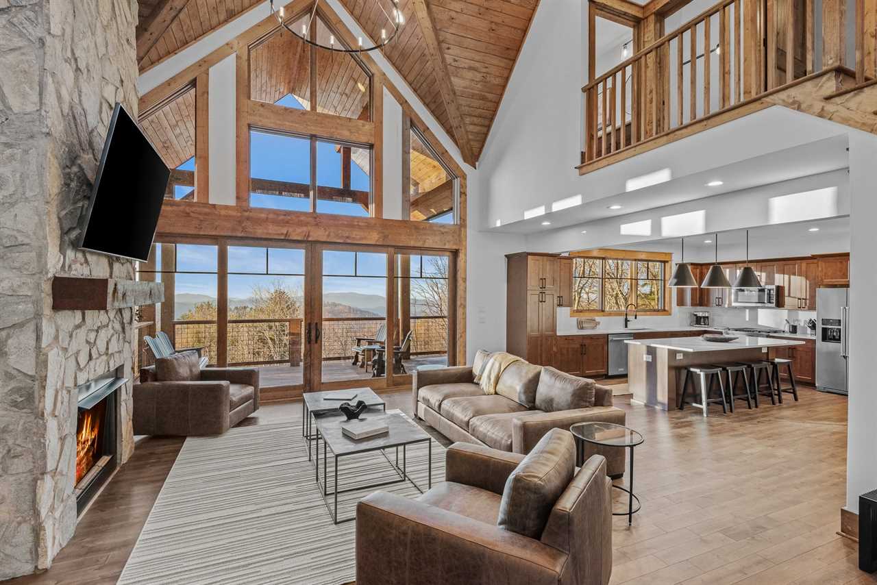 Sunset View Retreat, located in the Vineyard Reserve of Eagles Nest in Banner Elk, NC, is a comfortable yet refined mountain retreat. The inviting living room, warmed by a gas log fireplace, features a leather sofa and two swivel chairs, all flowing seamlessly into the dining area and kitchen. The kitchen is equipped with a large granite island with four barstools, and the dining table comfortably seats all eight guests, creating a perfect setup for gathering over meals.
