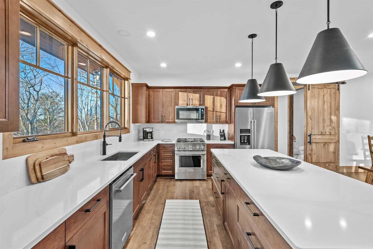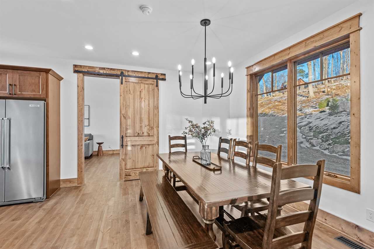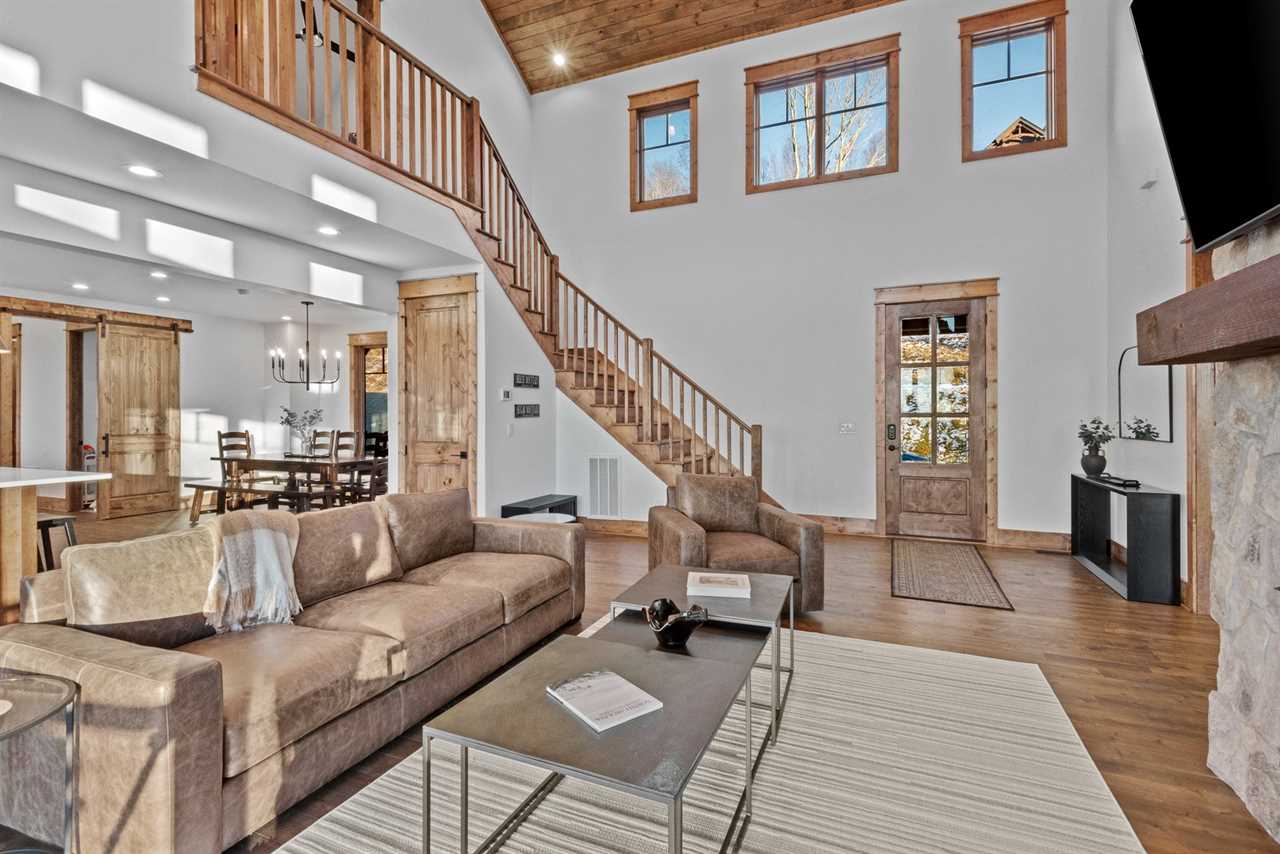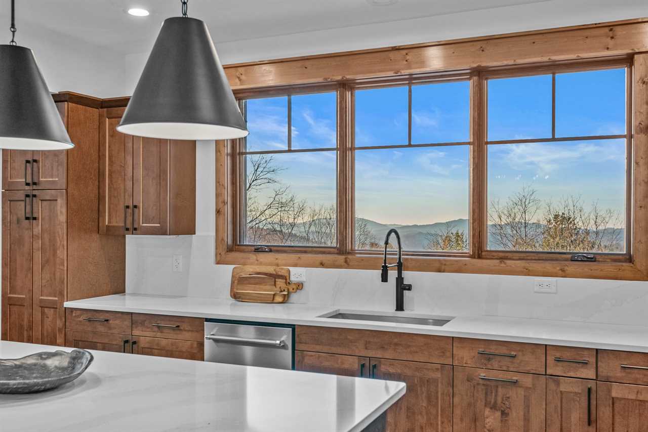 Sunset View Retreat, located in the Vineyard Reserve of Eagles Nest in Banner Elk, NC, is a comfortable yet refined mountain retreat. The inviting living room, warmed by a gas log fireplace, features a leather sofa and two swivel chairs, all flowing seamlessly into the dining area and kitchen. The kitchen is equipped with a large granite island with four barstools, and the dining table comfortably seats all eight guests, creating a perfect setup for gathering over meals.