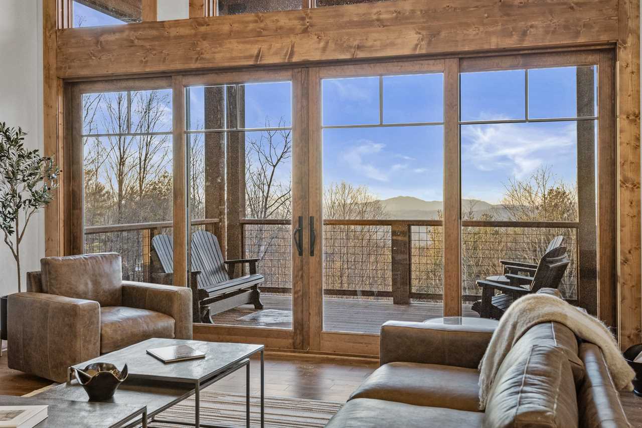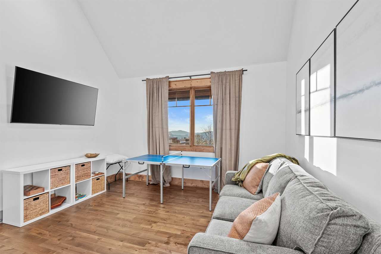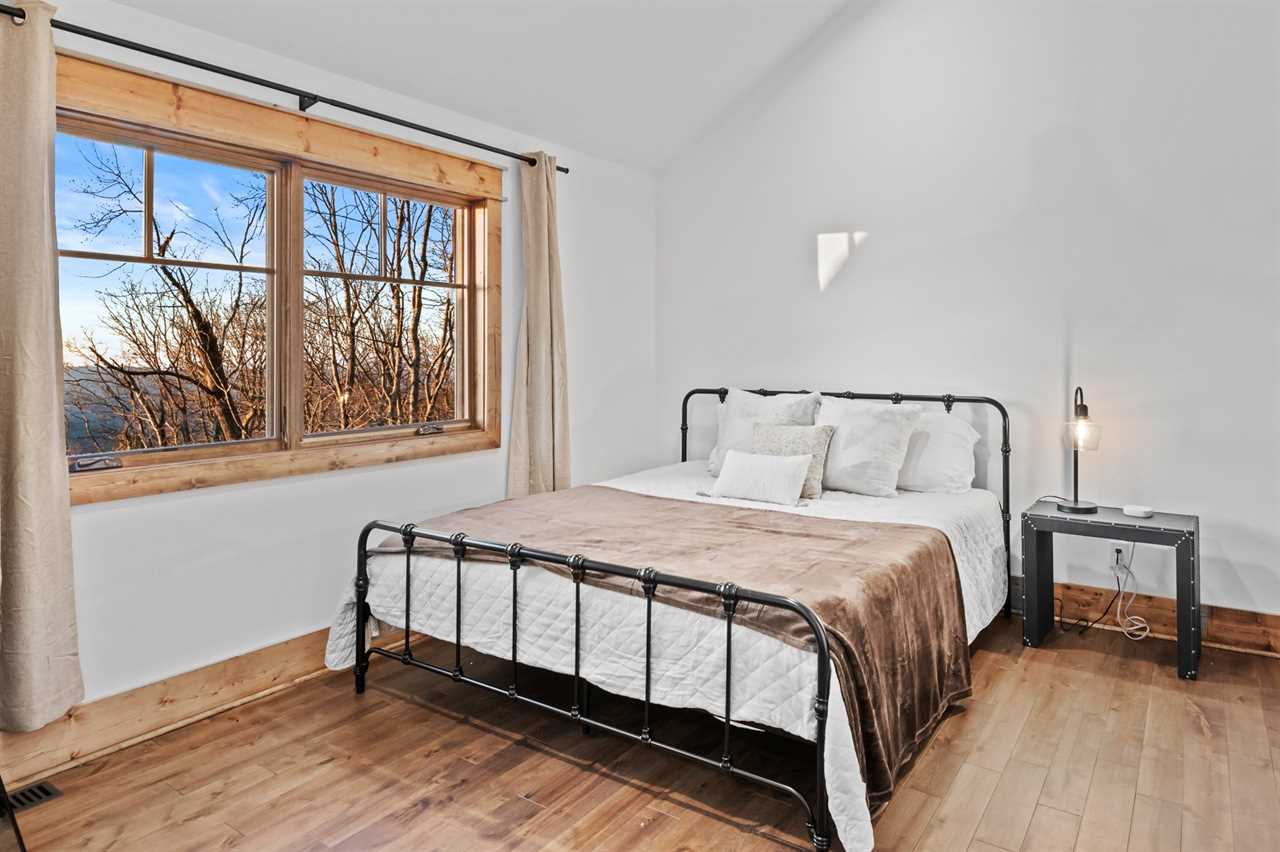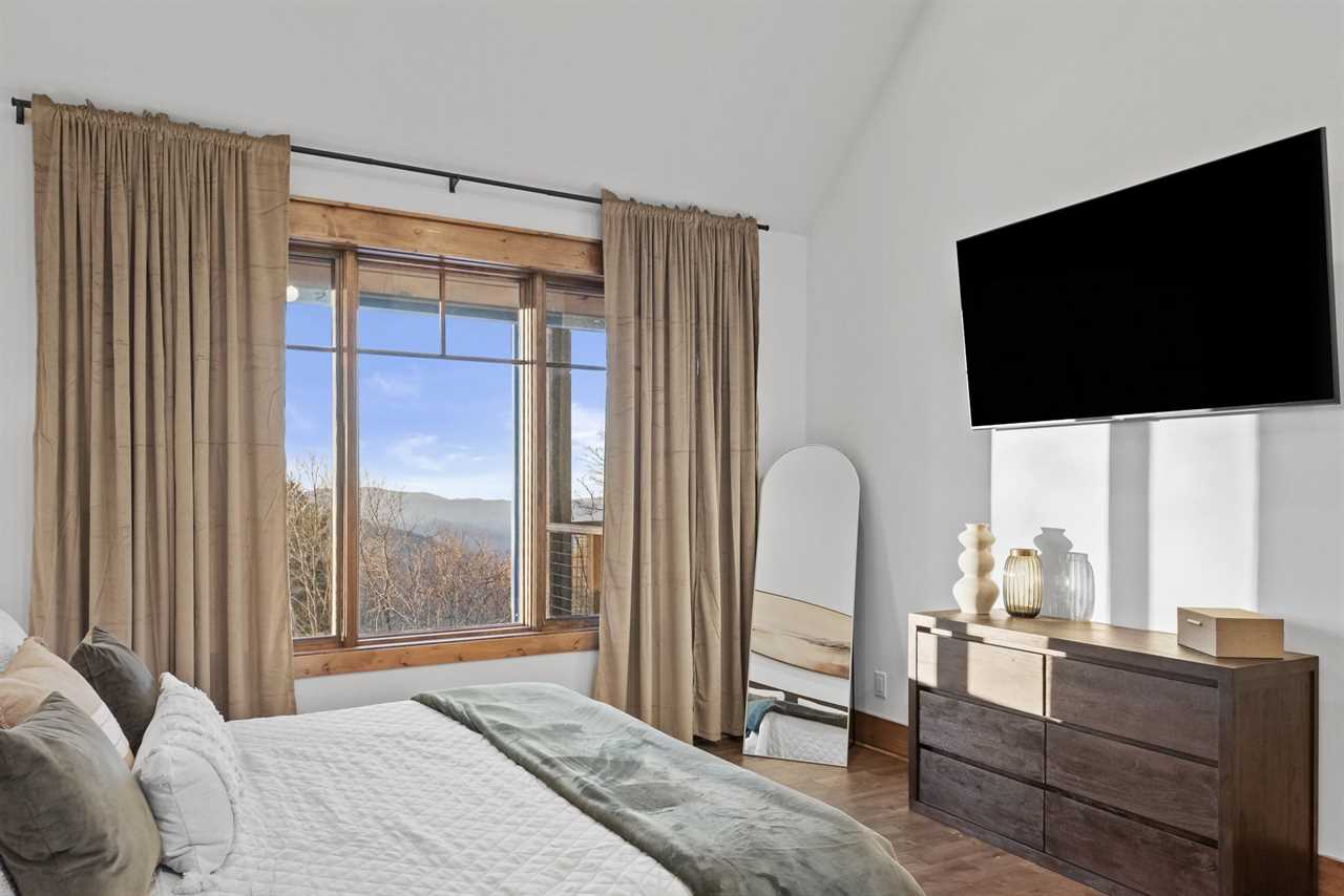 For accommodations, the main level includes a king suite with large windows that capture sweeping views toward Tennessee. This bedroom offers a ceiling fan and a wall-mounted TV for added comfort, along with an ensuite bathroom with a double granite vanity and a tiled shower. On the opposite side of the main floor, a second cozy space doubles as a TV lounge, complete with a plush couch that converts to a queen-sized pullout bed. An attached bathroom features a tiled tub/shower combination and granite counters, providing both convenience and style.