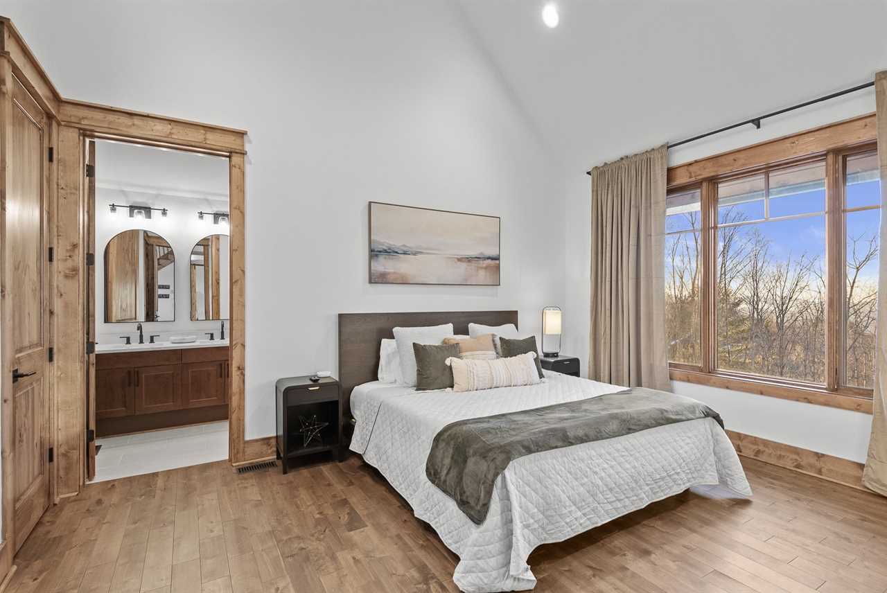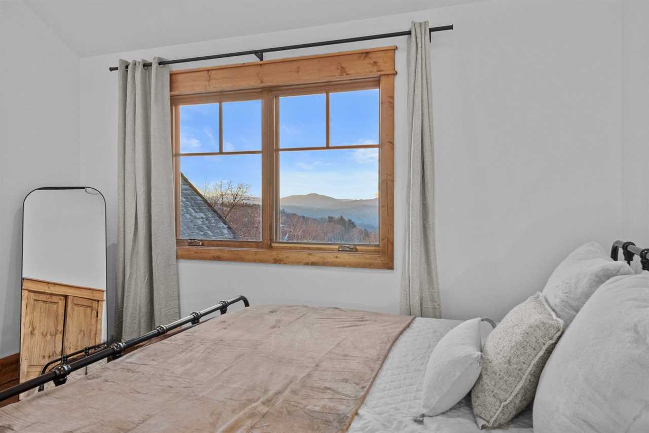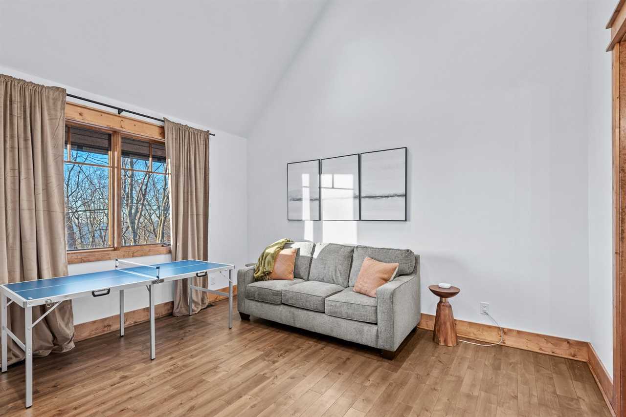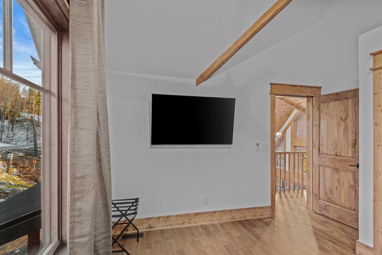 For accommodations, the main level includes a king suite with large windows that capture sweeping views toward Tennessee. This bedroom offers a ceiling fan and a wall-mounted TV for added comfort, along with an ensuite bathroom with a double granite vanity and a tiled shower. On the opposite side of the main floor, a second cozy space doubles as a TV lounge, complete with a plush couch that converts to a queen-sized pullout bed. An attached bathroom features a tiled tub/shower combination and granite counters, providing both convenience and style.