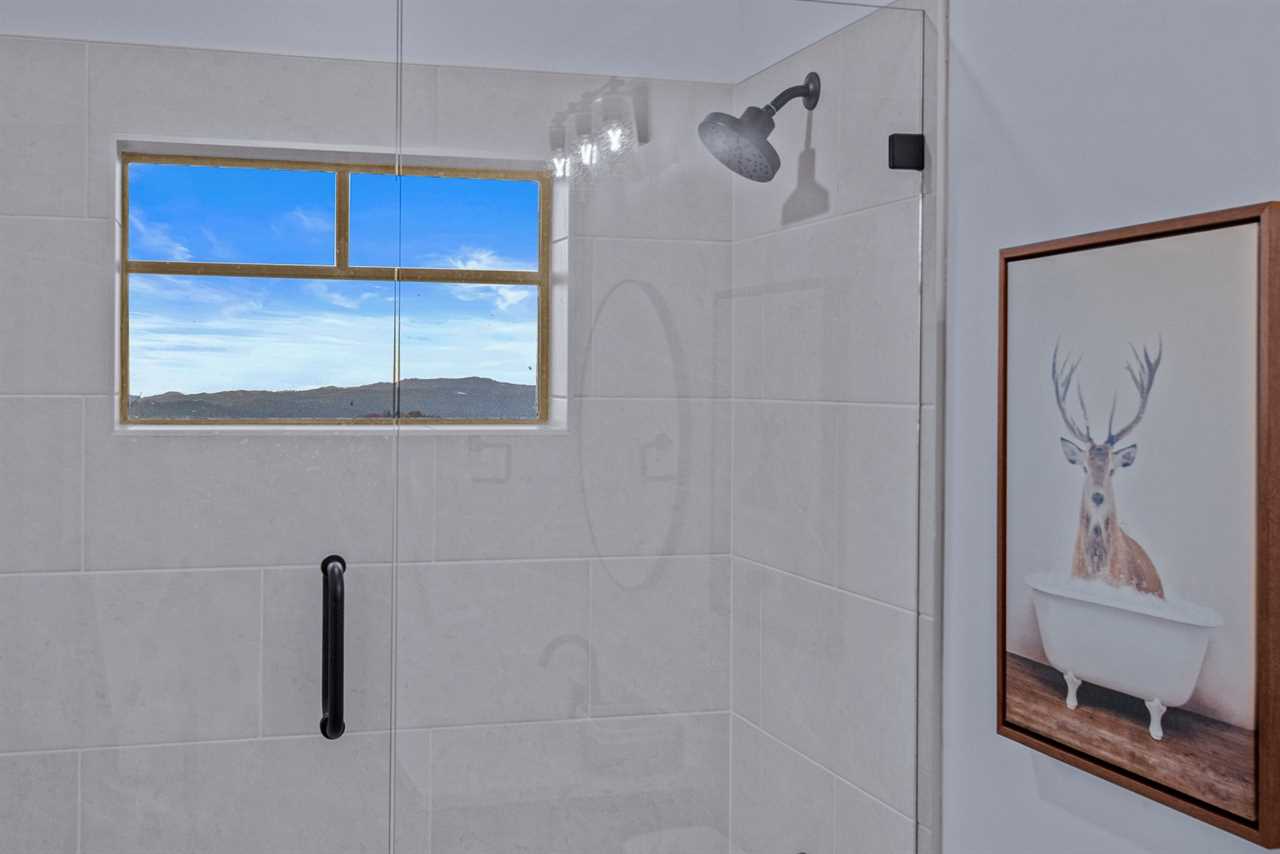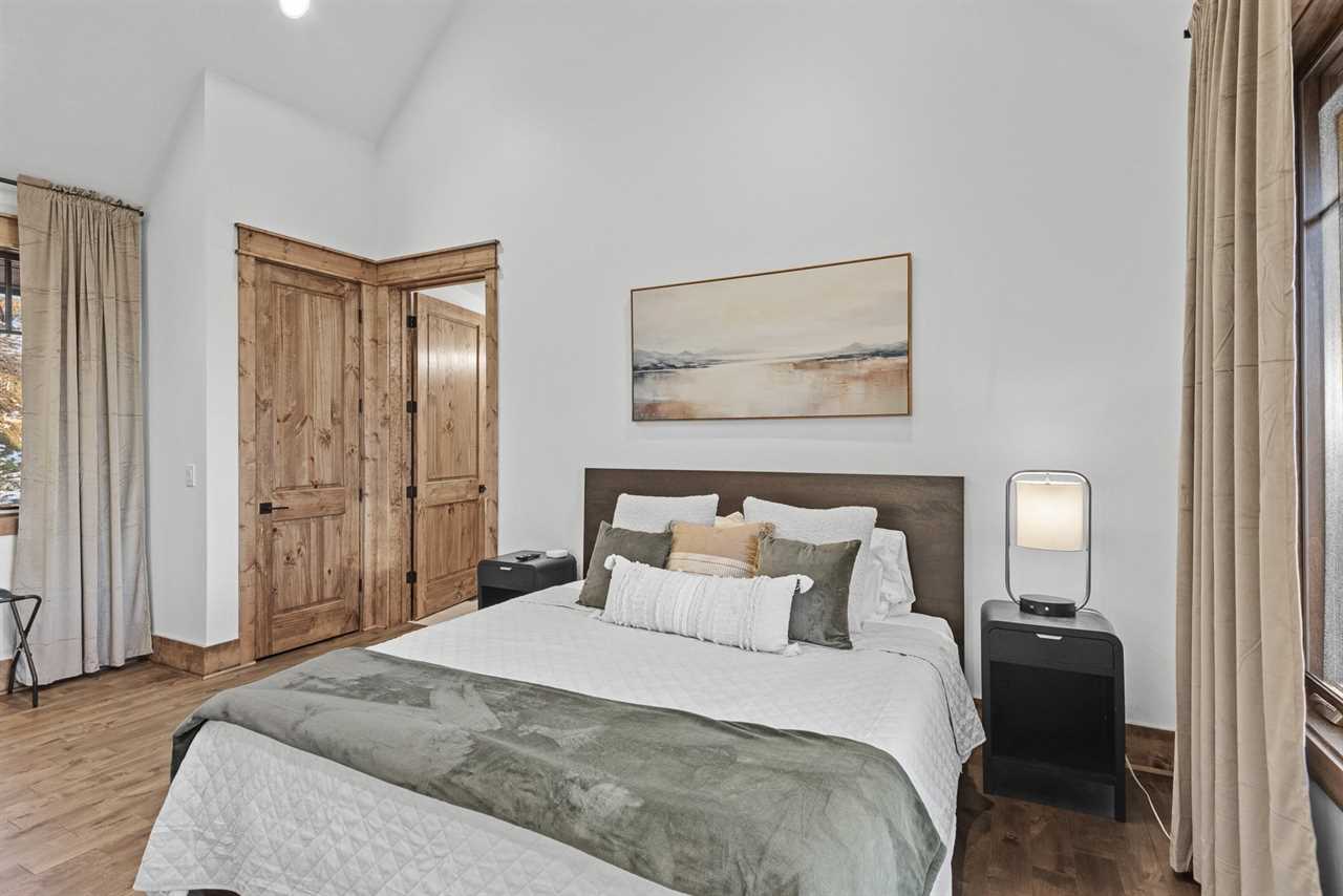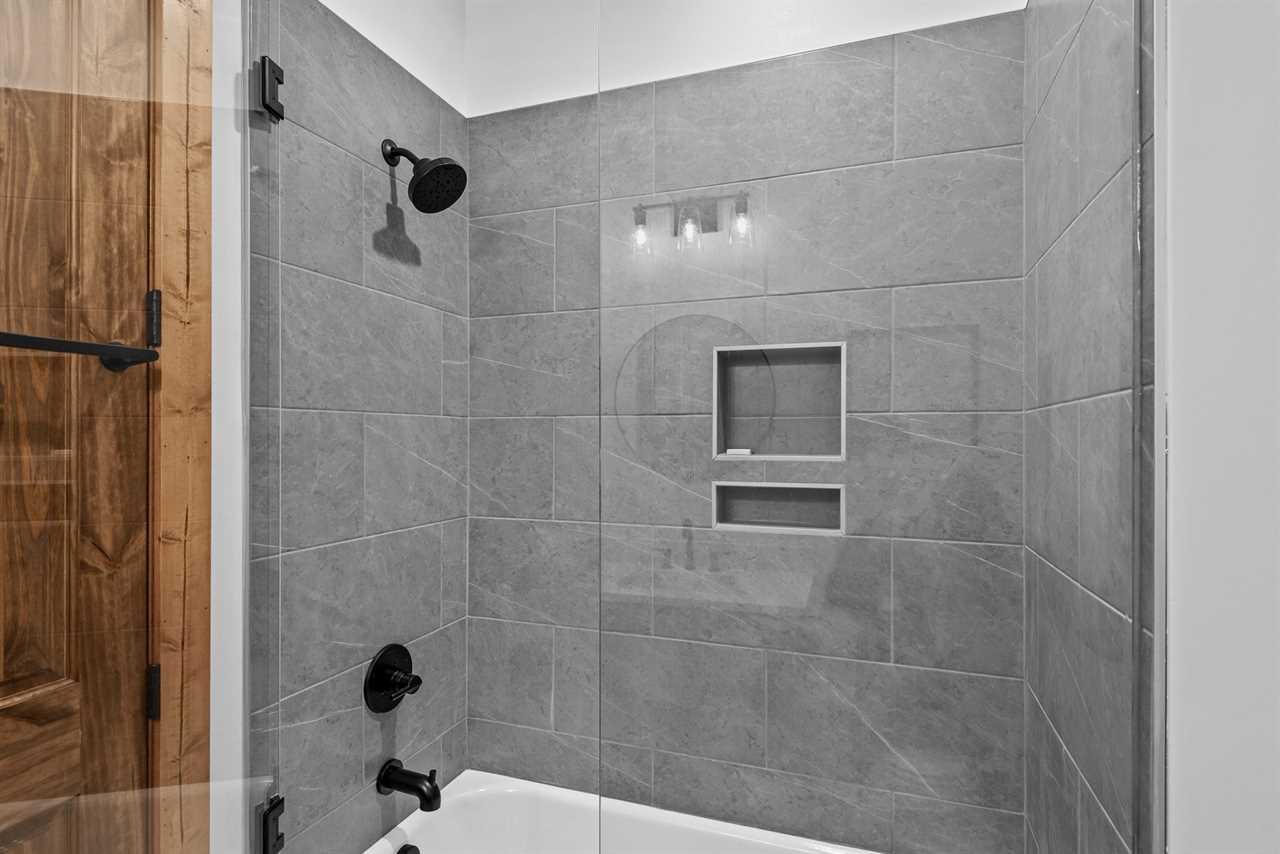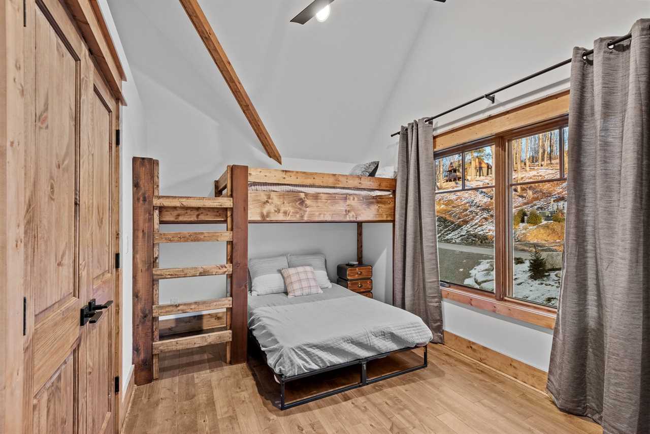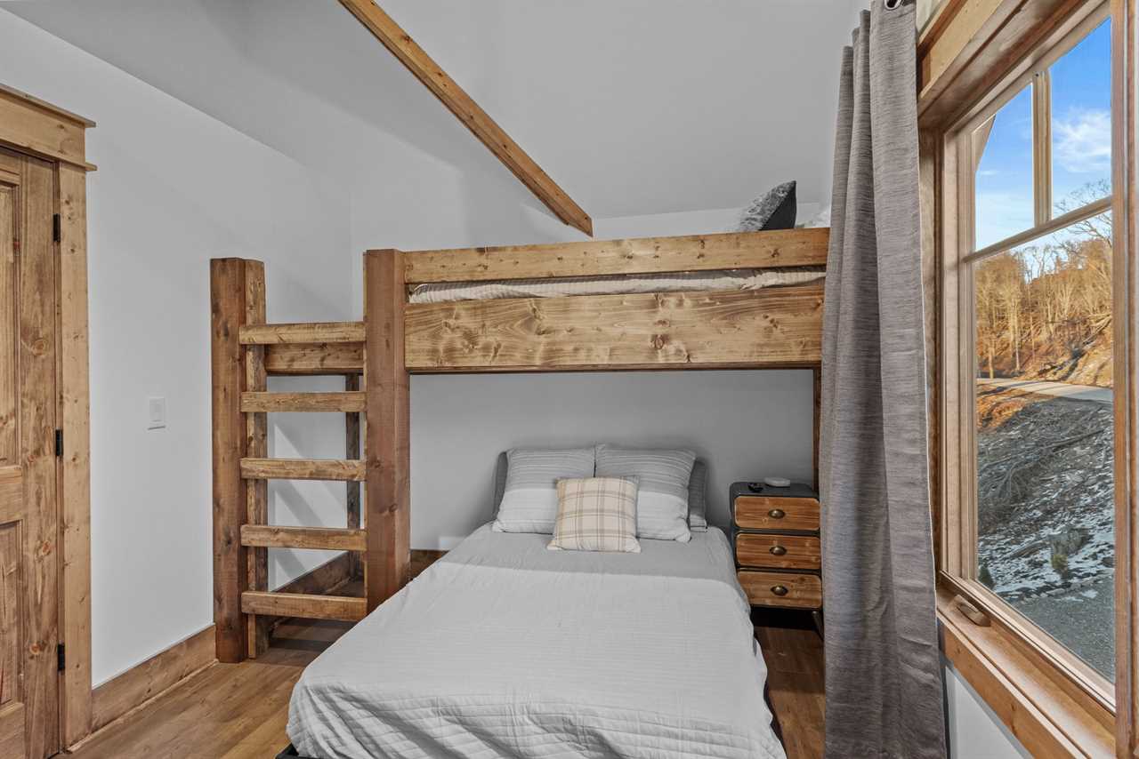 Upstairs, guests will find two additional bedrooms and a shared full bathroom in the hallway. The second king bedroom offers mountain views, a ceiling fan, and a TV, while the bunk room includes a twin-over-full bed, a ceiling fan, and a TV—ideal for families or friends traveling together.