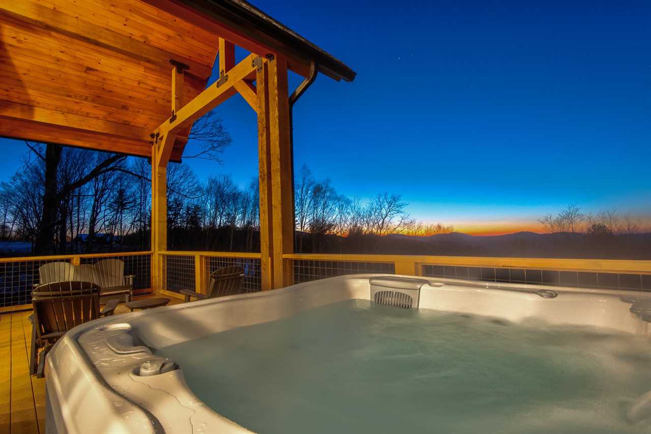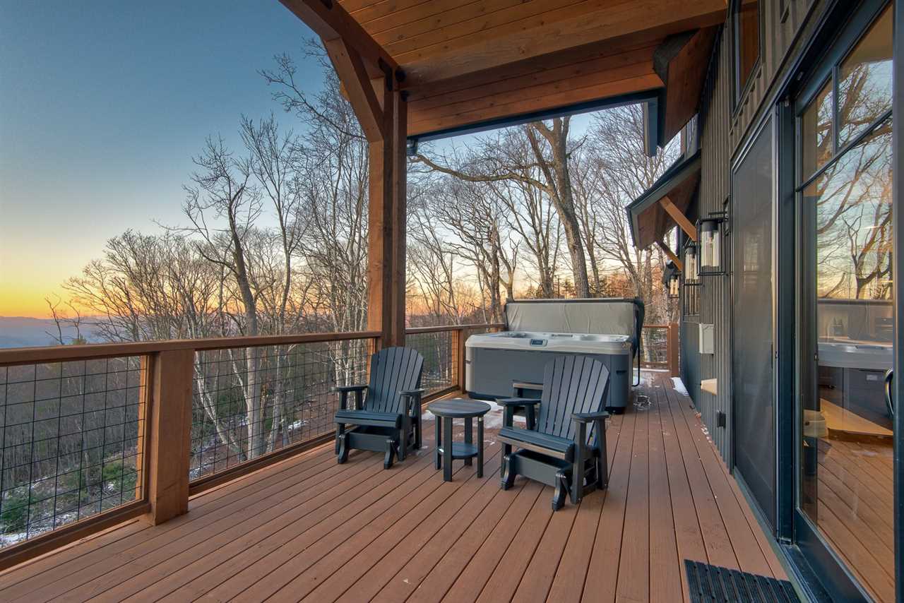 Outside, the deck is an ideal spot for relaxing with a glass of wine from the nearby Eagles Nest Winery, which is only a two-minute drive or a small hike away. Relax in the premium BullFrog Spas hot tub. From the deck, steps lead down to the grounds, where a scenic path takes you to the firepit area with chairs—perfect for enjoying quiet evenings under the stars. Sunset View Retreat is a warm and welcoming place to experience the beauty and serenity of Banner Elk.