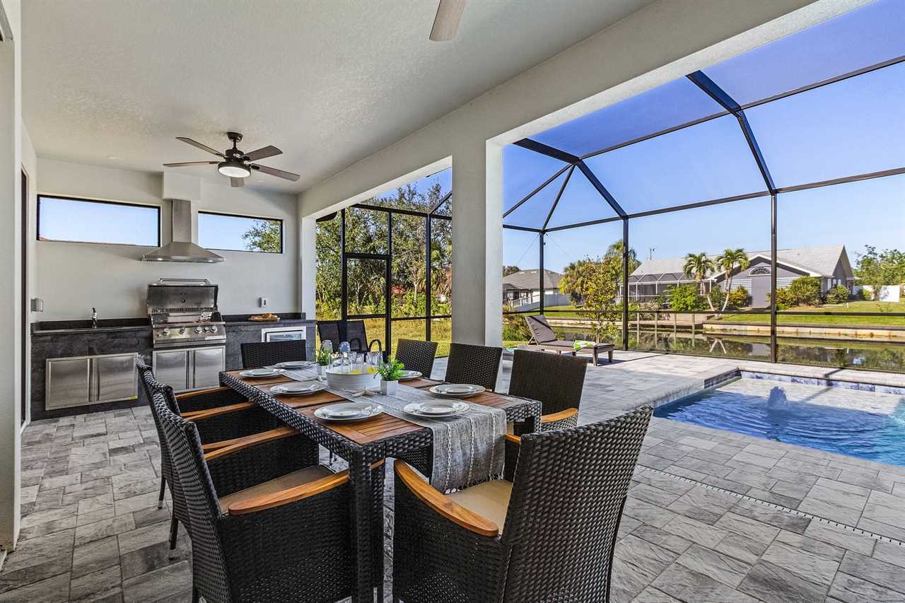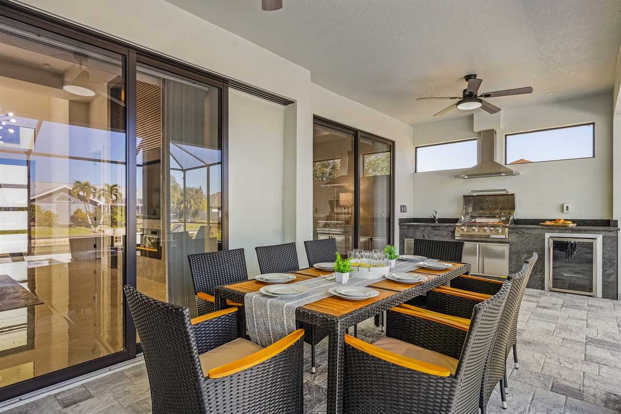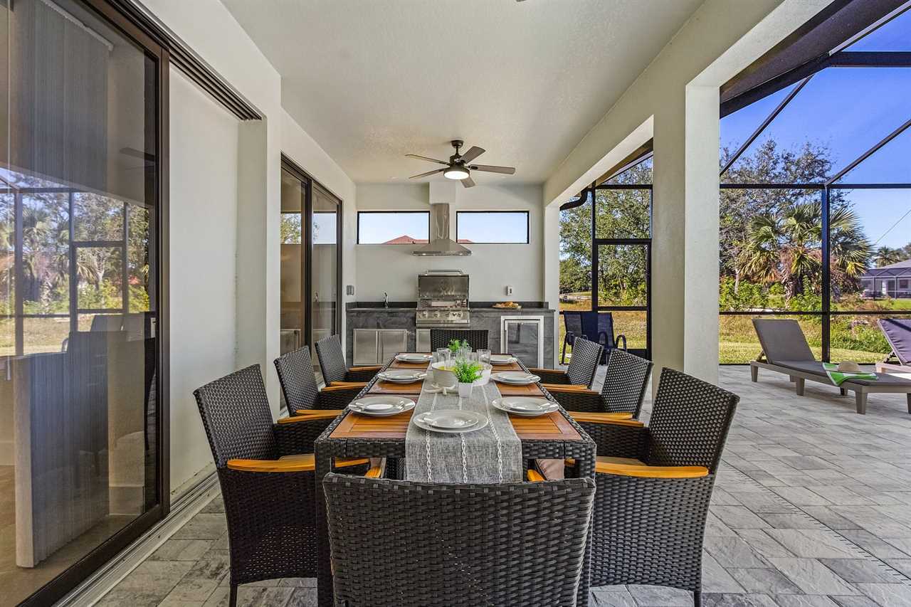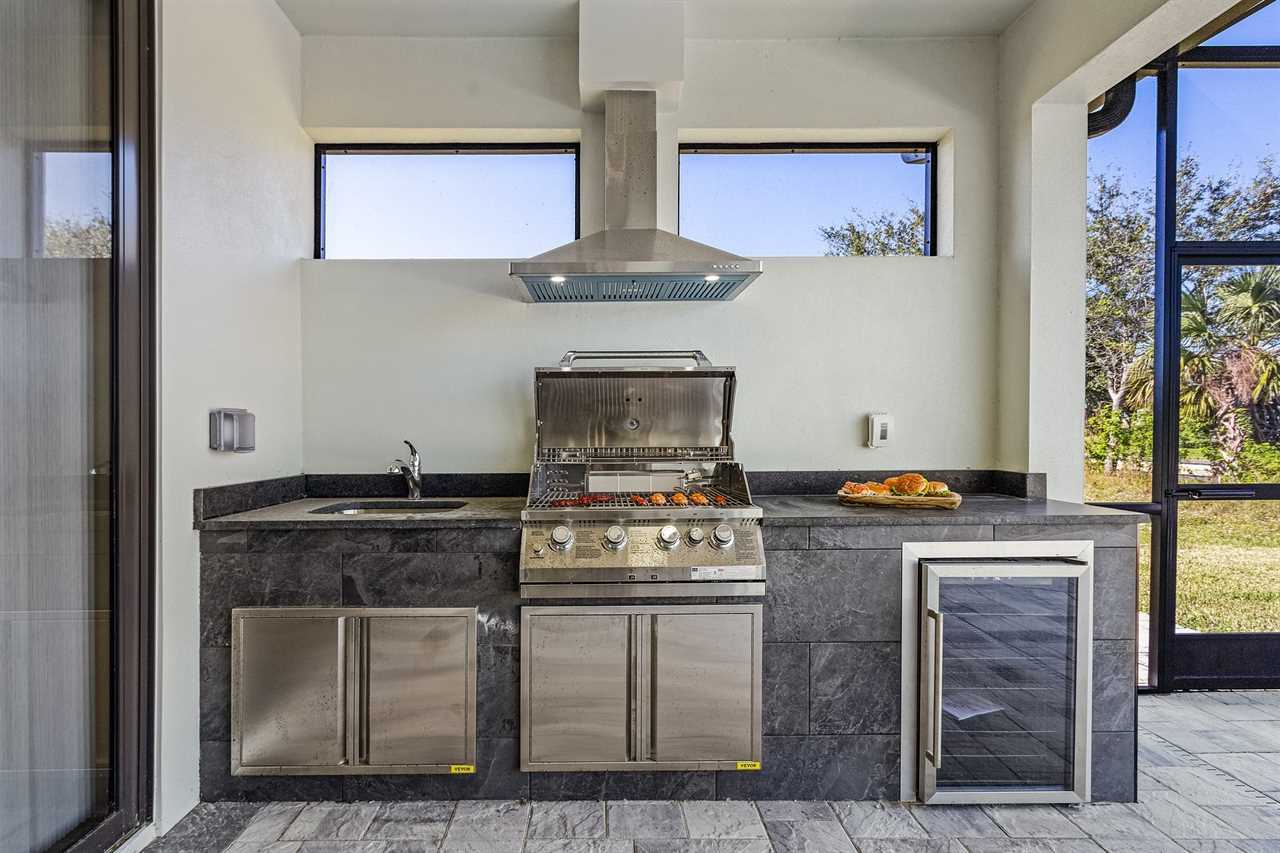 Lanai with Loungers, Custom outdoor Kitchen: This inviting area is perfect for relaxing in the sun or hosting friends and family. The outdoor kitchen makes cooking a breeze, whether you're grilling or preparing snacks. Coupled with a beautiful dining area, your lanai becomes the ultimate spot for alfresco meals and gatherings, allowing you to enjoy every moment in the great outdoors. Elevate your entertaining with this perfect outdoor retreat!