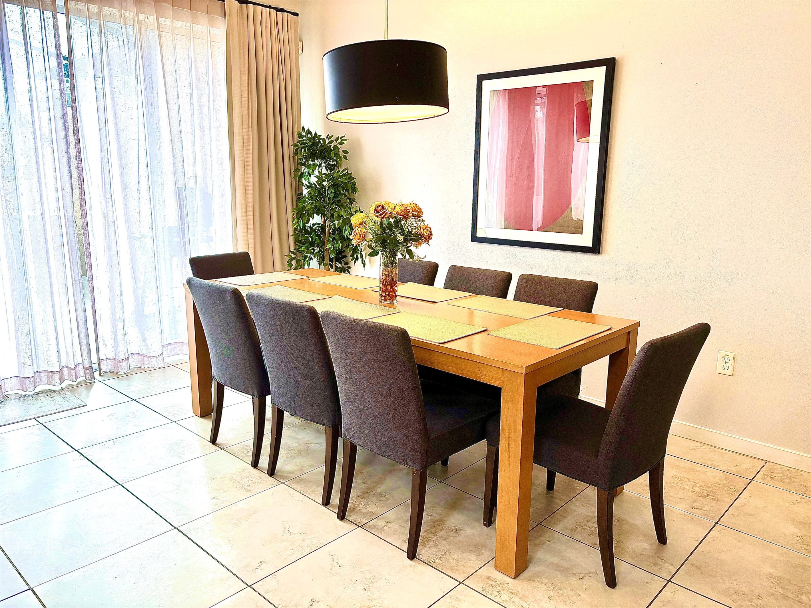 The well-appointed kitchen is a chef’s dream, complete with updated appliances, ample counter space, and all the essentials for cooking meals or preparing snacks. The open floor plan provides plenty of space for family gatherings, with a comfortable dining area and a cozy living room that’s perfect for relaxing after a fun-filled day.