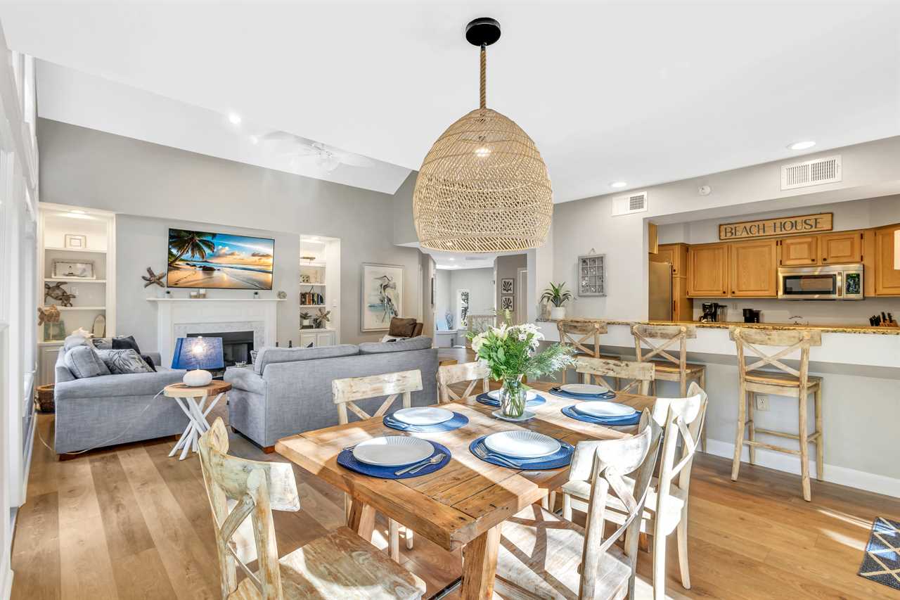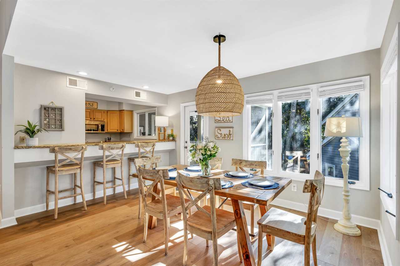 ✹ Fully Stocked Kitchen: Well-equipped with pass-through window to the porch, breakfast bar, and dining area seating for 6.