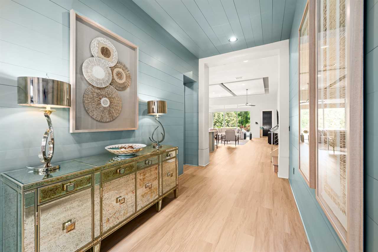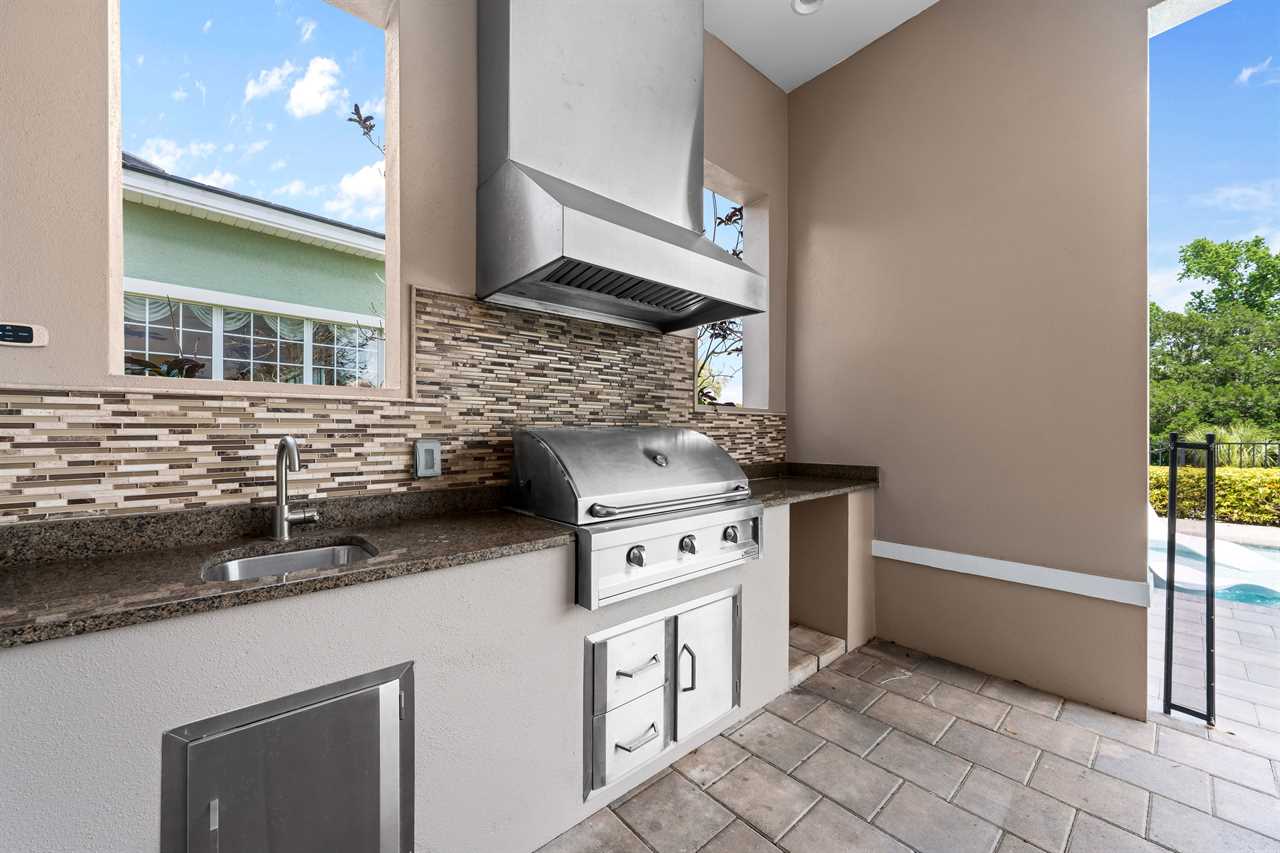 The outdoor area is designed for both leisure and social gatherings. Enjoy poolside meals at the outdoor dining table that seats ten, or lounge in the sun on plush chairs surrounding the pool with a spillover spa. The summer kitchen and inviting patio furniture add to the ease of outdoor living.