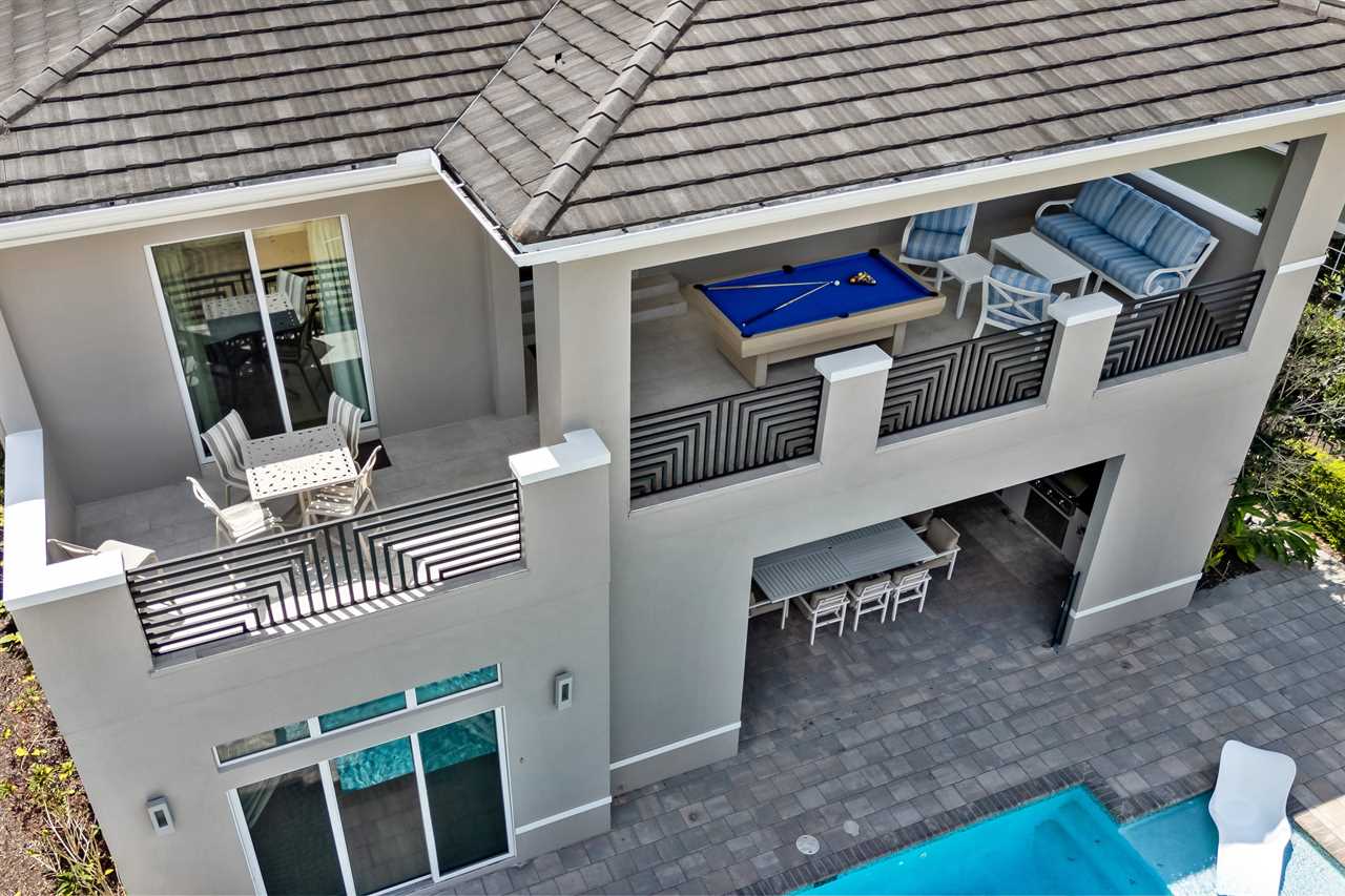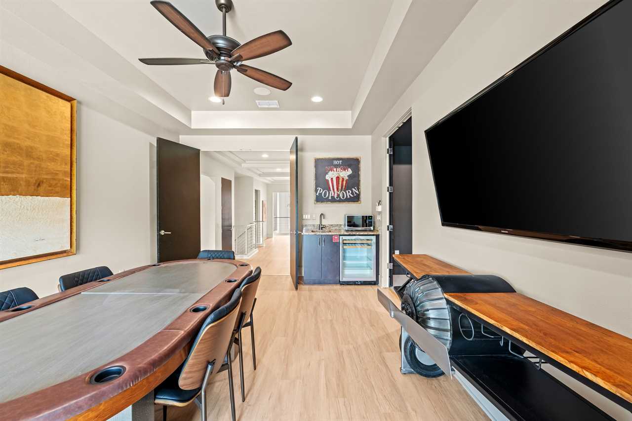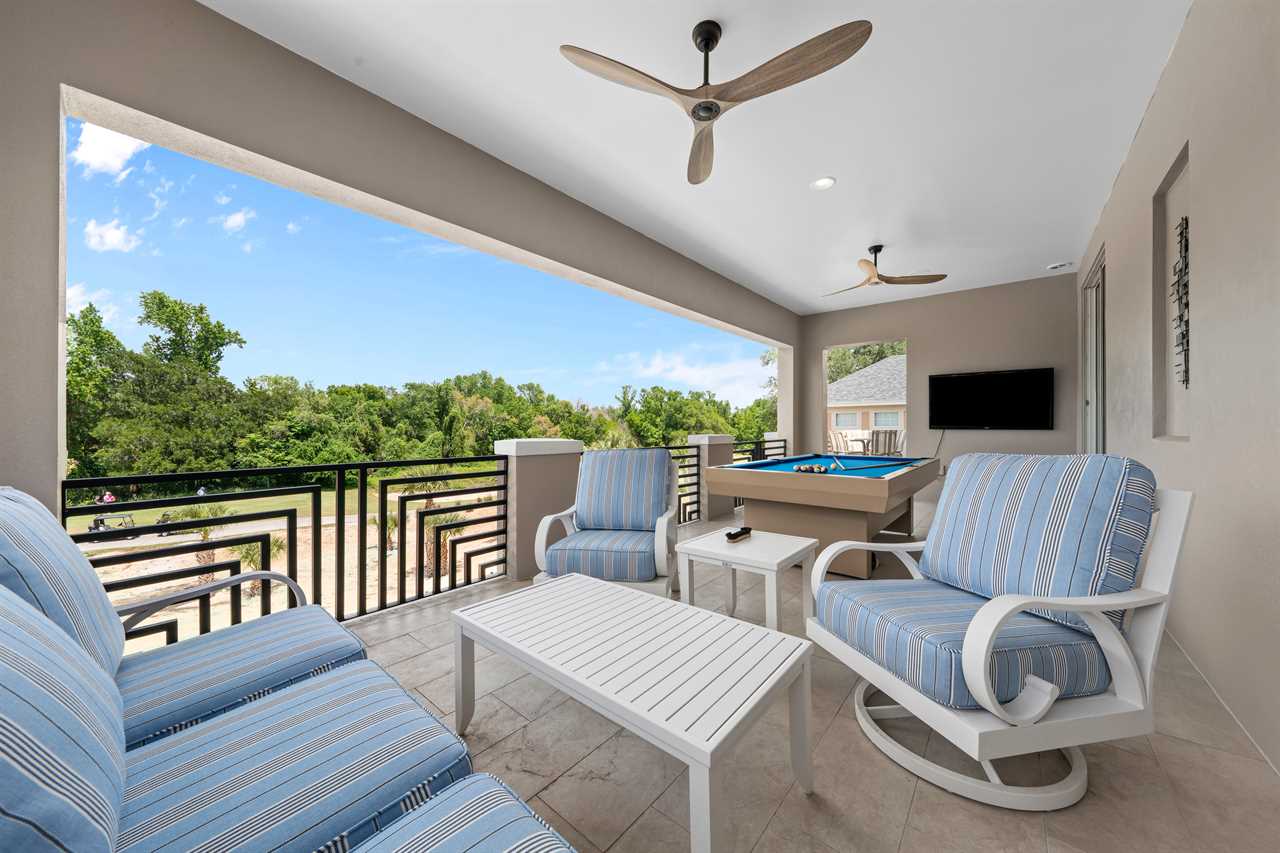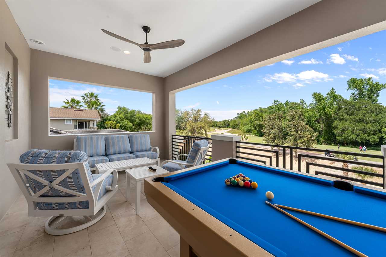 Entertainment continues upstairs with a private theater offering tiered seating for nine and a 110-inch projection screen. Just outside the theater, a dedicated lounge area includes a poker table, a smart TV, and a convenient wet bar complete with a fridge, sink, and microwave. The upper-level balcony features an outdoor pool table, more lounge seating, and another smart TV—perfect for evening games or watching the sunset in comfort.