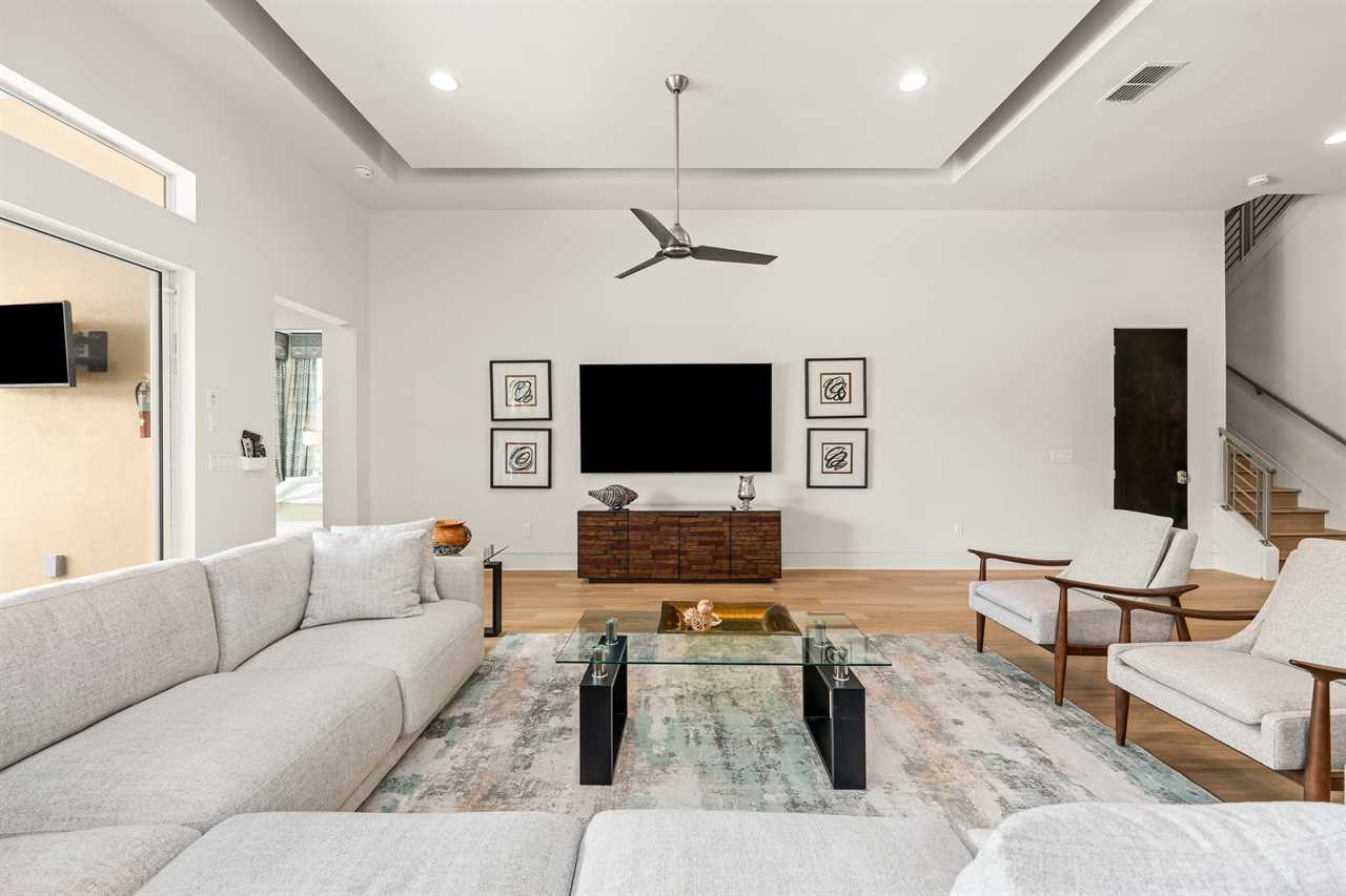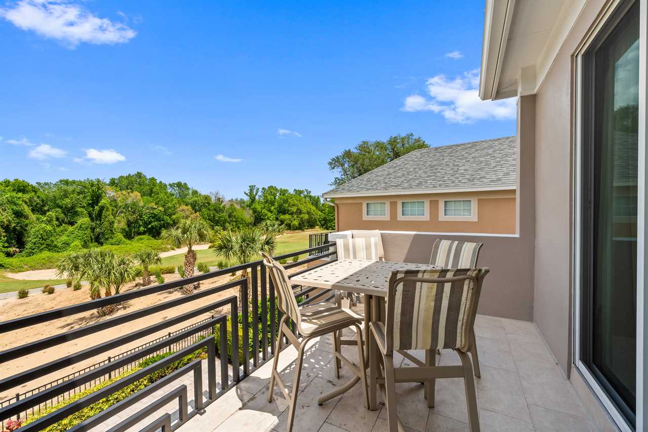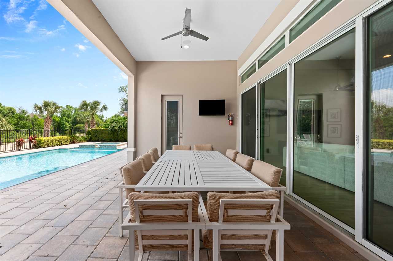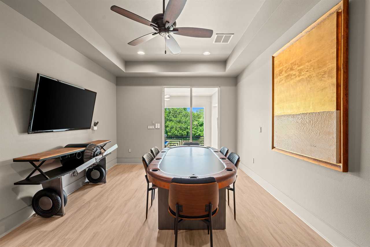 Entertainment continues upstairs with a private theater offering tiered seating for nine and a 110-inch projection screen. Just outside the theater, a dedicated lounge area includes a poker table, a smart TV, and a convenient wet bar complete with a fridge, sink, and microwave. The upper-level balcony features an outdoor pool table, more lounge seating, and another smart TV—perfect for evening games or watching the sunset in comfort.