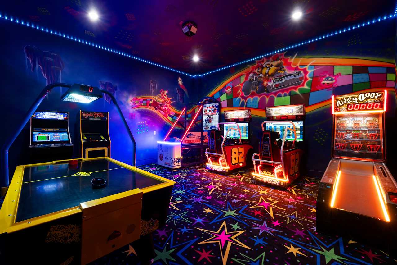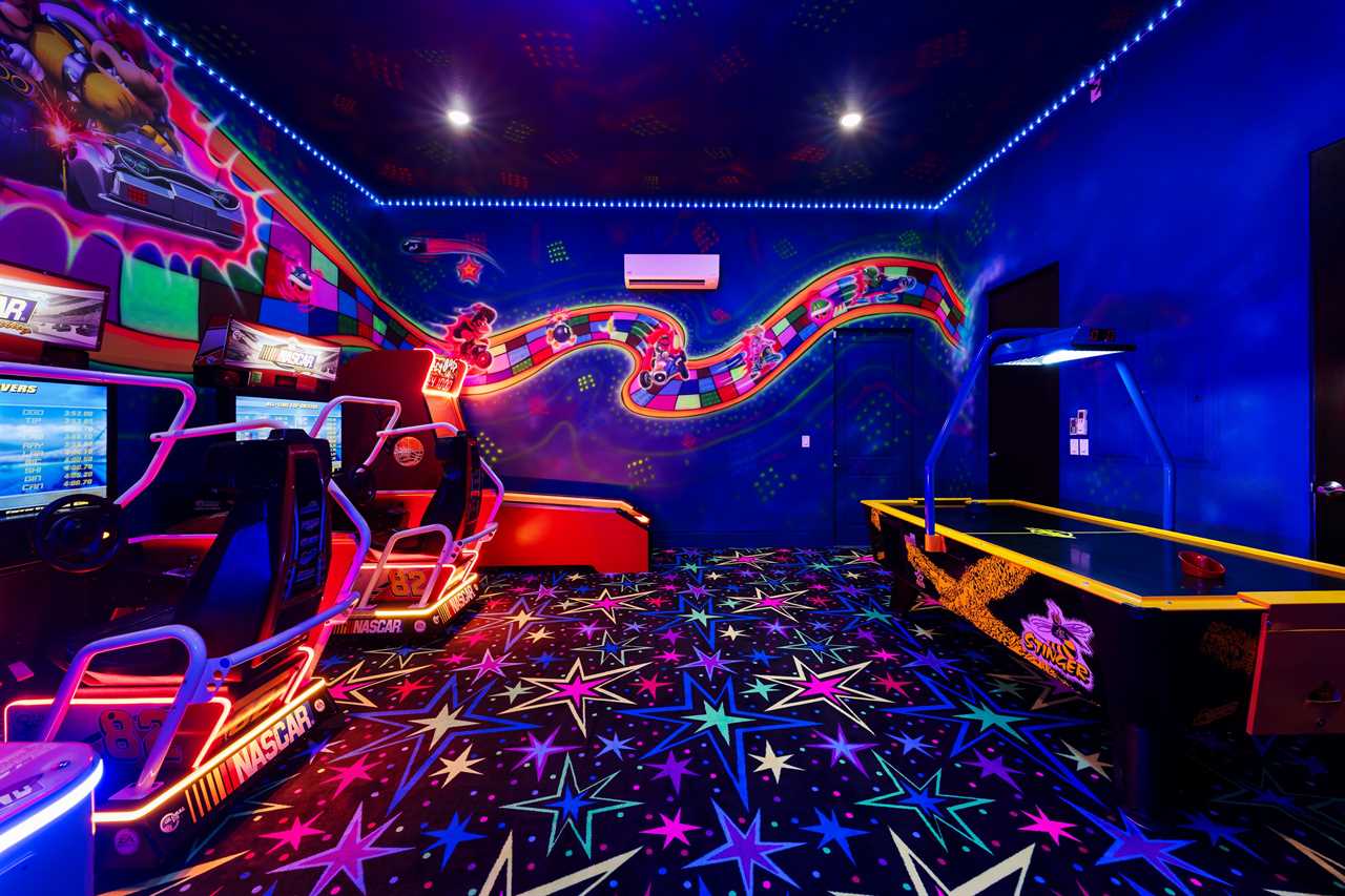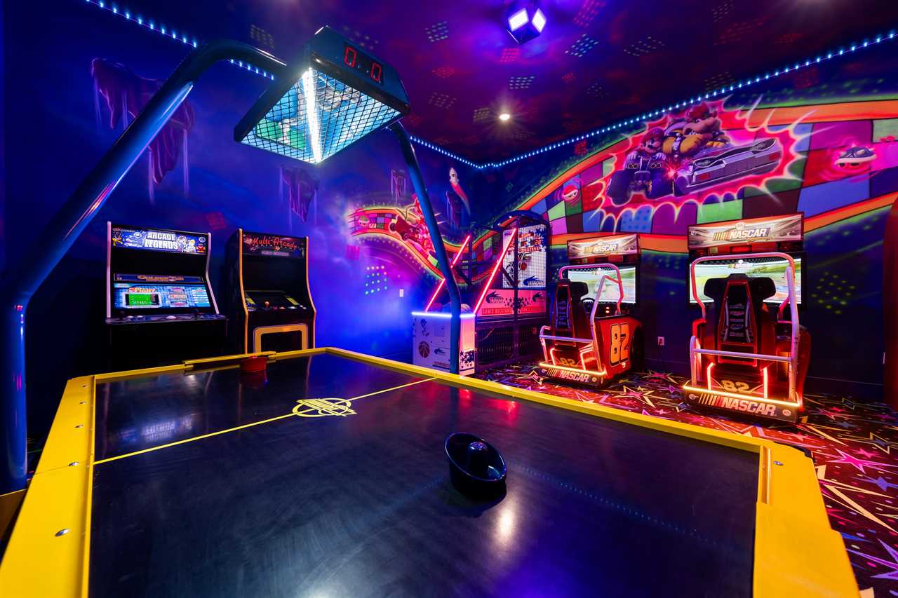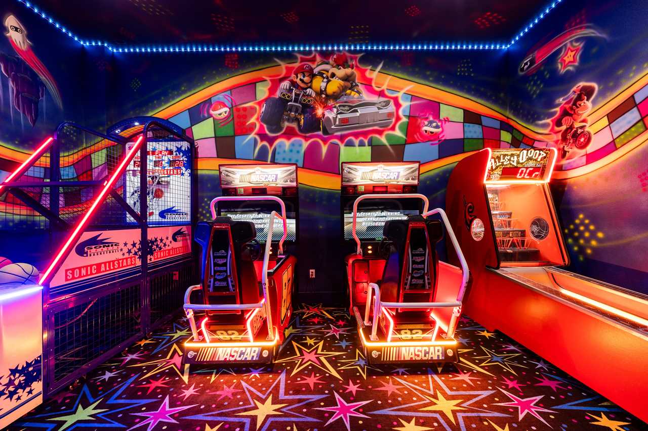 Step into the game room and experience a full arcade atmosphere brought to life with LED lighting and custom decor. From NASCAR racing arcades and Sonic All Stars basketball to air hockey, Alley Hoop streetball, and Mario Kart-inspired details, there's no shortage of excitement.