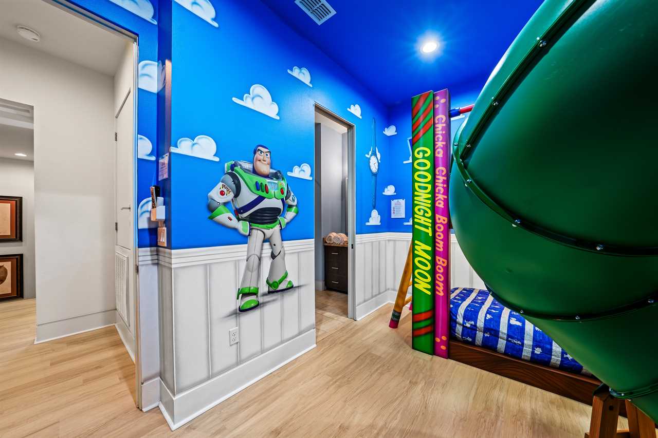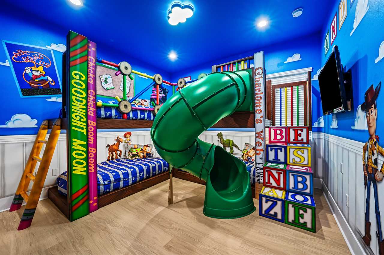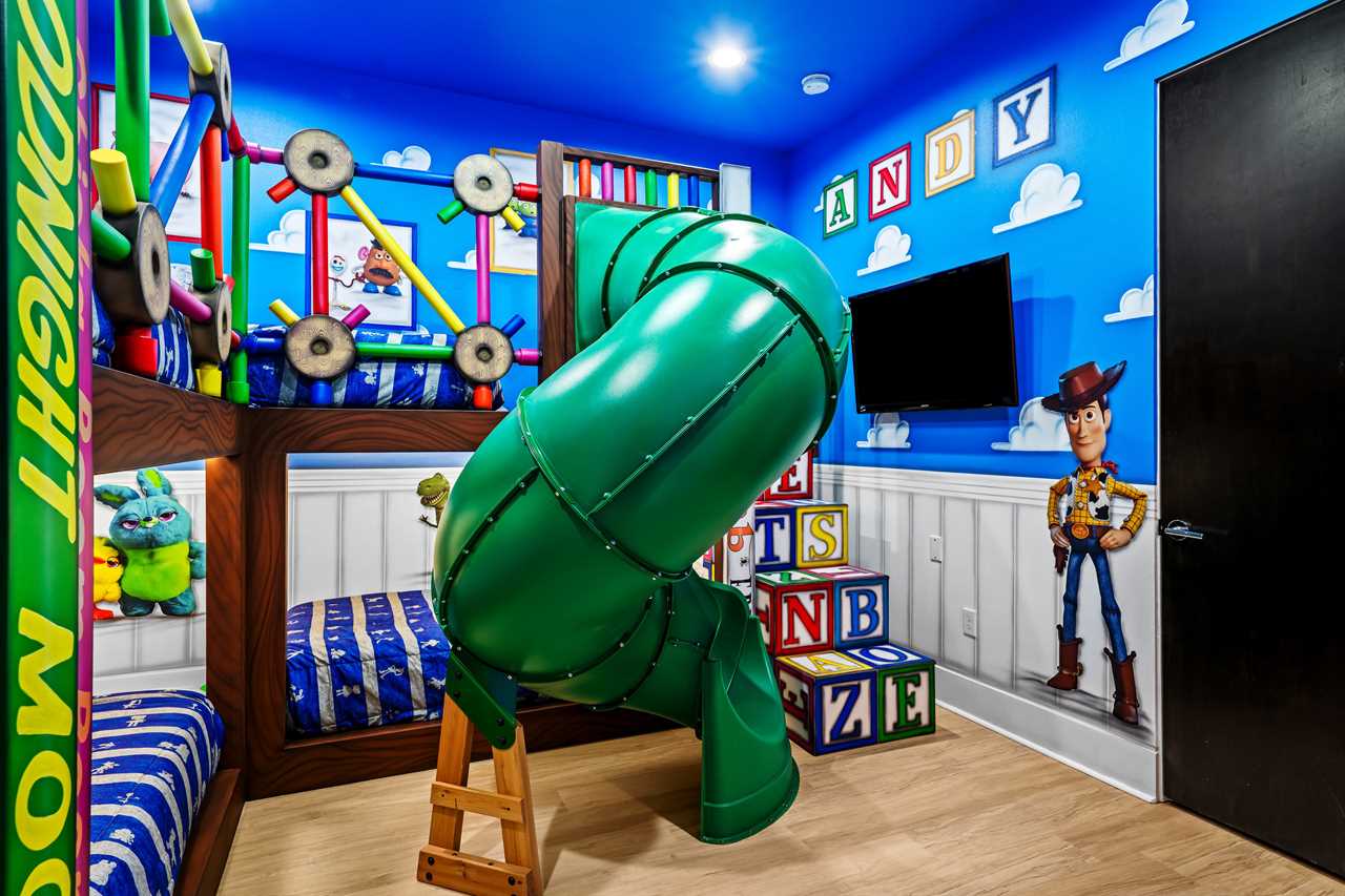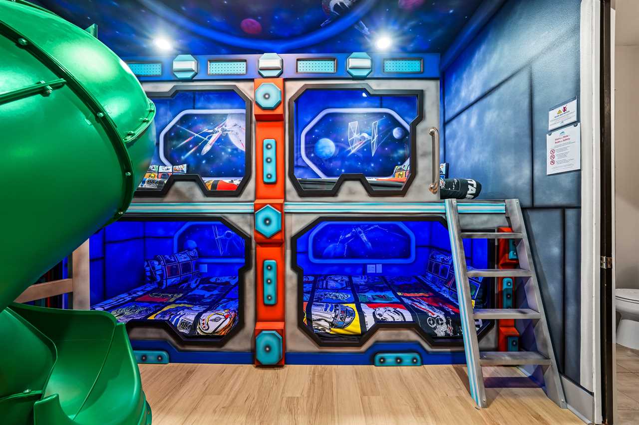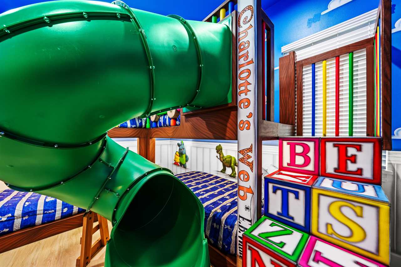 Nine thoughtfully appointed bedrooms ensure space and privacy for everyone. Each king and queen master suite is equipped with a wall-mounted smart TV and an en-suite bathroom, with several featuring luxurious tubs, double showers, or serene seating areas. The younger guests will love the custom-built bunk rooms—one with four queen beds, a swirling slide, and vibrant painted walls, and another with a toy-themed design and four twin beds, also with a swirling slide.