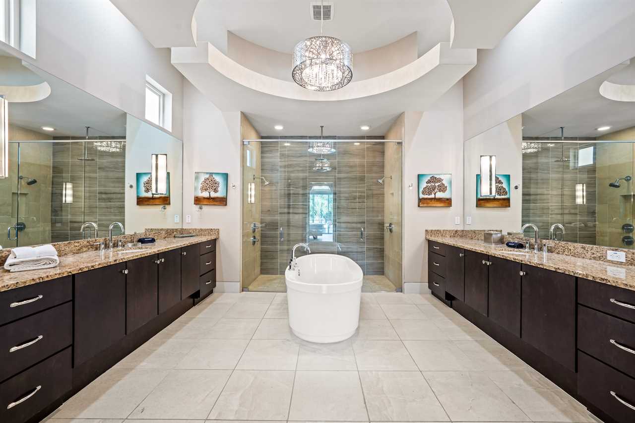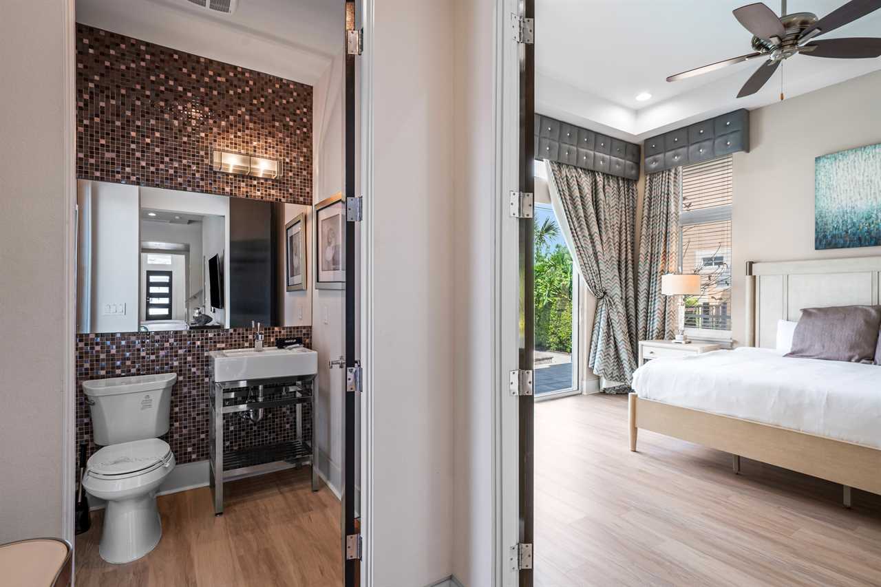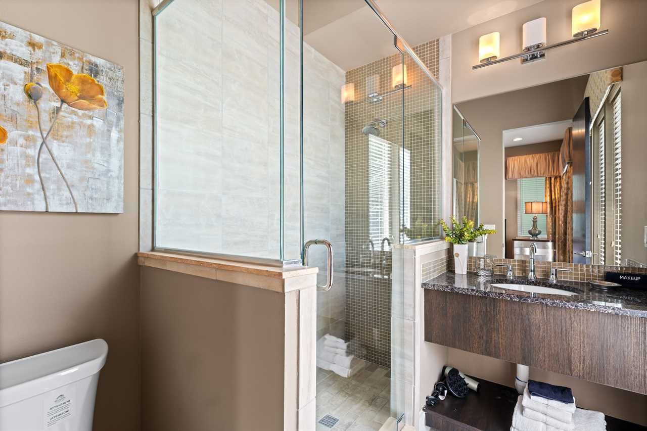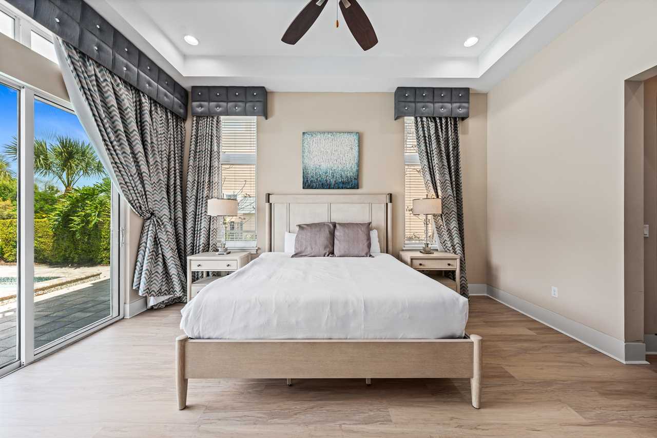 Nine thoughtfully appointed bedrooms ensure space and privacy for everyone. Each king and queen master suite is equipped with a wall-mounted smart TV and an en-suite bathroom, with several featuring luxurious tubs, double showers, or serene seating areas. The younger guests will love the custom-built bunk rooms—one with four queen beds, a swirling slide, and vibrant painted walls, and another with a toy-themed design and four twin beds, also with a swirling slide.