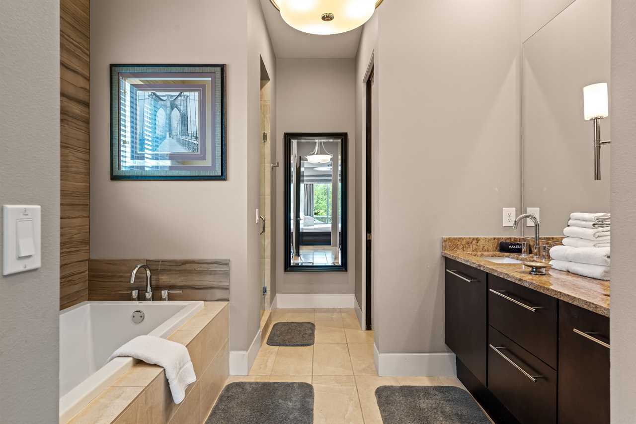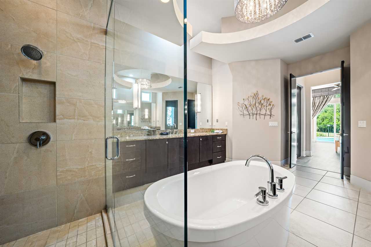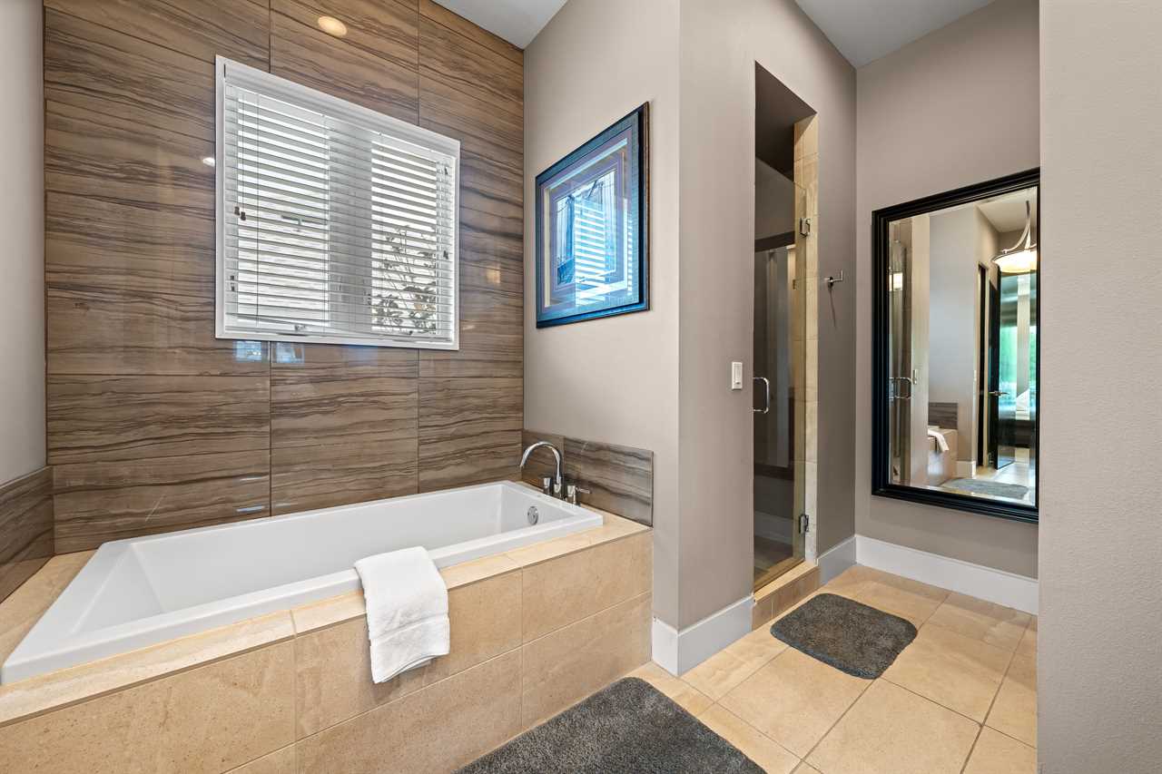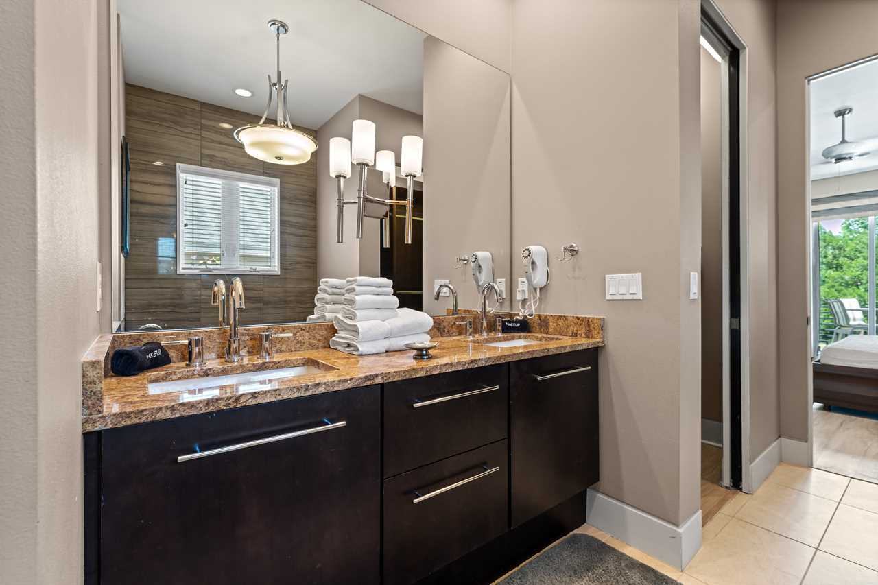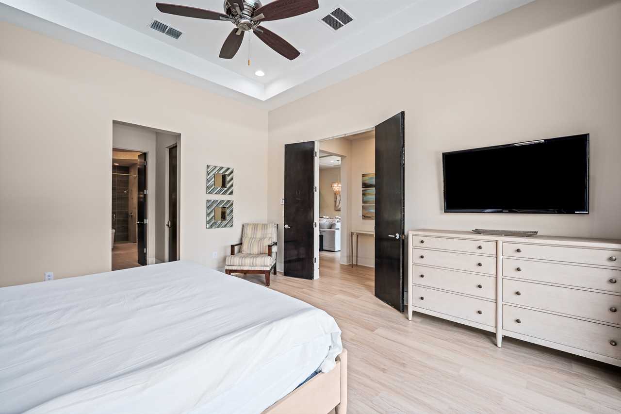 Nine thoughtfully appointed bedrooms ensure space and privacy for everyone. Each king and queen master suite is equipped with a wall-mounted smart TV and an en-suite bathroom, with several featuring luxurious tubs, double showers, or serene seating areas. The younger guests will love the custom-built bunk rooms—one with four queen beds, a swirling slide, and vibrant painted walls, and another with a toy-themed design and four twin beds, also with a swirling slide.