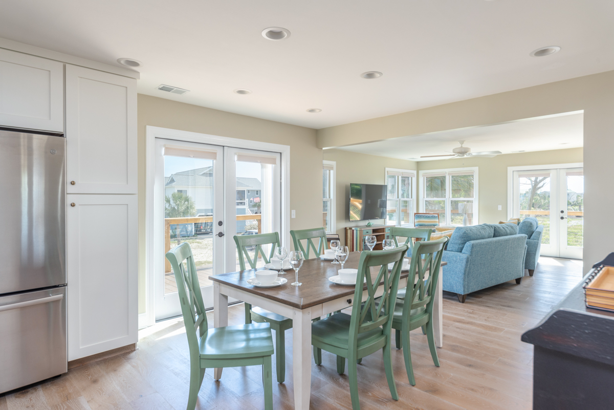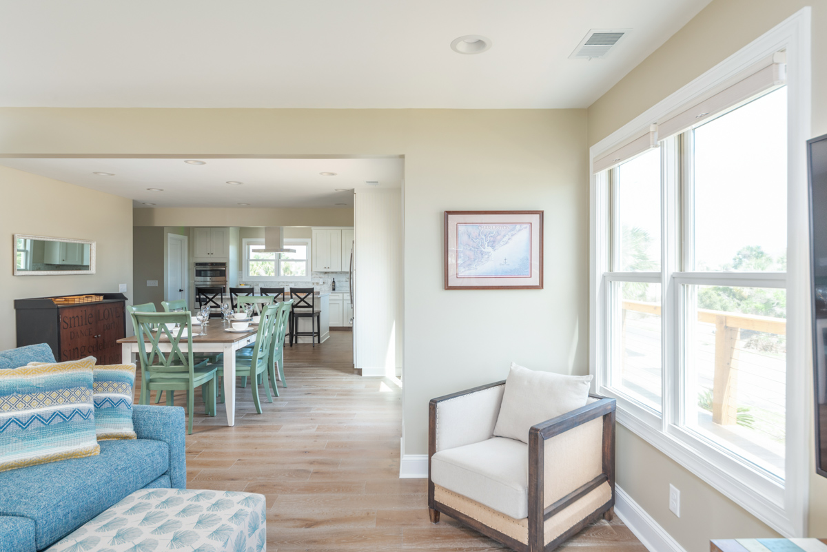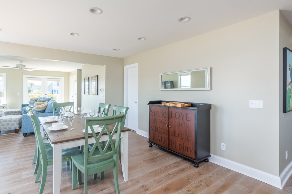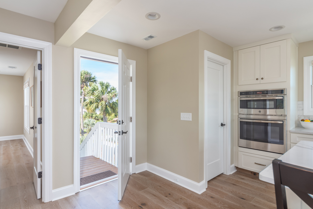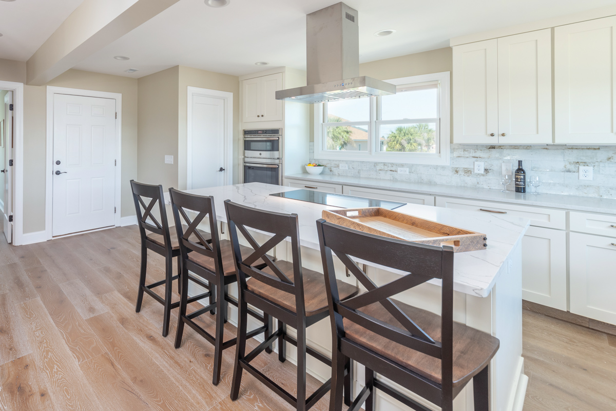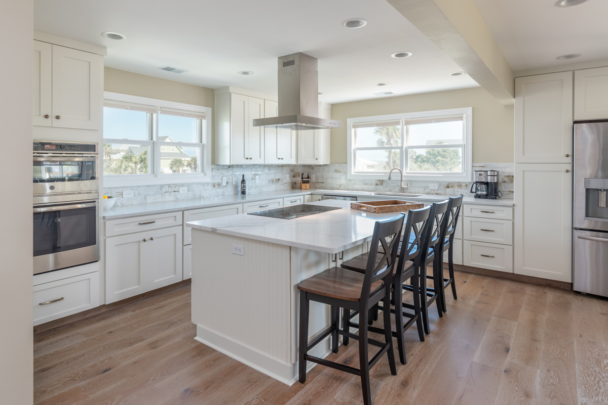 The lovely main floor living and dining area are wide open, allowing for the natural South Carolina sunshine to flood the space. A tasteful, neutral color palette enhances the views of the swaying palm trees and the ocean beyond. The spacious kitchen features crisp white shaker cabinets, gleaming stainless steel appliances, and a large granite-topped island with an industrial vent hood and bar seating for four. A farmhouse-style dining table has seating for six more. Spend some quiet time here in the mornings sipping cups of fresh coffee as the sun rises over the ocean.