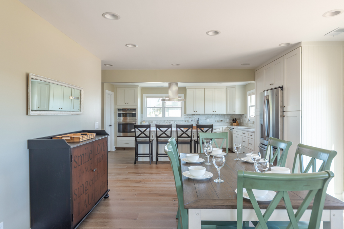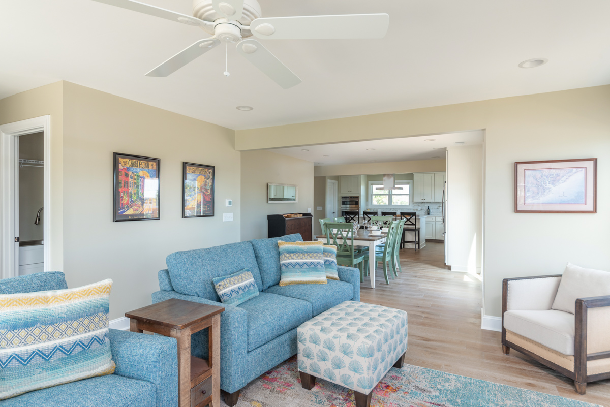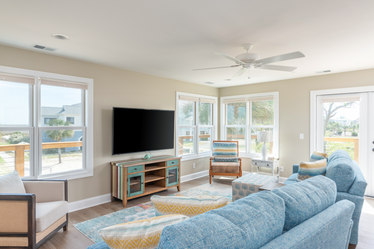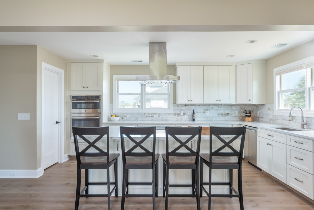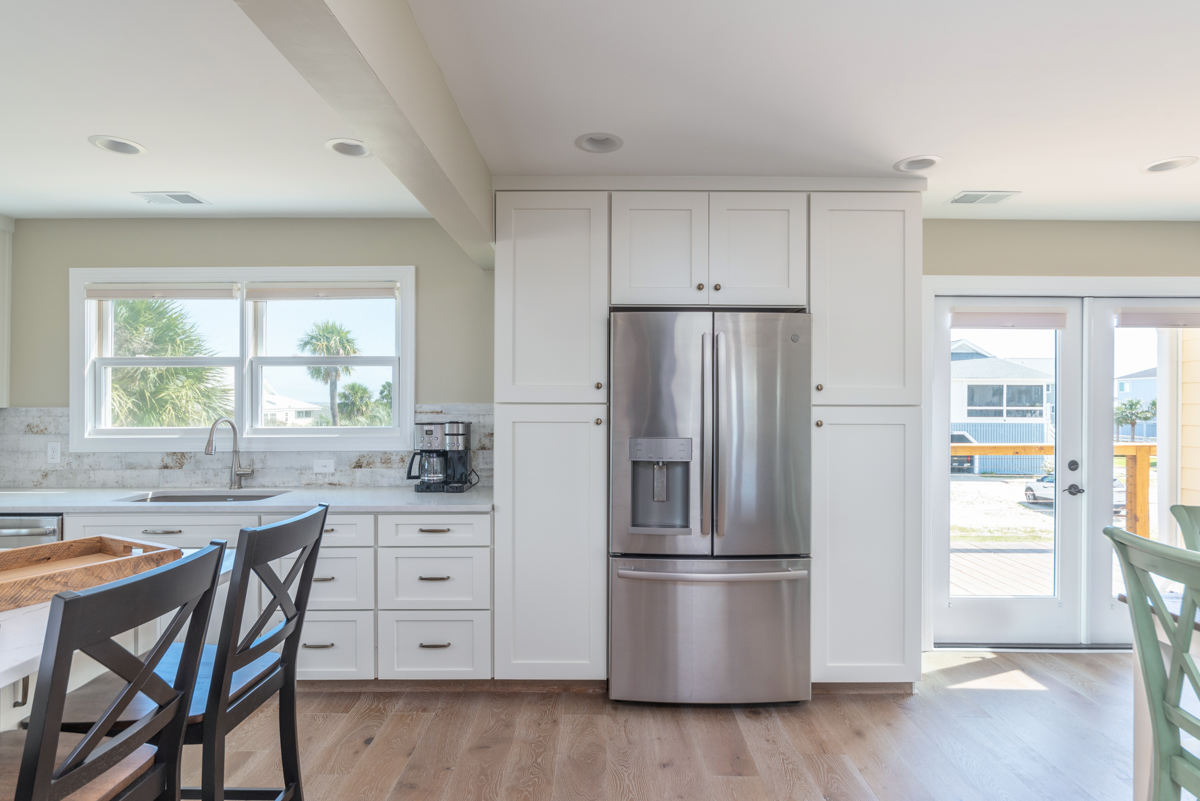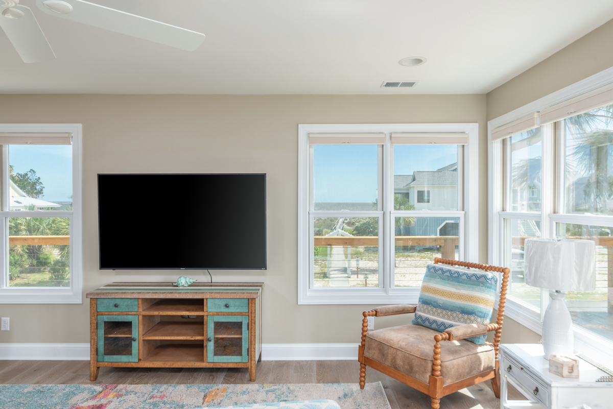 The lovely main floor living and dining area are wide open, allowing for the natural South Carolina sunshine to flood the space. A tasteful, neutral color palette enhances the views of the swaying palm trees and the ocean beyond. The spacious kitchen features crisp white shaker cabinets, gleaming stainless steel appliances, and a large granite-topped island with an industrial vent hood and bar seating for four. A farmhouse-style dining table has seating for six more. Spend some quiet time here in the mornings sipping cups of fresh coffee as the sun rises over the ocean.