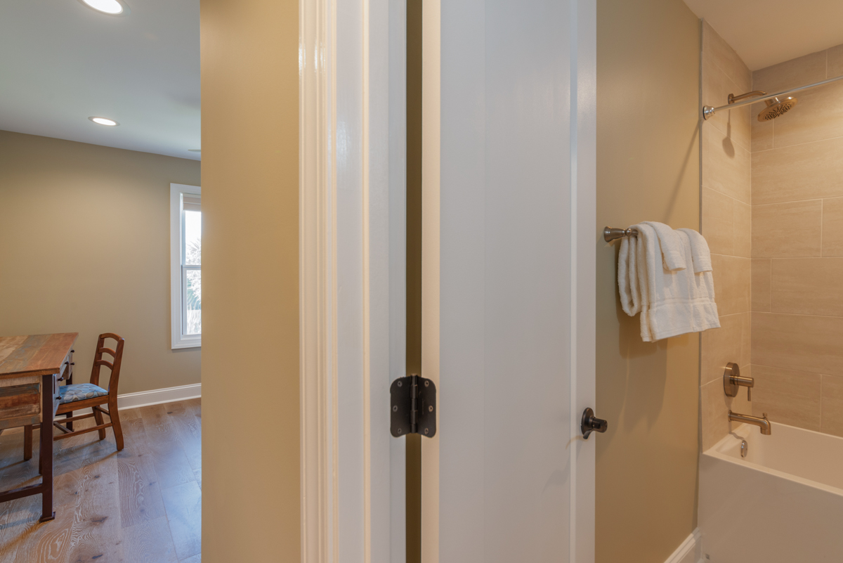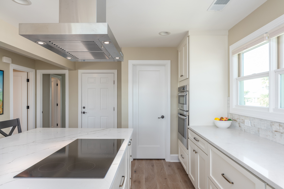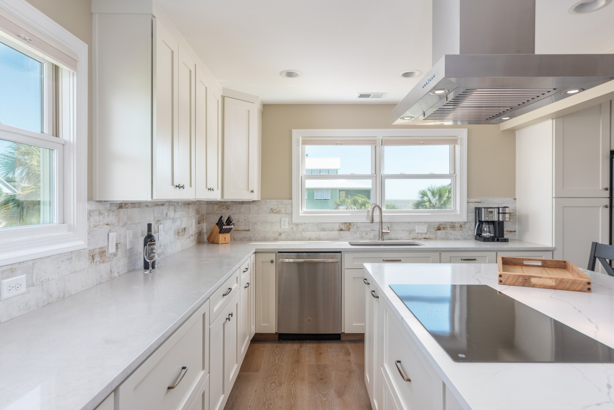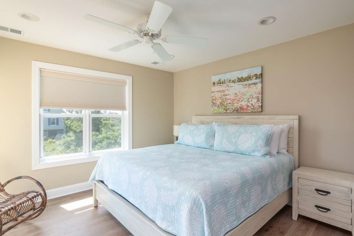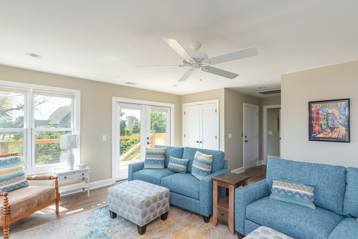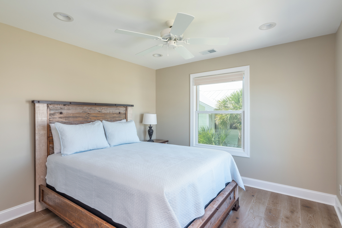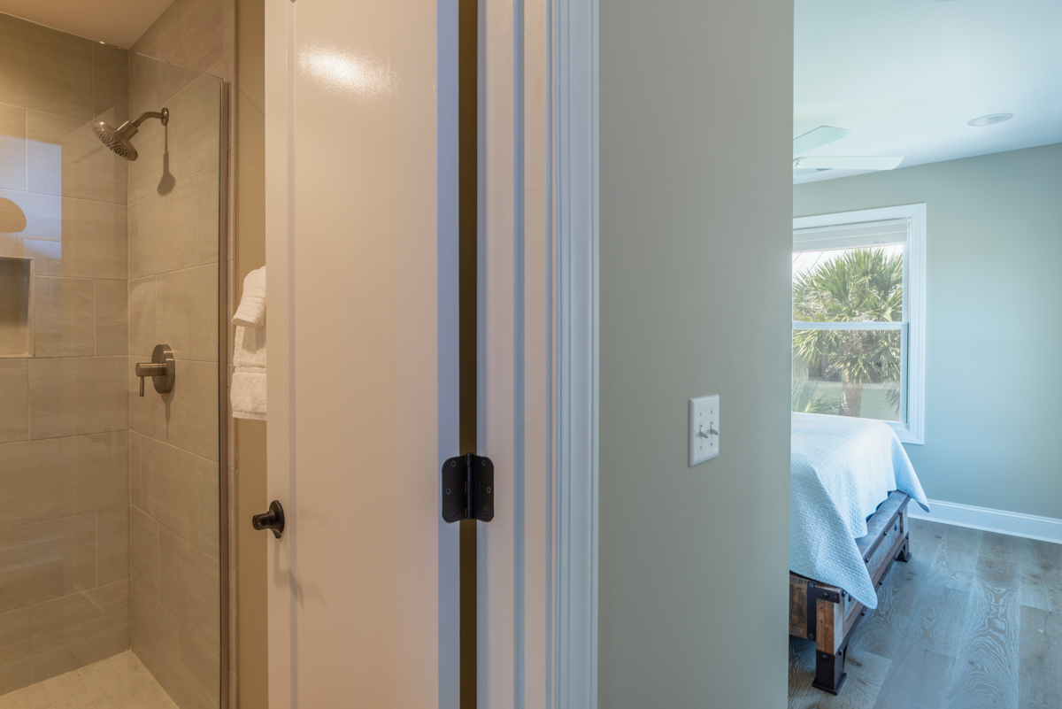 The lovely main floor living and dining area are wide open, allowing for the natural South Carolina sunshine to flood the space. A tasteful, neutral color palette enhances the views of the swaying palm trees and the ocean beyond. The spacious kitchen features crisp white shaker cabinets, gleaming stainless steel appliances, and a large granite-topped island with an industrial vent hood and bar seating for four. A farmhouse-style dining table has seating for six more. Spend some quiet time here in the mornings sipping cups of fresh coffee as the sun rises over the ocean.