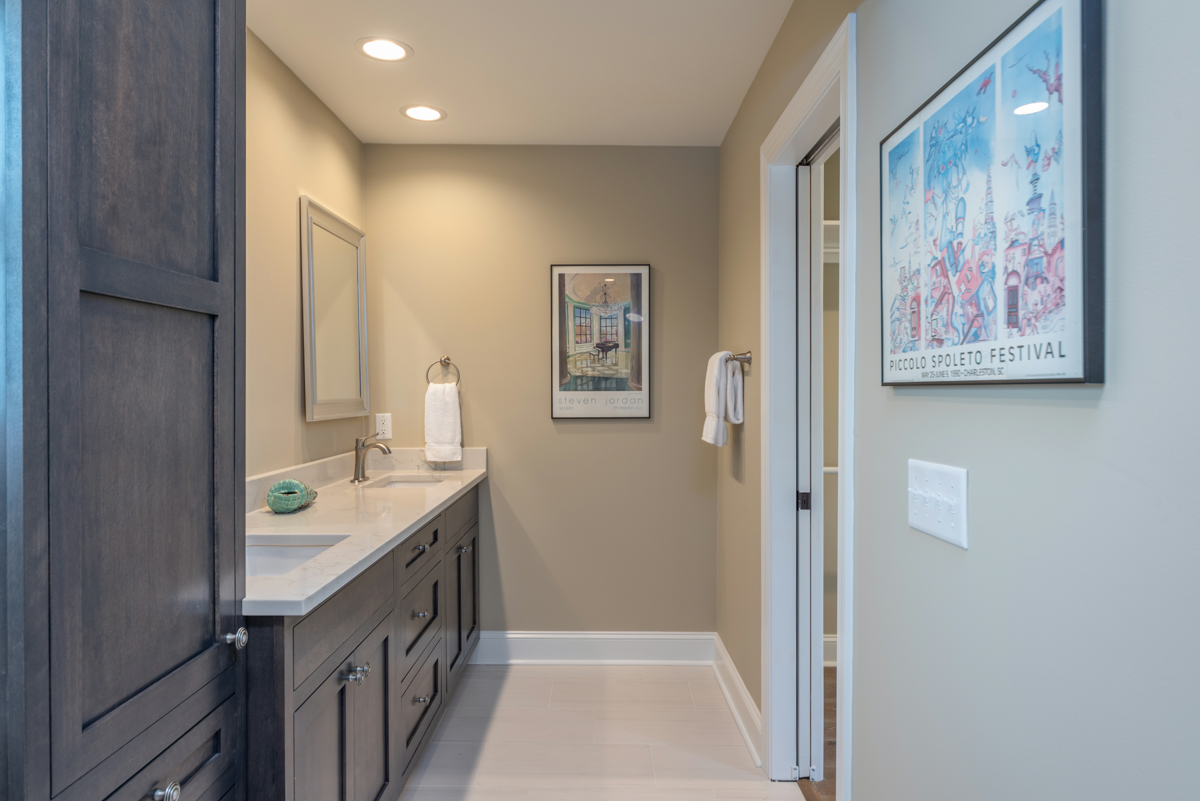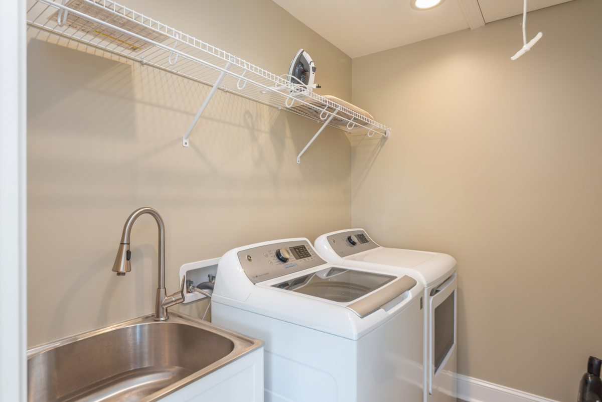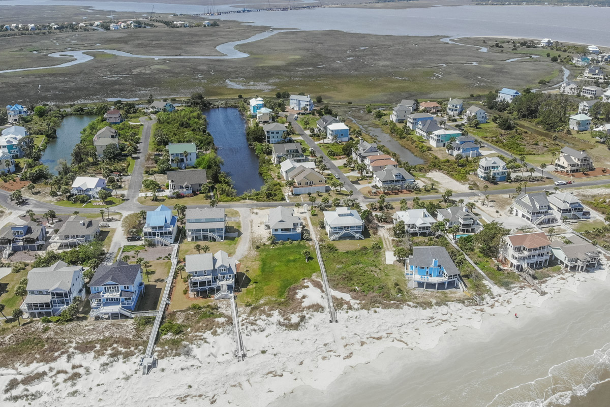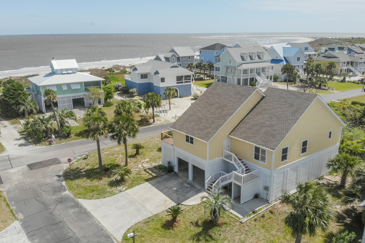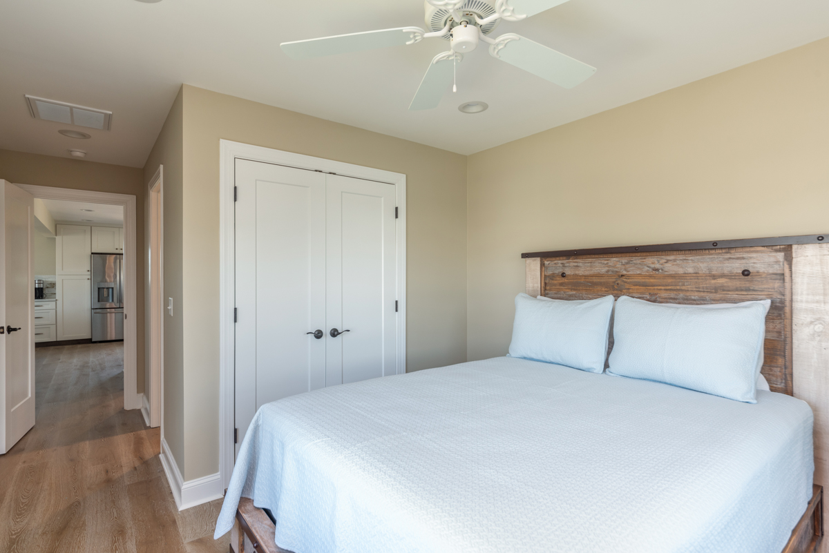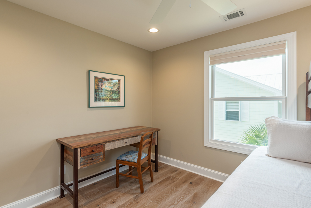 The lovely main floor living and dining area are wide open, allowing for the natural South Carolina sunshine to flood the space. A tasteful, neutral color palette enhances the views of the swaying palm trees and the ocean beyond. The spacious kitchen features crisp white shaker cabinets, gleaming stainless steel appliances, and a large granite-topped island with an industrial vent hood and bar seating for four. A farmhouse-style dining table has seating for six more. Spend some quiet time here in the mornings sipping cups of fresh coffee as the sun rises over the ocean.