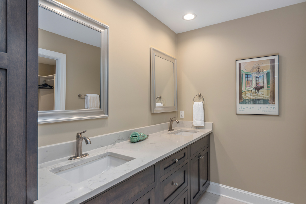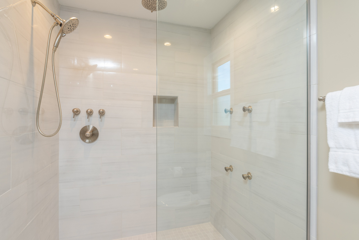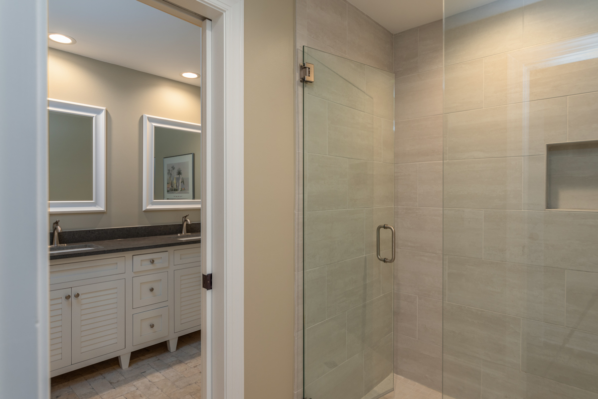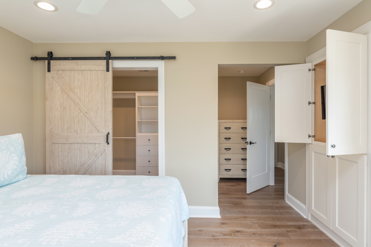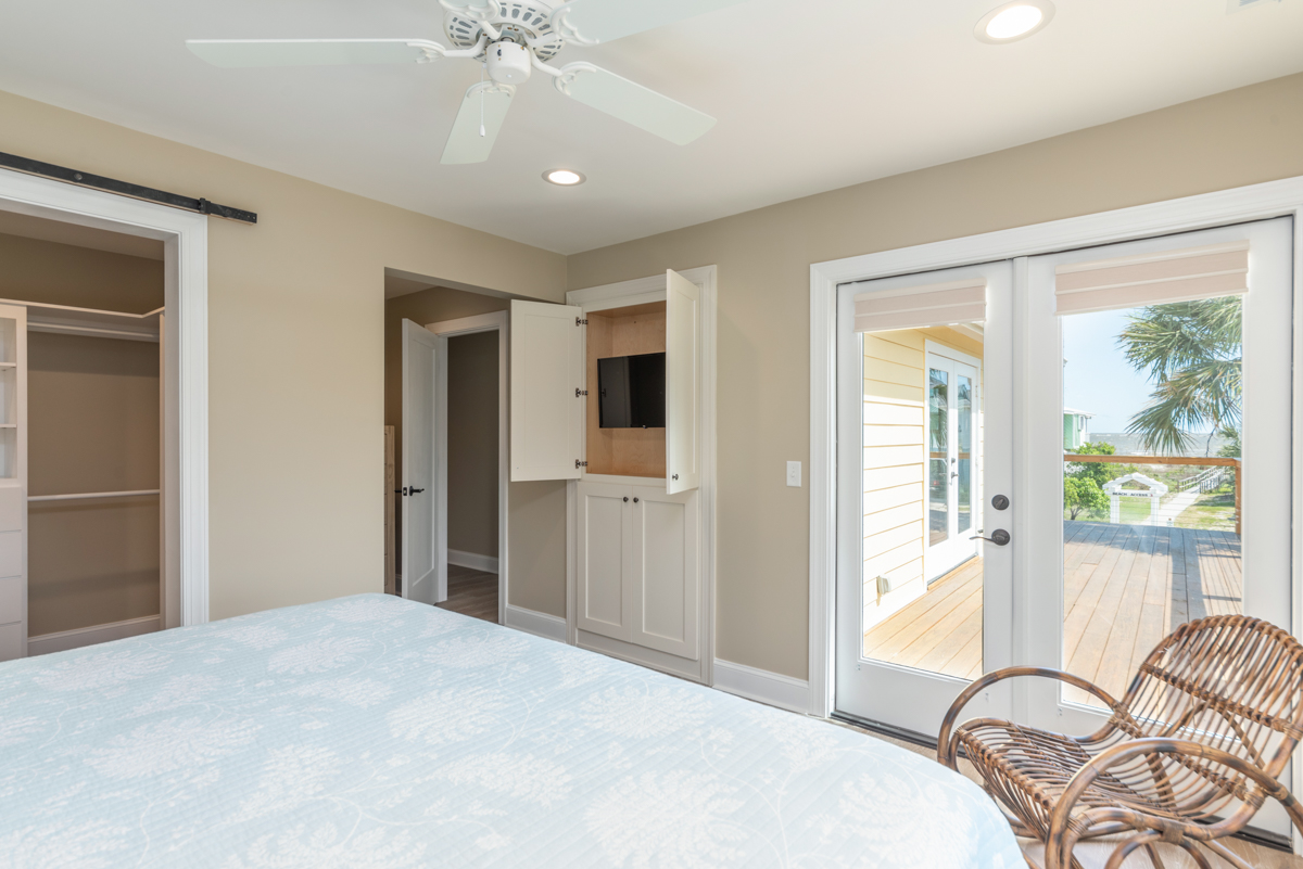 A king-sized bed faces French doors that lead out to the sun-drenched main deck. The primary suite also has a large walk-in closet with a sliding barn door and hidden, wall-mounted flatscreen television. The private en suite bathroom has dual sinks and a spa-like, glass-enclosed shower with multiple showerheads.