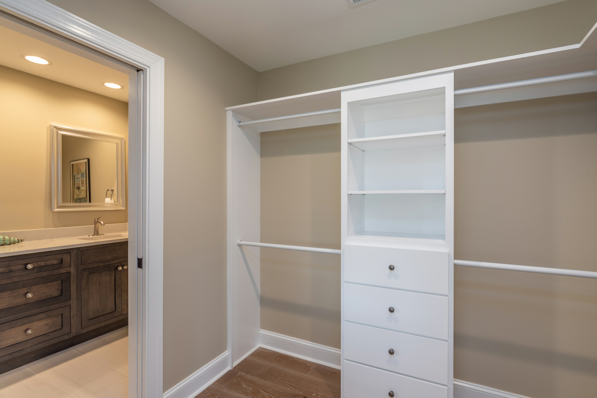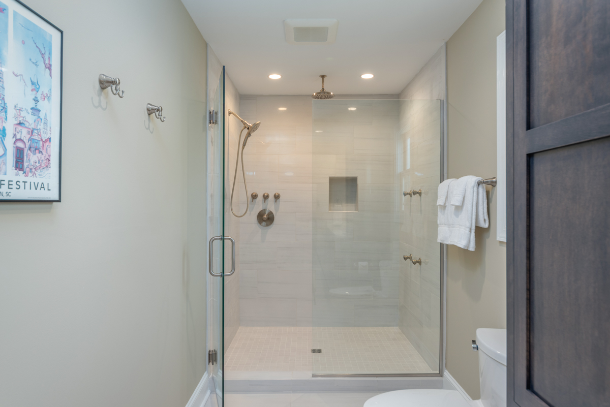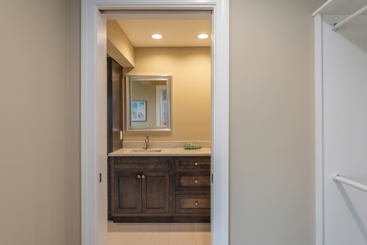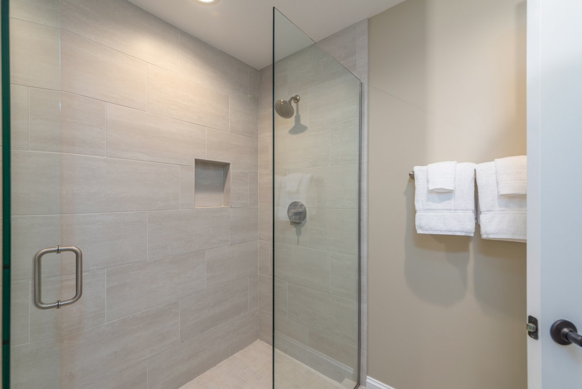 Here you'll find a queen-sized bed and a bathroom with a walk-in shower that can be accessed via a pocket door.