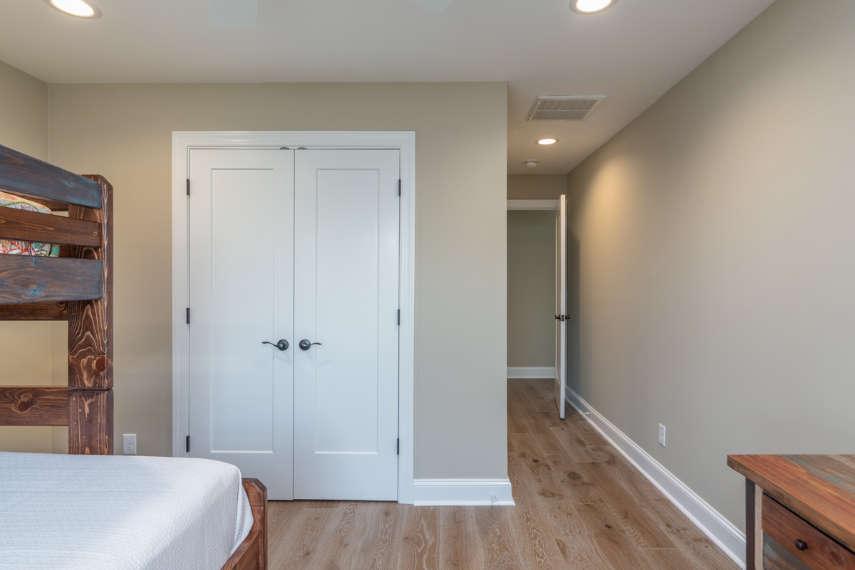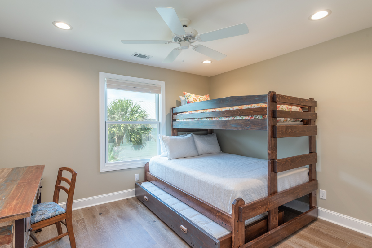 This charming room features a bunk bed with a queen-sized bed below, a twin-sized bed on top, and a twin-sized trundle bed. This room also has a small writing desk and a convenient en suite bathroom with a shower/bath combo.