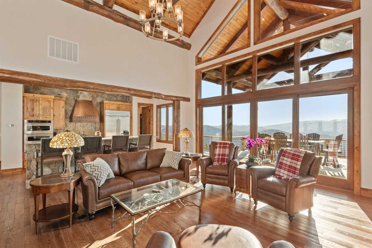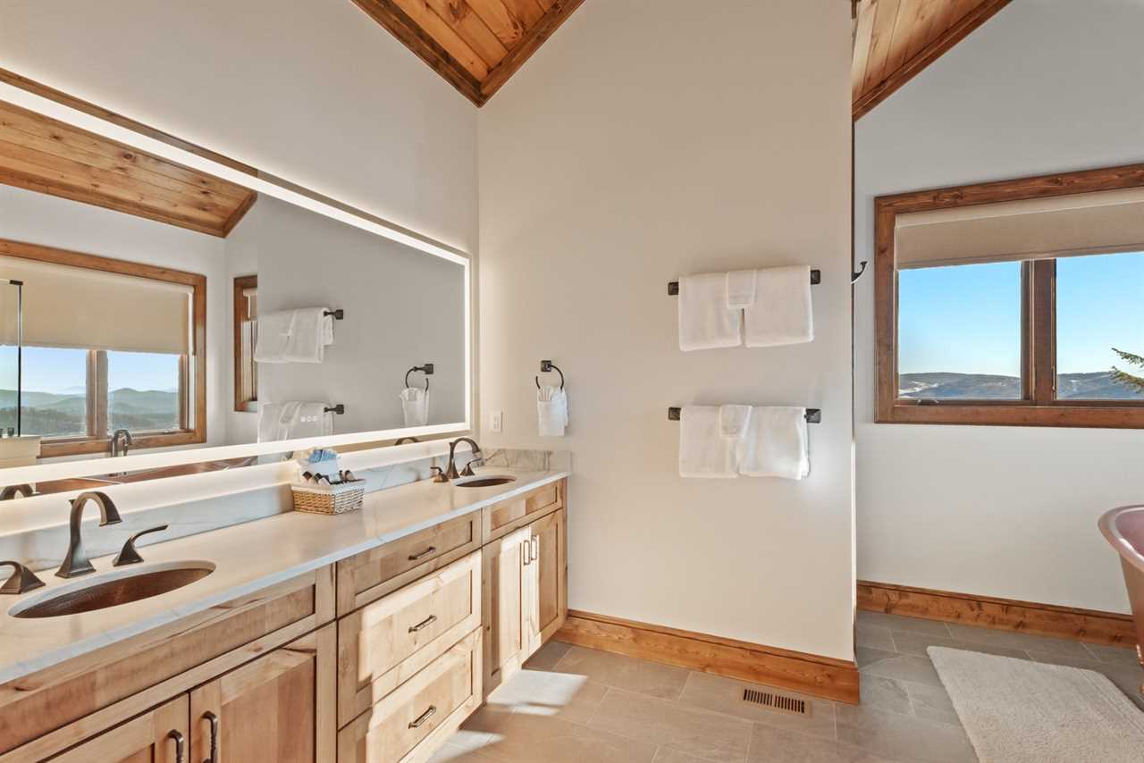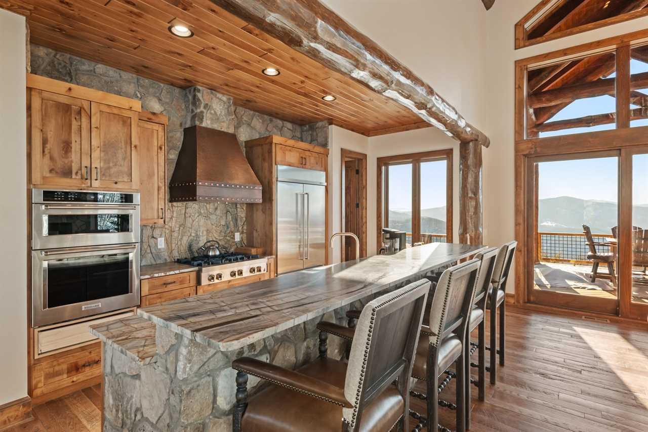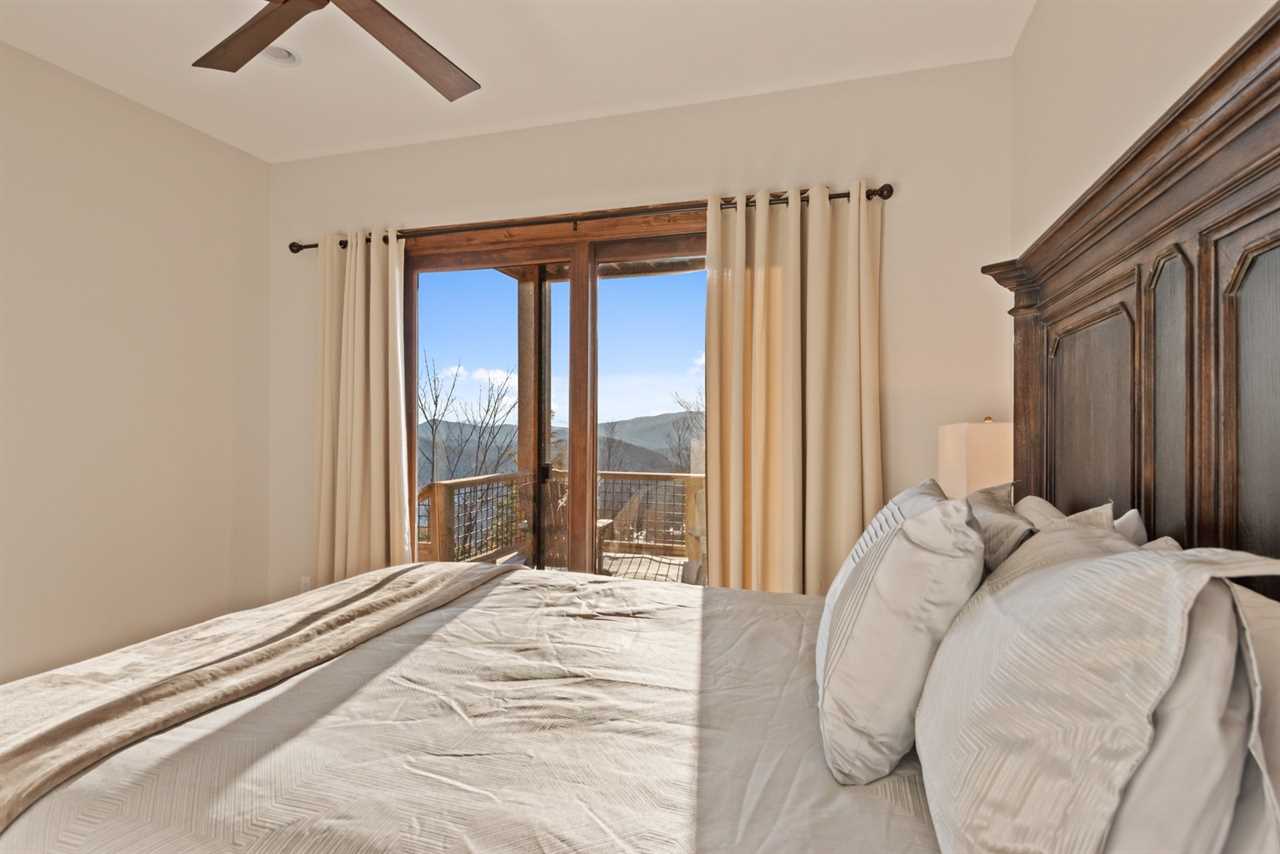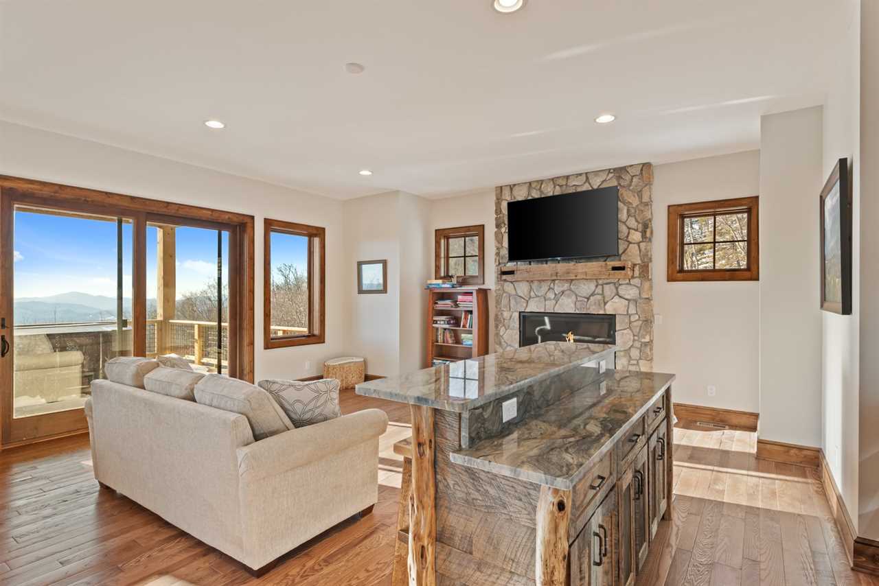Enjoy the convenience of the spacious two-car garage while staying at Eagle Ridge. With just two steps leading into the main level, you'll enter an open-concept kitchen and great room. The dining table seats ten guests, while the granite bar provides four additional seats. Gather around the gas log fireplace or settle in for a movie on the flatscreen TV mounted above the mantle. Step outside to the covered section of the main-level deck and dine al fresco with stunning long-range mountain views. The primary king ensuite offers private access to the main deck and features a walk-in closet, double granite vanity, lighted mirror, copper soaking tub, and a tiled shower with both a waterfall showerhead and handheld wand.