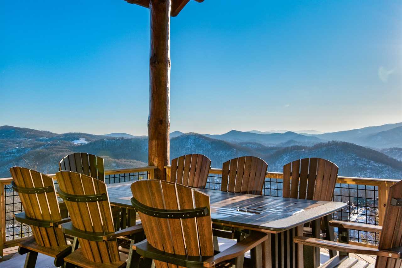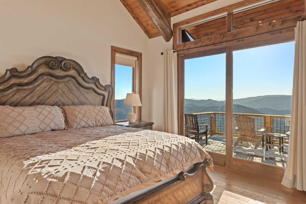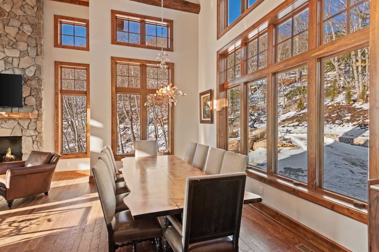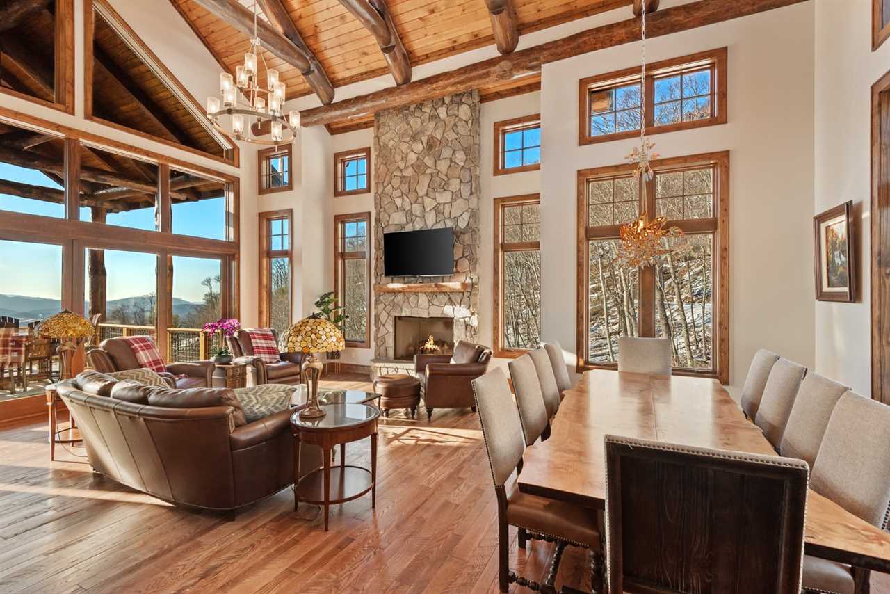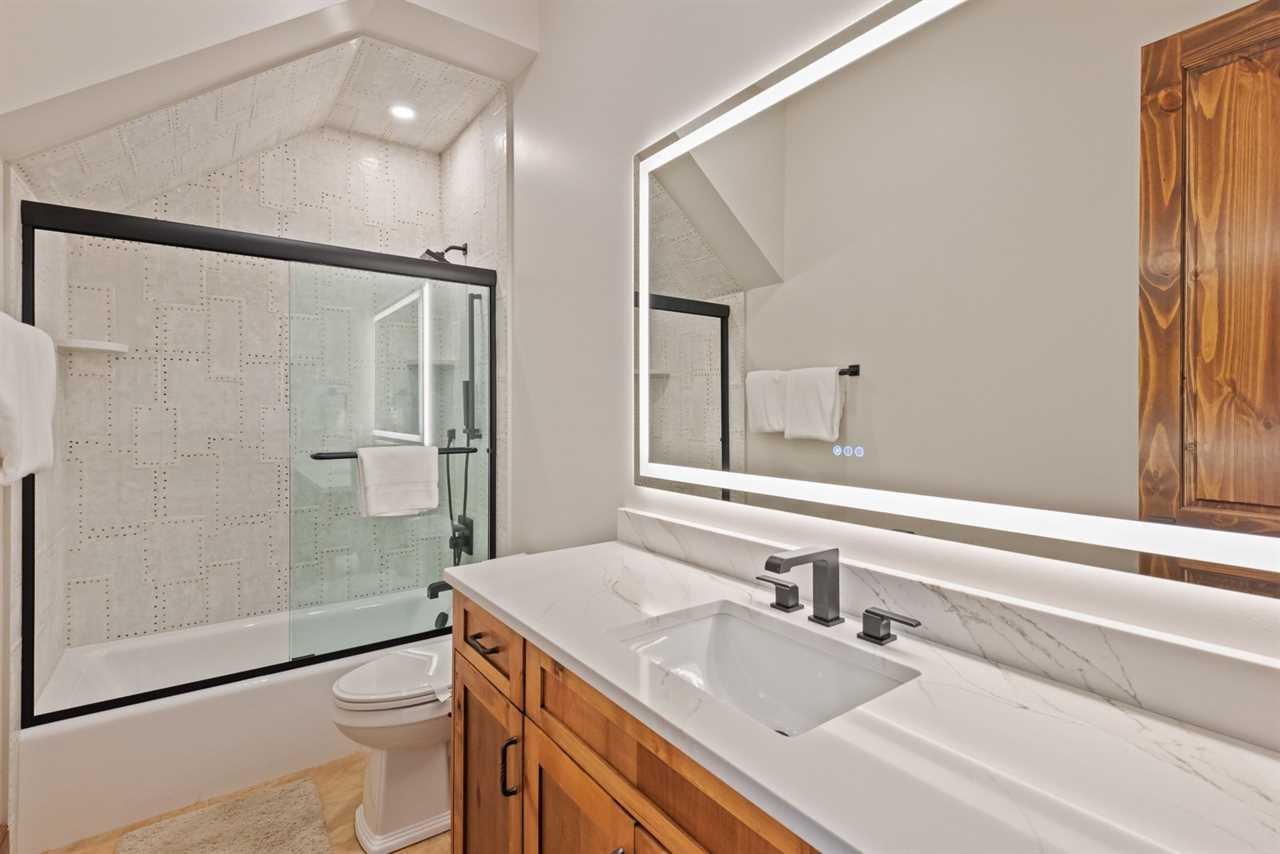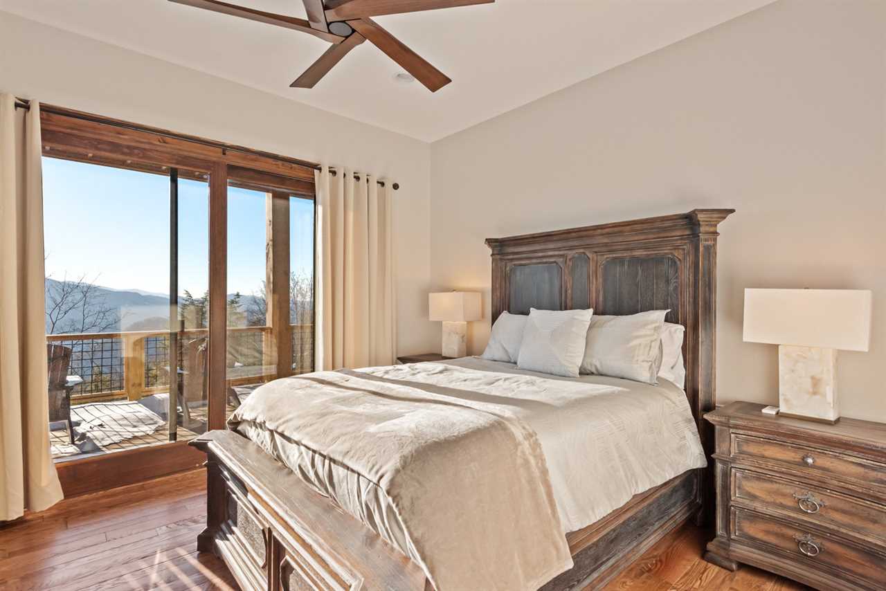 Enjoy the convenience of the spacious two-car garage while staying at Eagle Ridge. With just two steps leading into the main level, you'll enter an open-concept kitchen and great room. The dining table seats ten guests, while the granite bar provides four additional seats. Gather around the gas log fireplace or settle in for a movie on the flatscreen TV mounted above the mantle. Step outside to the covered section of the main-level deck and dine al fresco with stunning long-range mountain views. The primary king ensuite offers private access to the main deck and features a walk-in closet, double granite vanity, lighted mirror, copper soaking tub, and a tiled shower with both a waterfall showerhead and handheld wand.